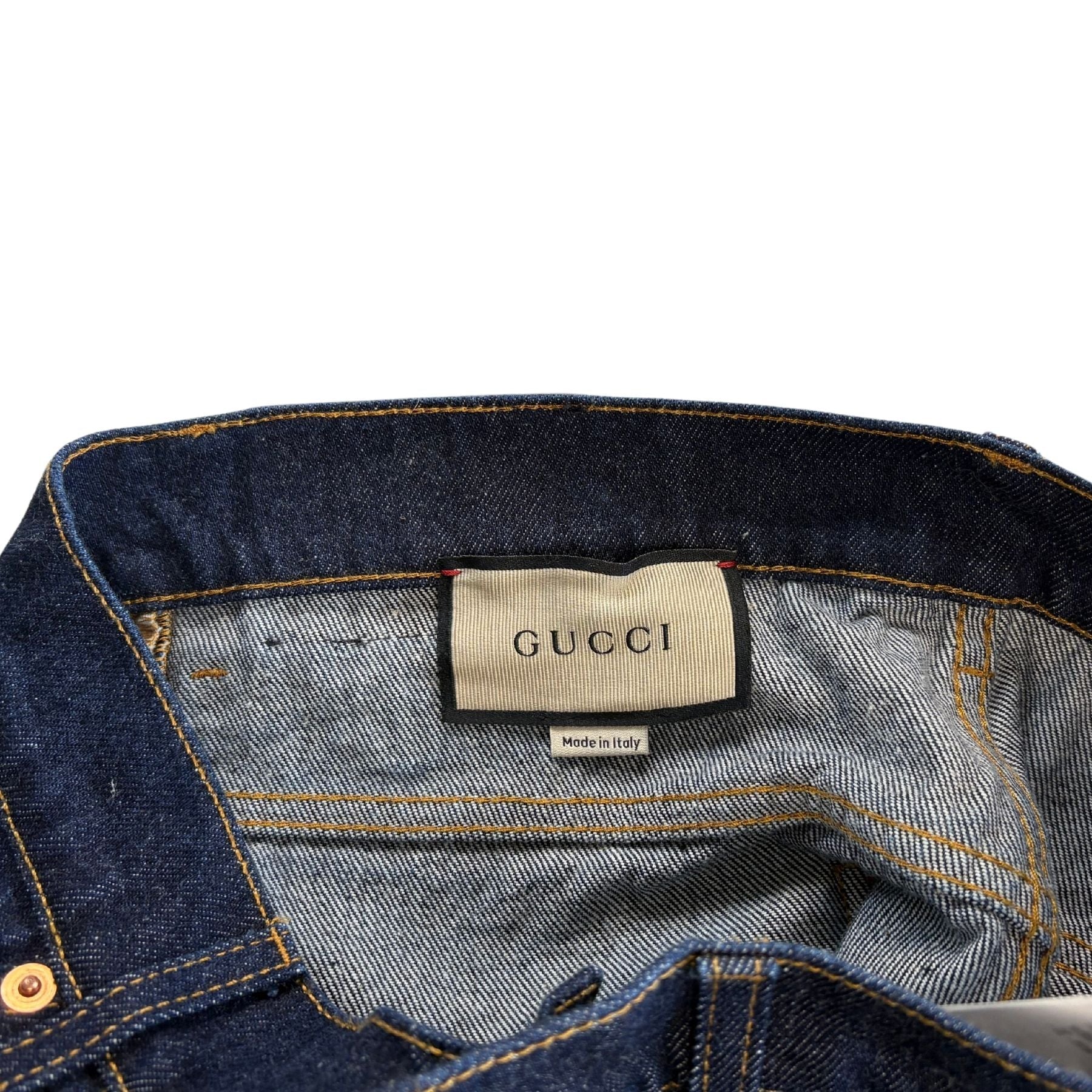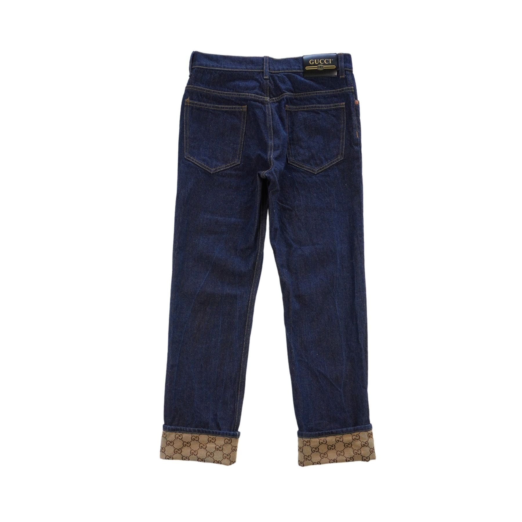 Gucci straight-leg jeans in a dark wash blue denim with a black leather logo patch on the back waistband and beige 'GG' monogram printed cuffs.