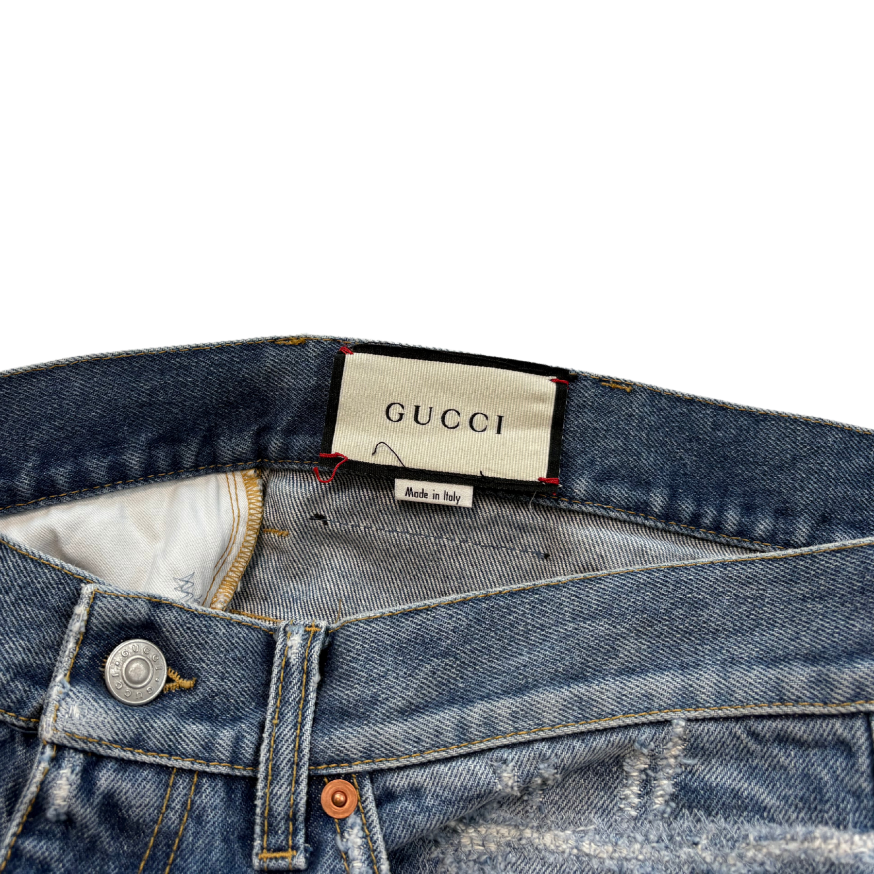 Gucci straight-legged jeans in light-wash denim with all-over distressing and zig-zag embroidery, with a black leather 'Gucci' patch on the back waistband.