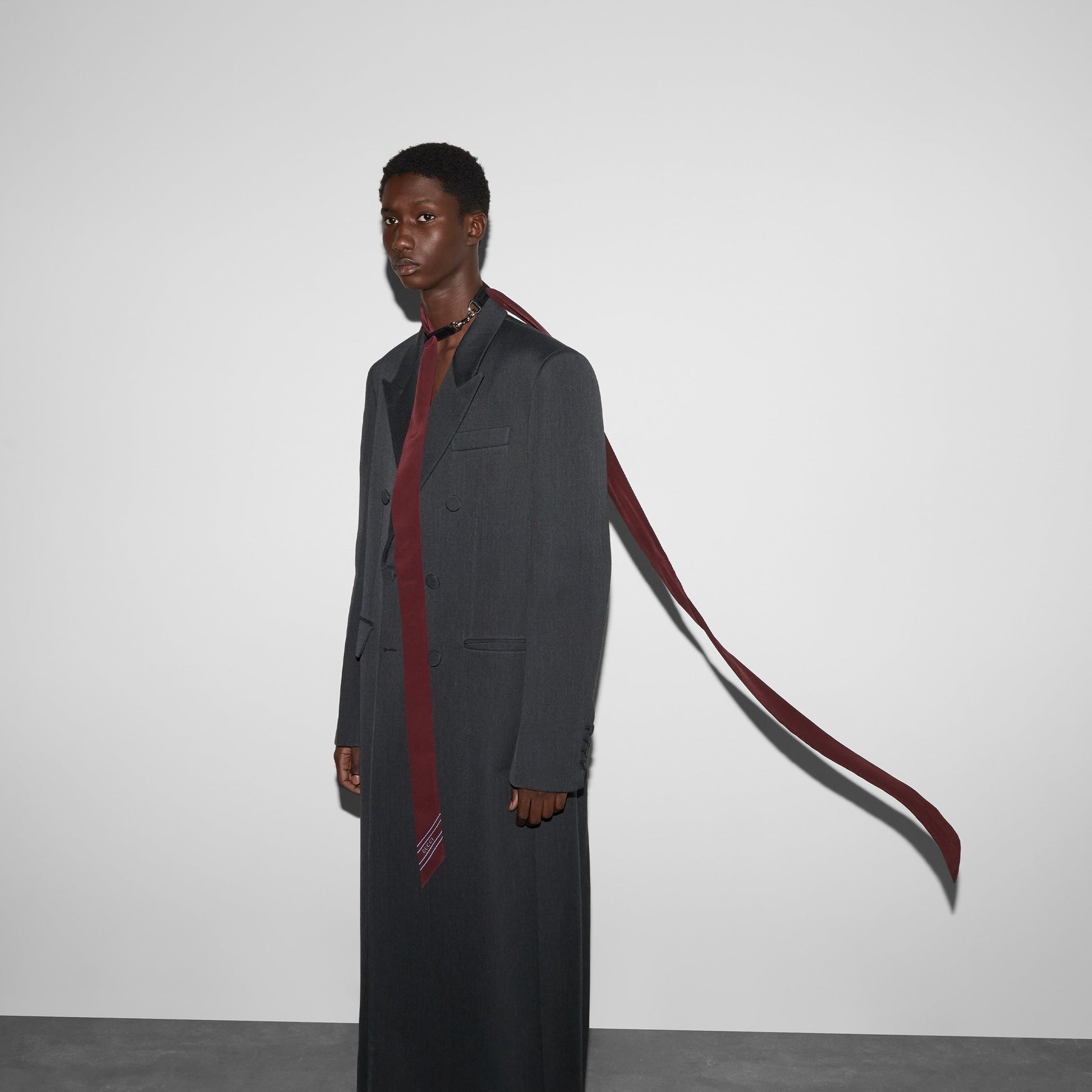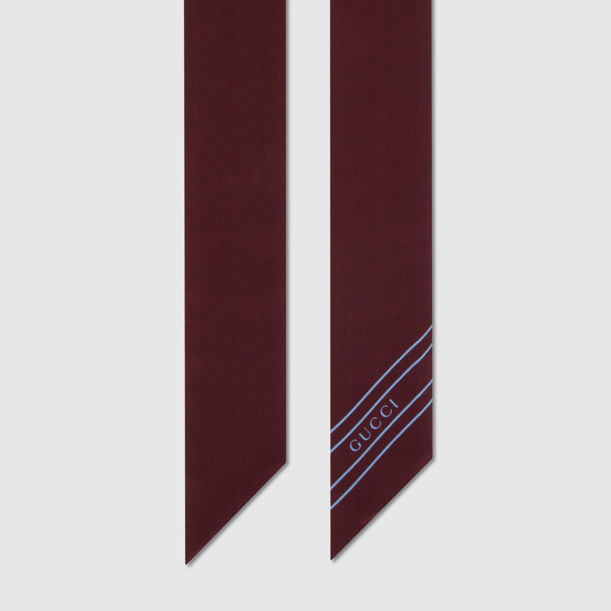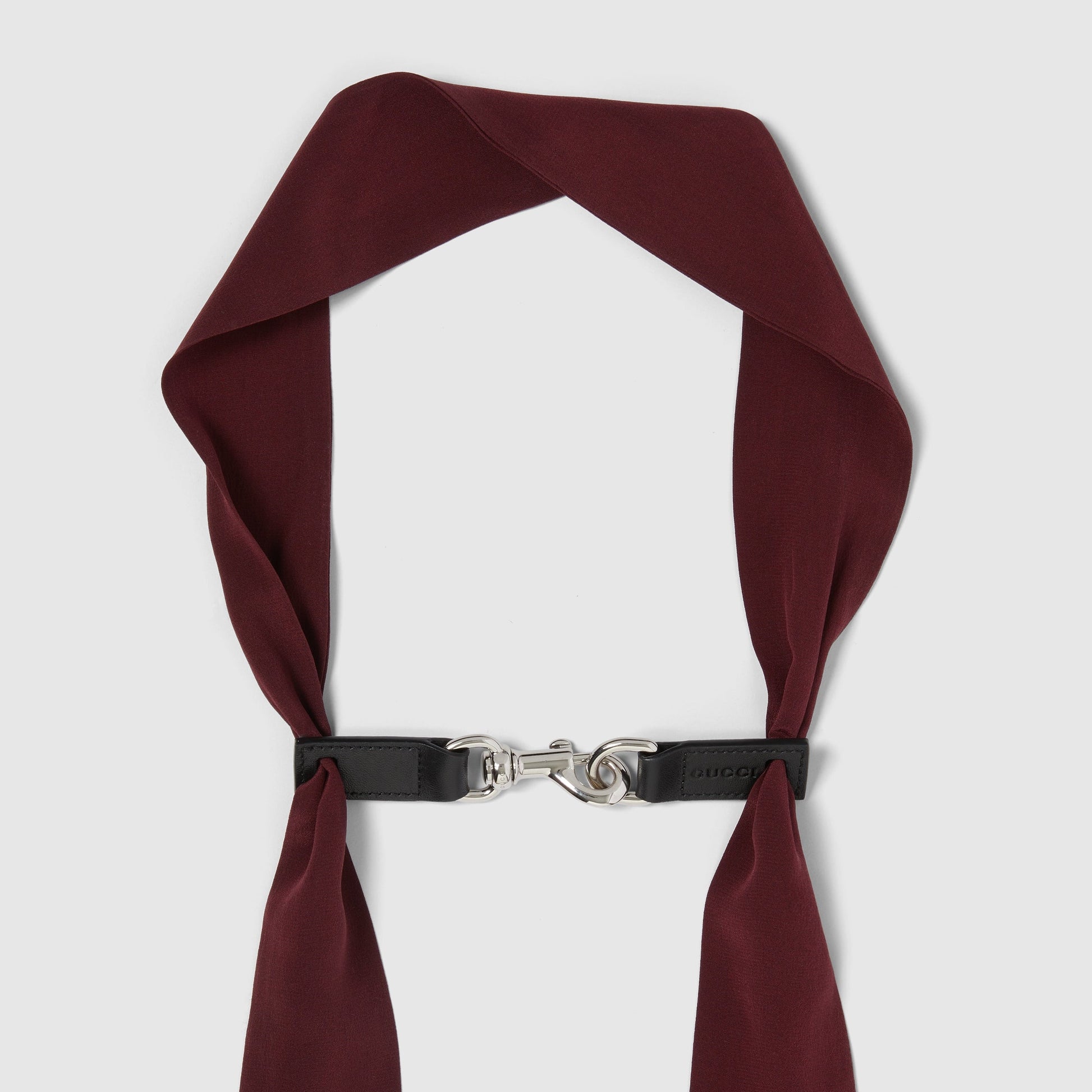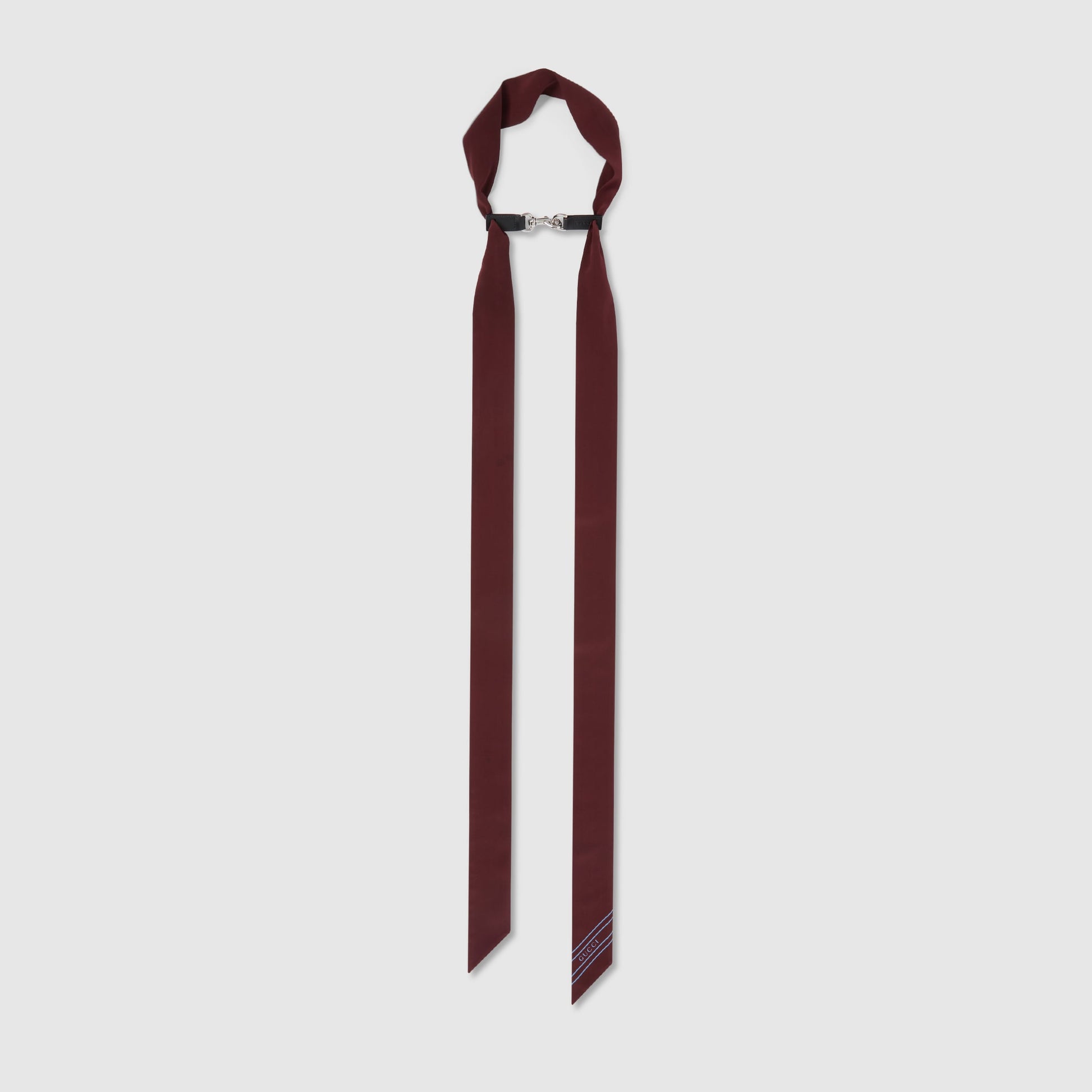 Neck bows were styled as necklaces for the men's Fall Winter 2024 fashion show, denoting a contemporary look with their exaggerated length. Mixing modern design with heritage details, the detachable leather and metal snap hook closure recalls the new Jackie Notte closure. A light blue Gucci stripe print completes this bordeaux silk crêpe accessory.
