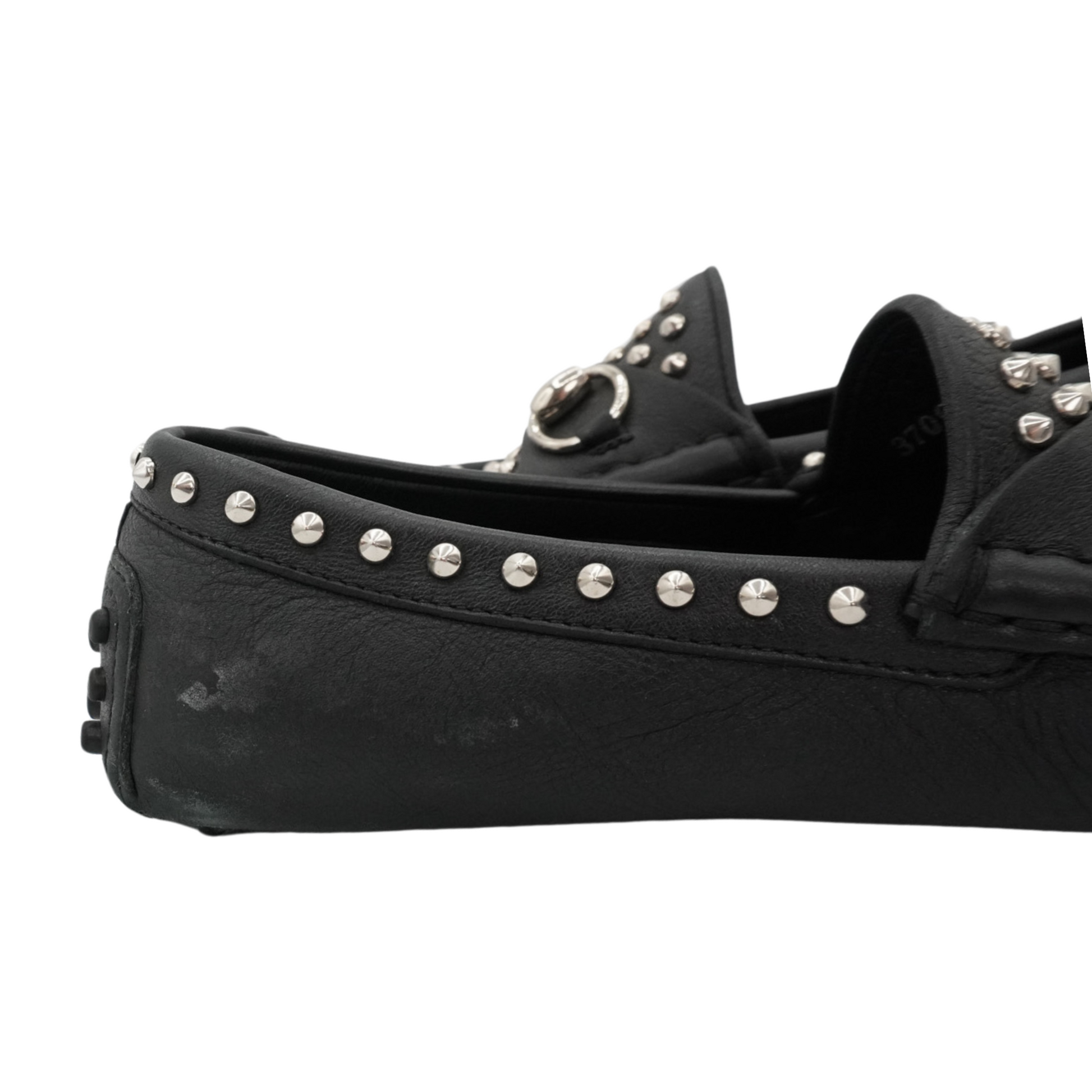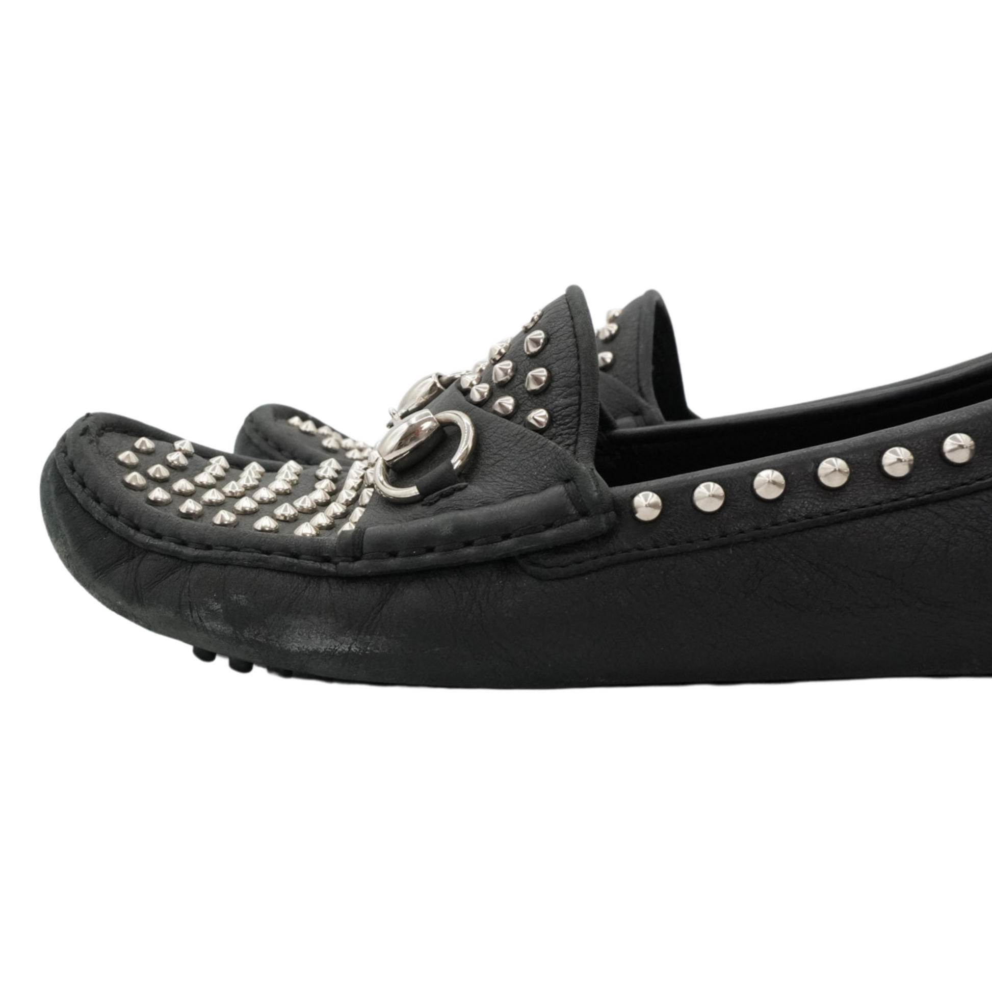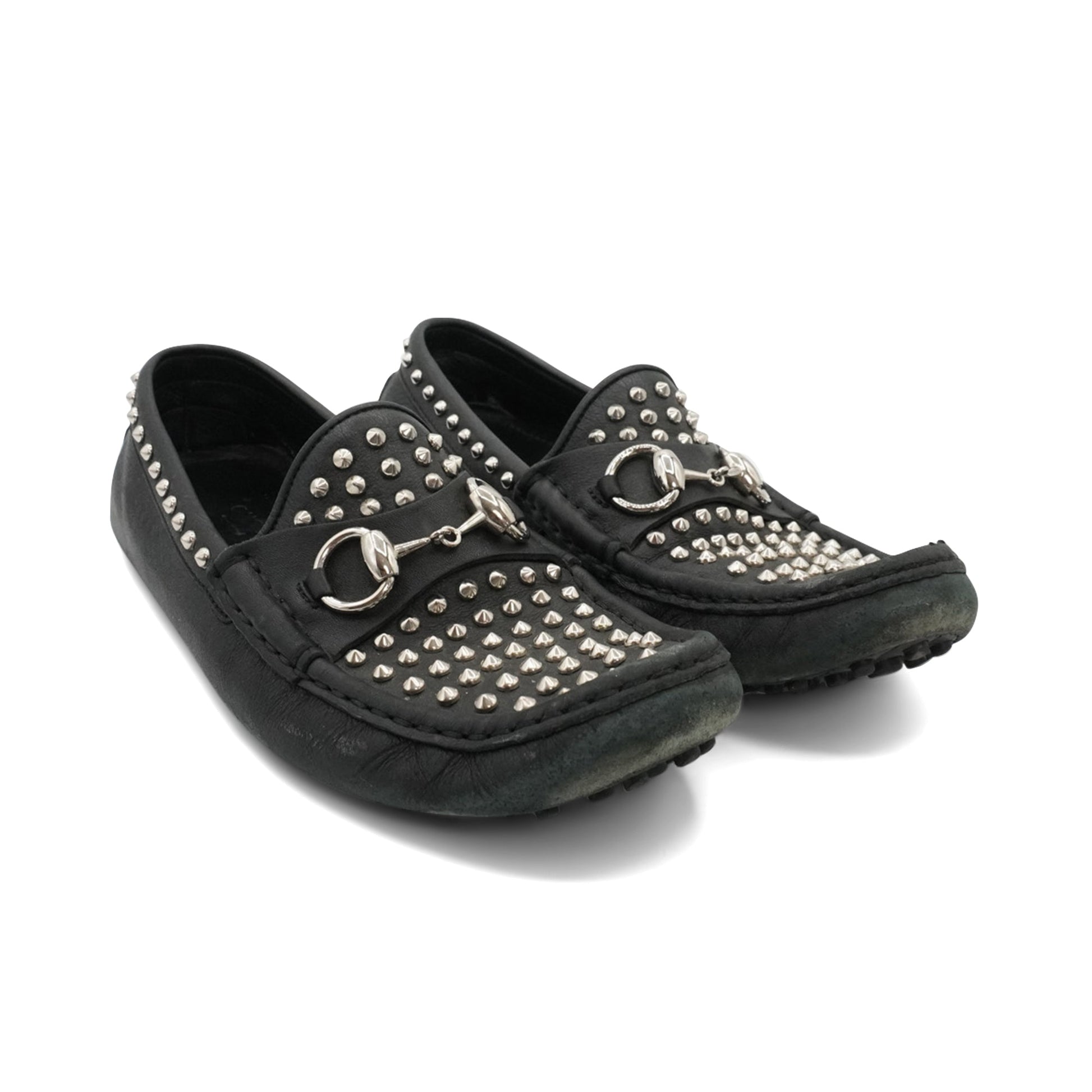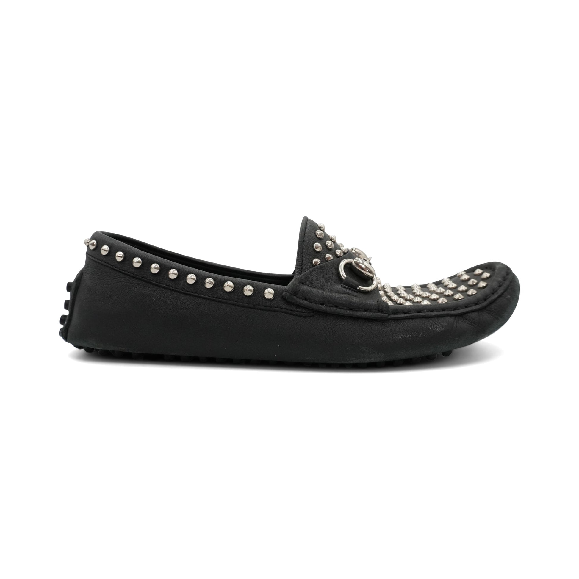 Gucci loafers in black leather with a silver horsebit detail at the toe and studding hardware throughout.