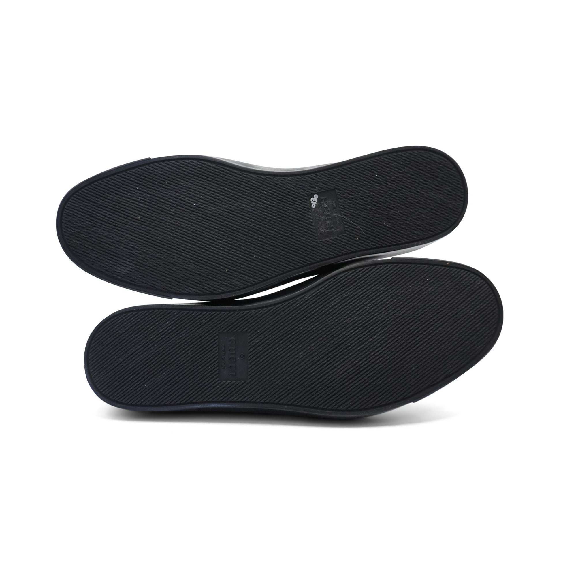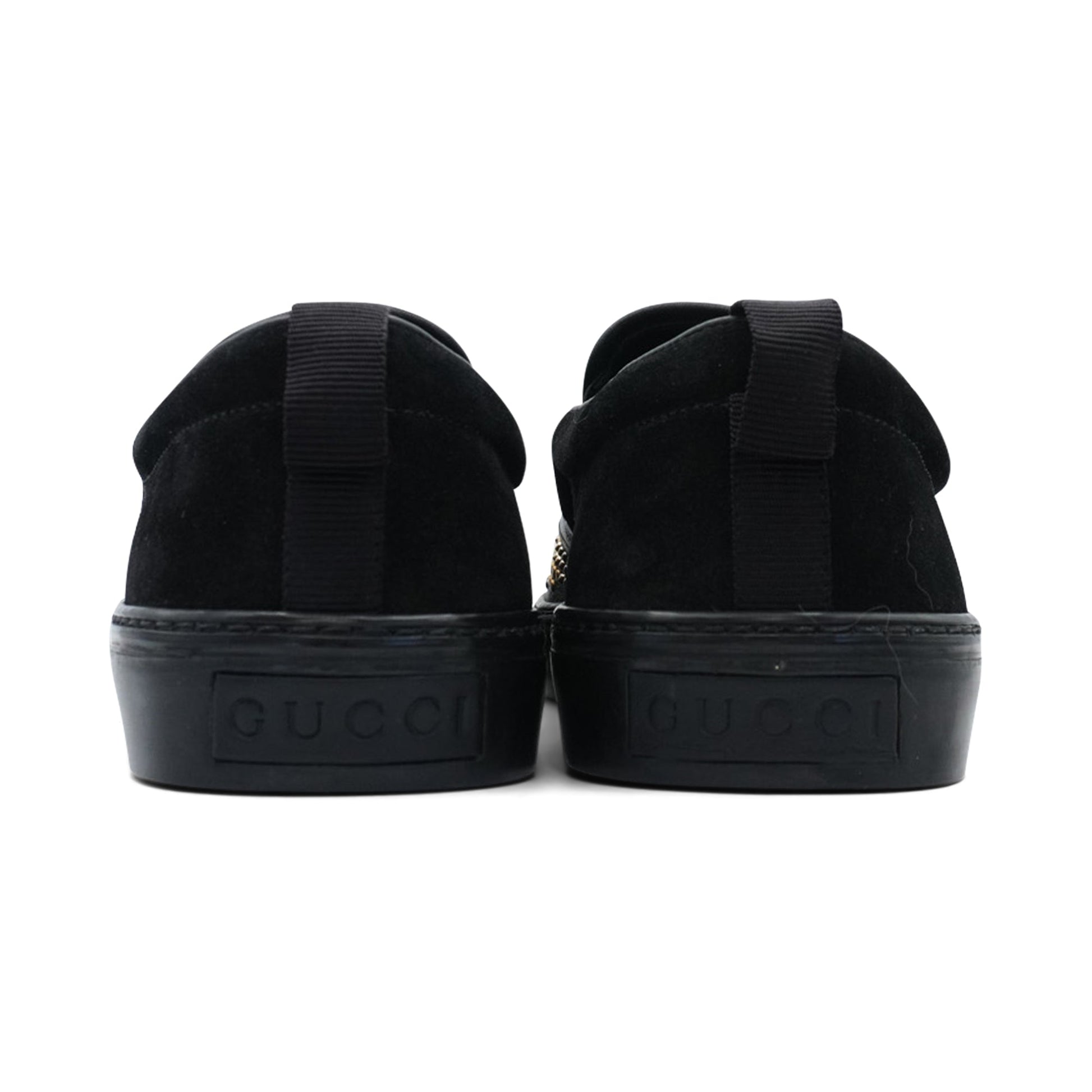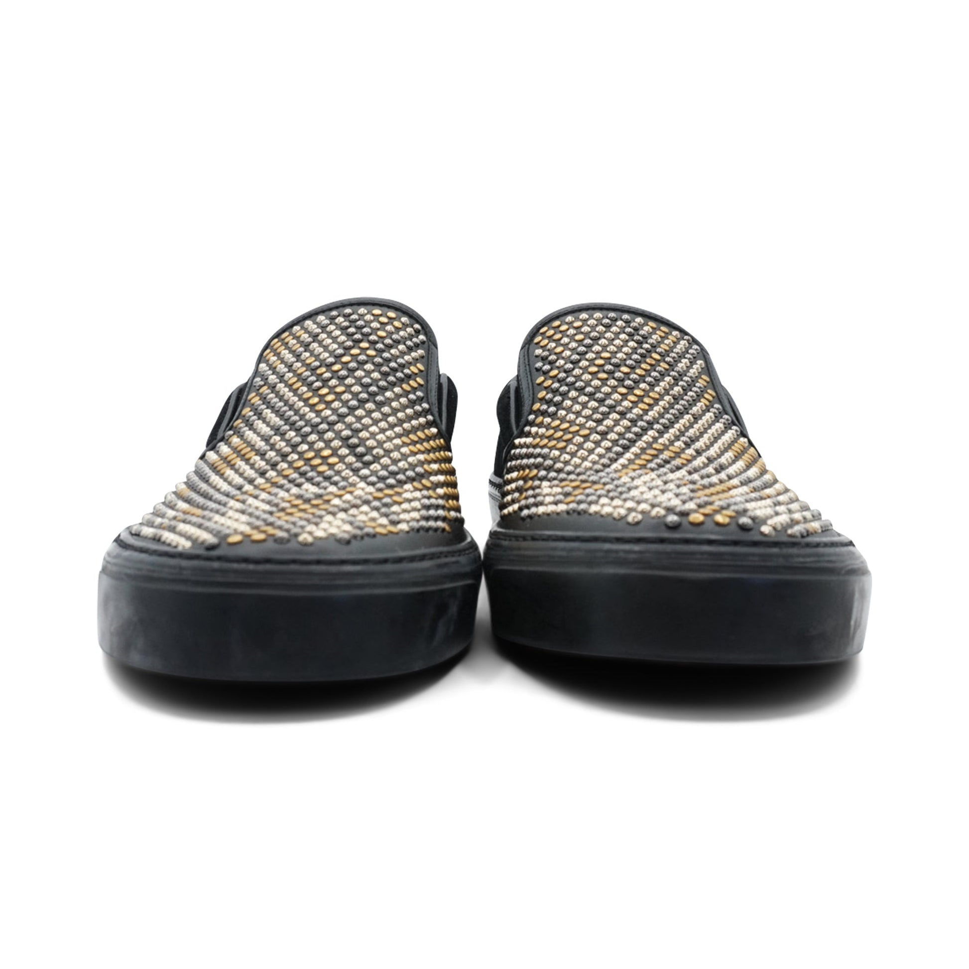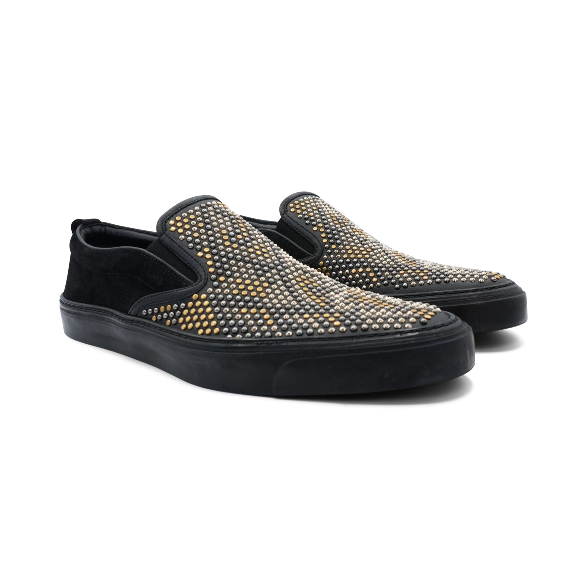 Gucci slip-on sneakers in black leather and suede with silver, gold and gunmetal stud details and a black rubber sole.