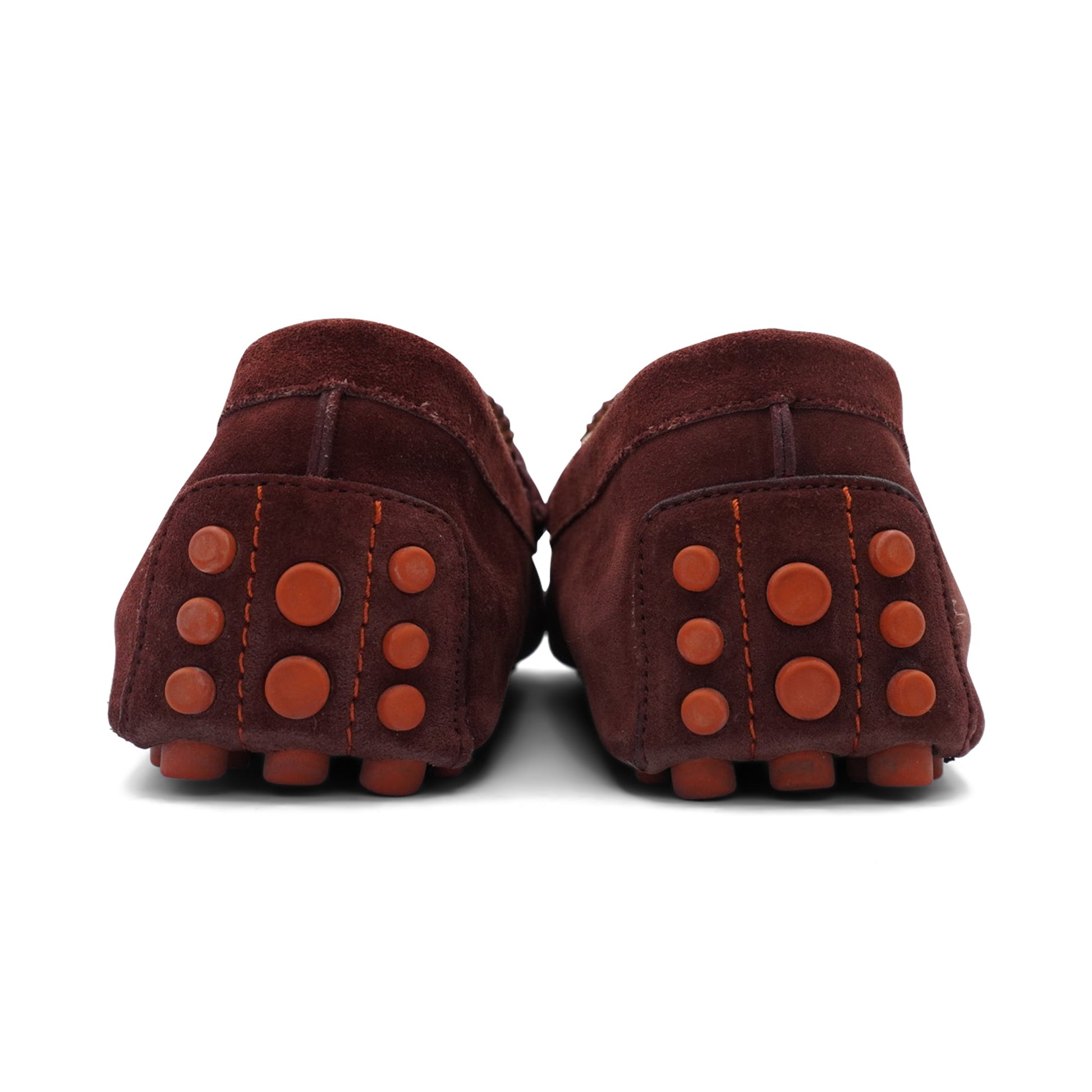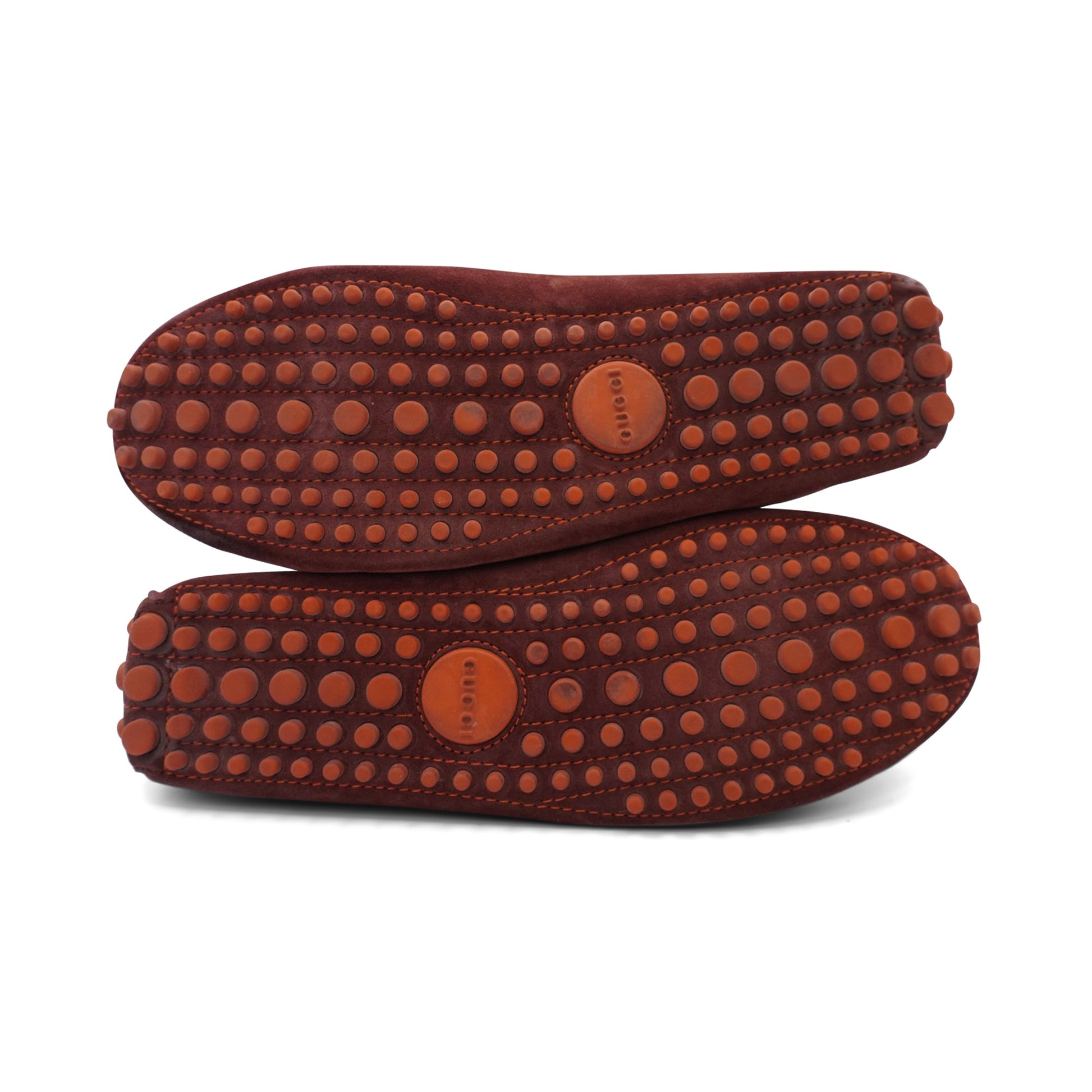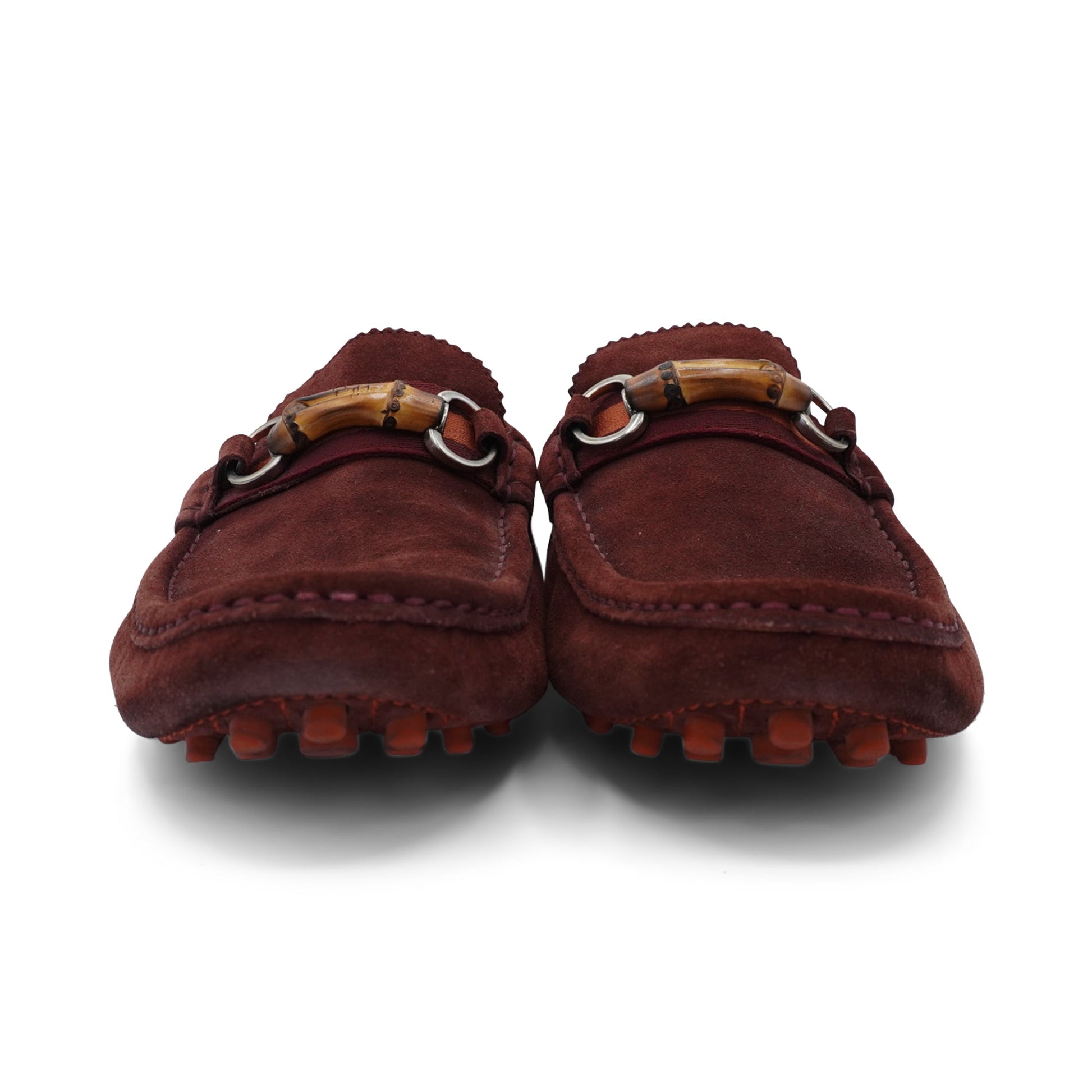 Gucci loafers in maroon suede with a silver and bamboo horsebit on the toe and a driver sole.