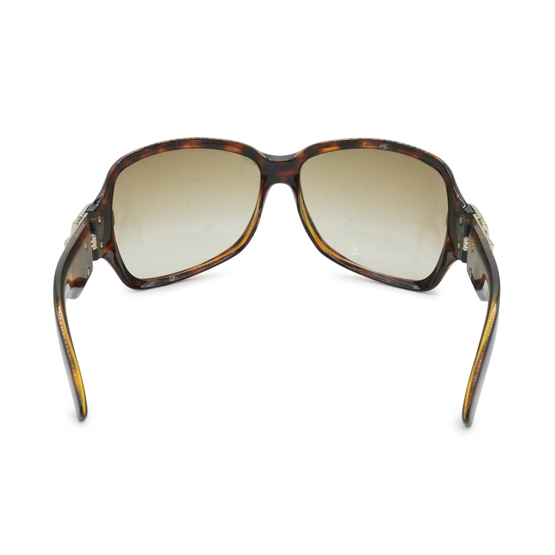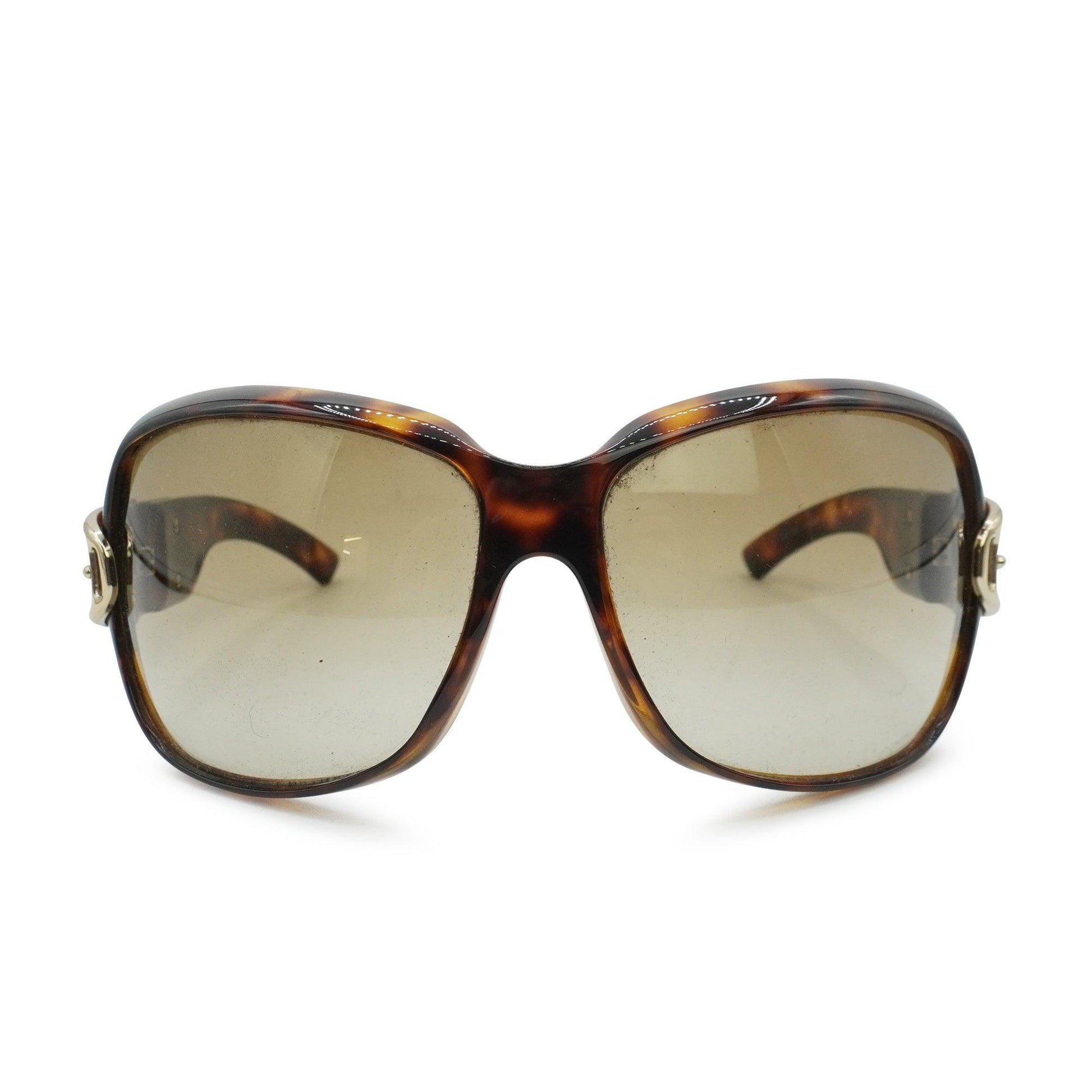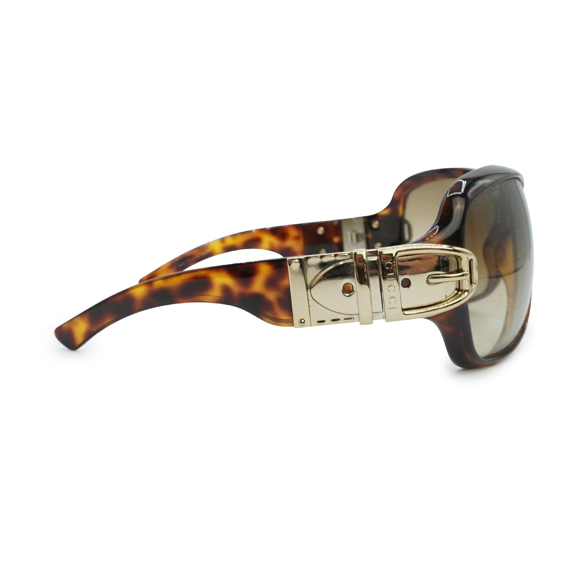 Gucci oversized sunglasses in brown tortoise acetate with brown lenses and a buckle detail on the arms in soft gold hardware.