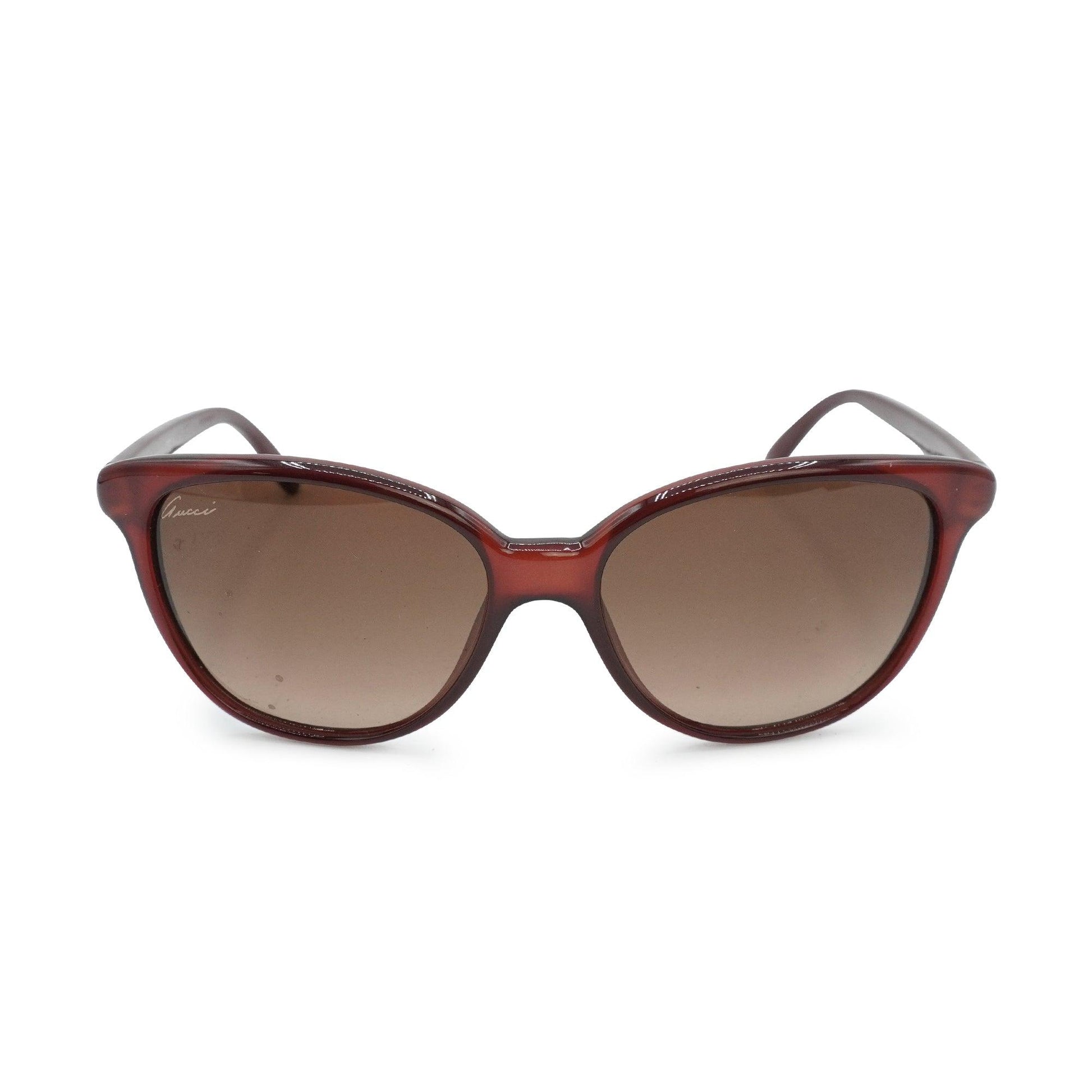 Gucci sunglasses in burgundy acetate with brown rounded cat-eye lenses and a gold glitter quilted effect on the arms.