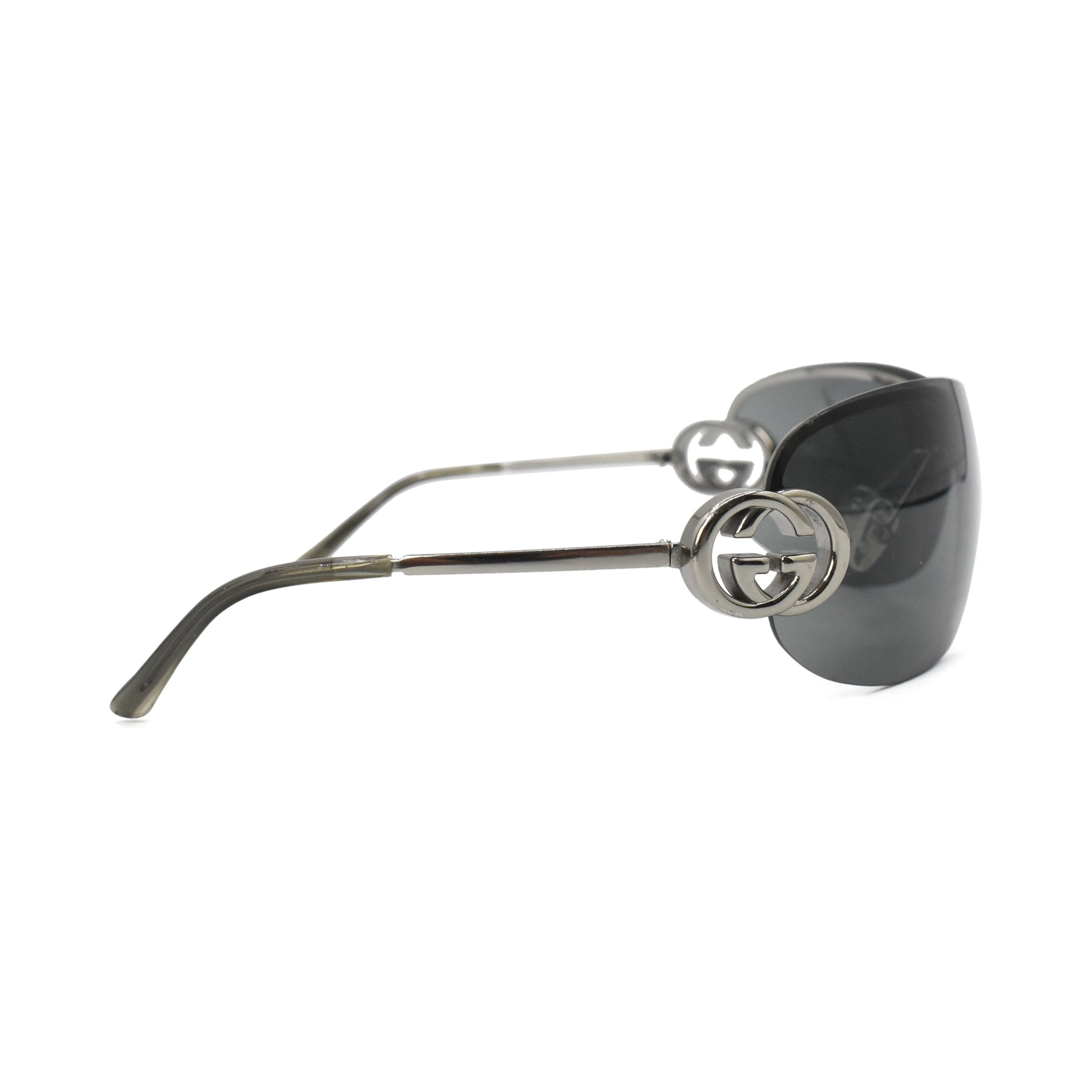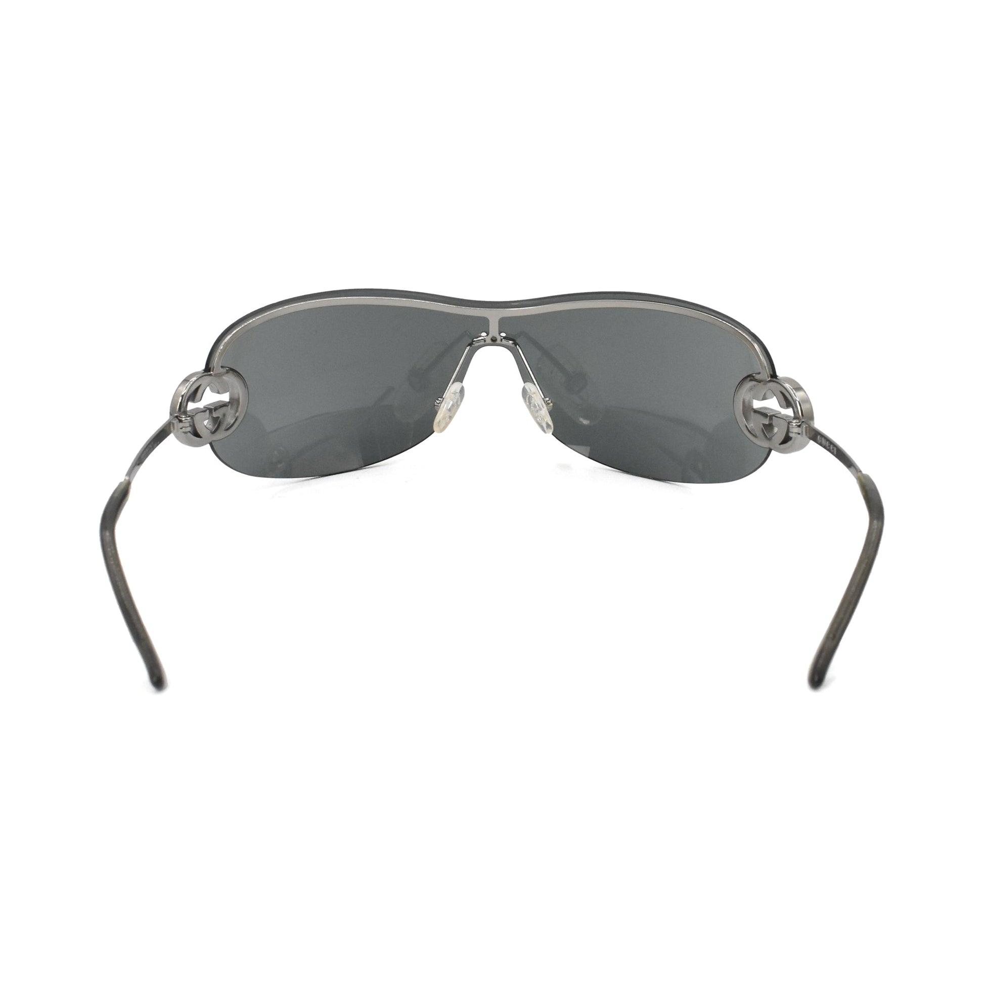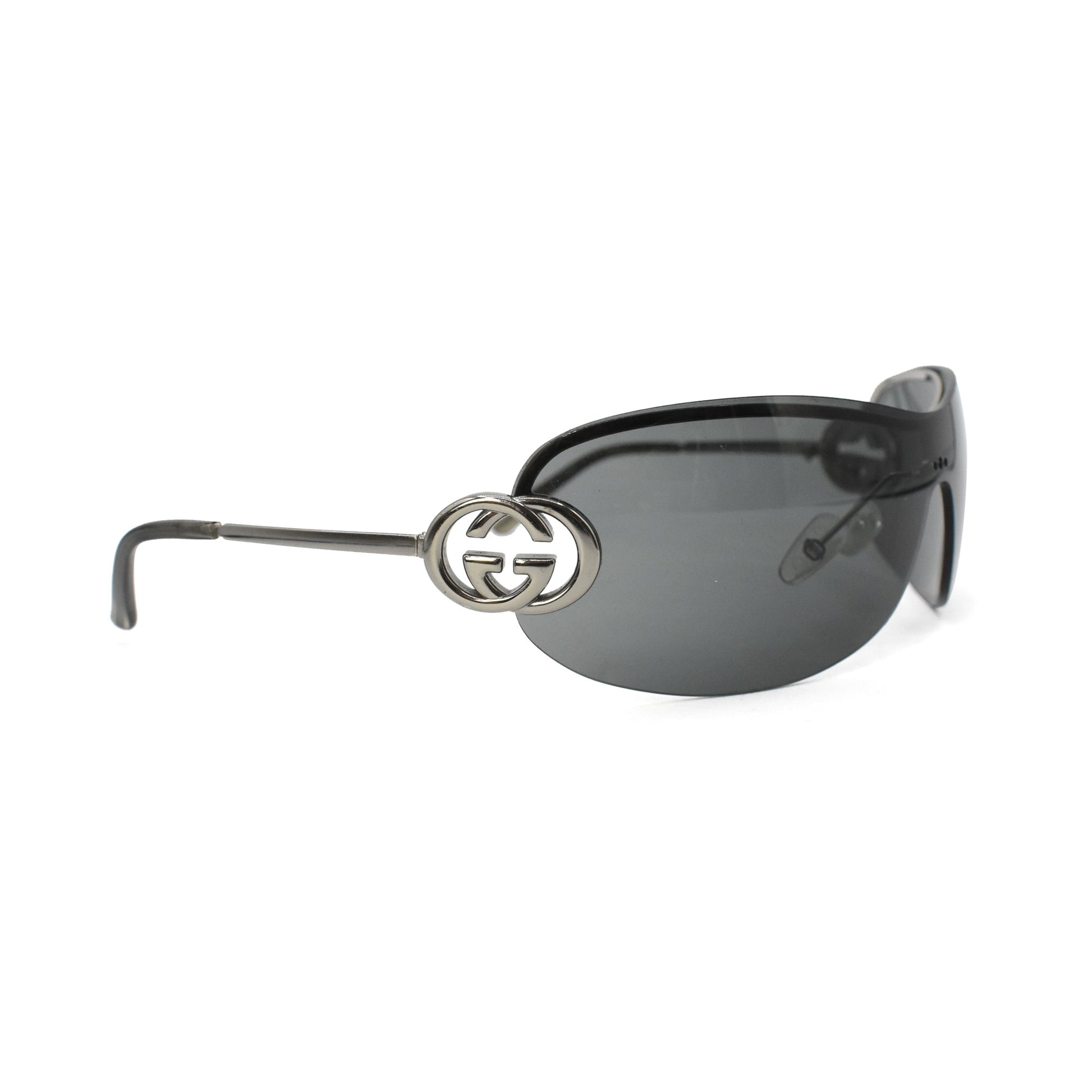 Gucci shield sunglasses in silver metal with a black lens and a large 'GG' emblem on the arms.