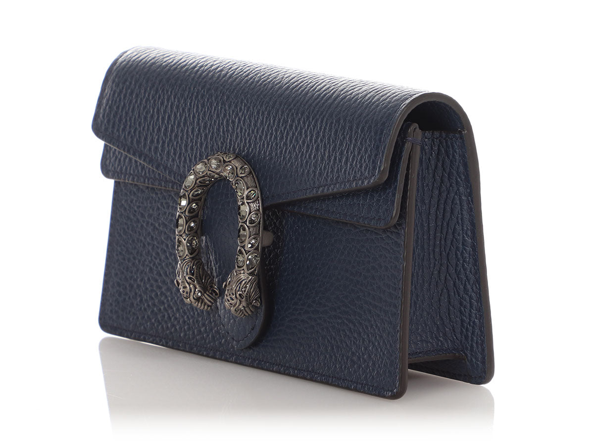Gucci’s Super Mini Navy Dionysus is an ultra-petite statement of luxury! Crafted from thick, grained dark blue leather with pewter hardware, it features a rhinestone-encrusted tiger head buckle on the front flap—a nod to the tiger-riding Greek god Dionysus. The detachable chain strap with a 23.25-inch drop offers crossbody or clutch styling, while the snap closure opens up to reveal a flapped pocket on the bag’s front face and a pocketless beige suede-lined interior with a handy clasp on a chain. Though small, it’s perfect for essentials like cards and lipstick. Brand new, it comes with a dustbag, box, and cards. It’s a mythological masterpiece in mini form!