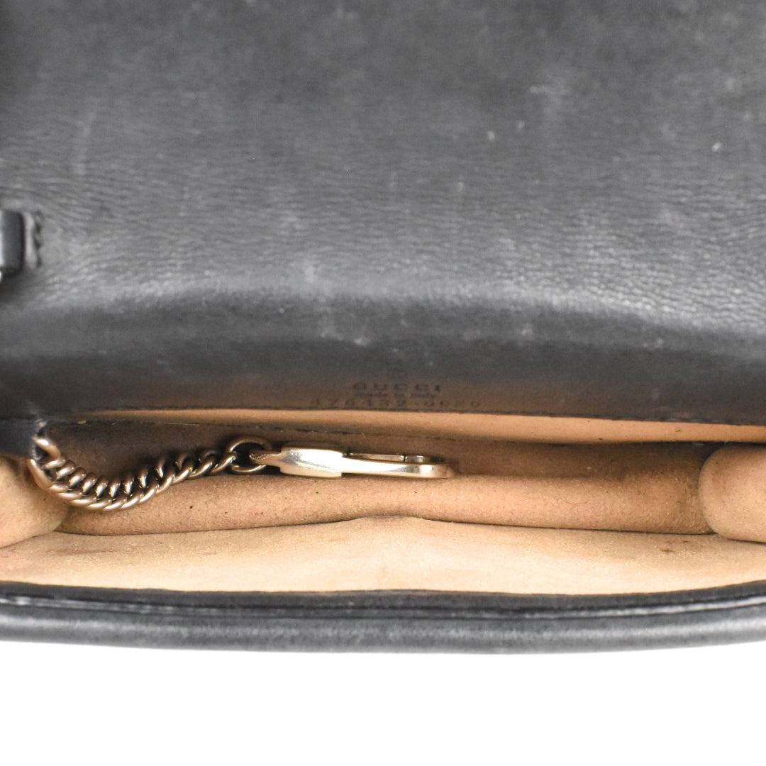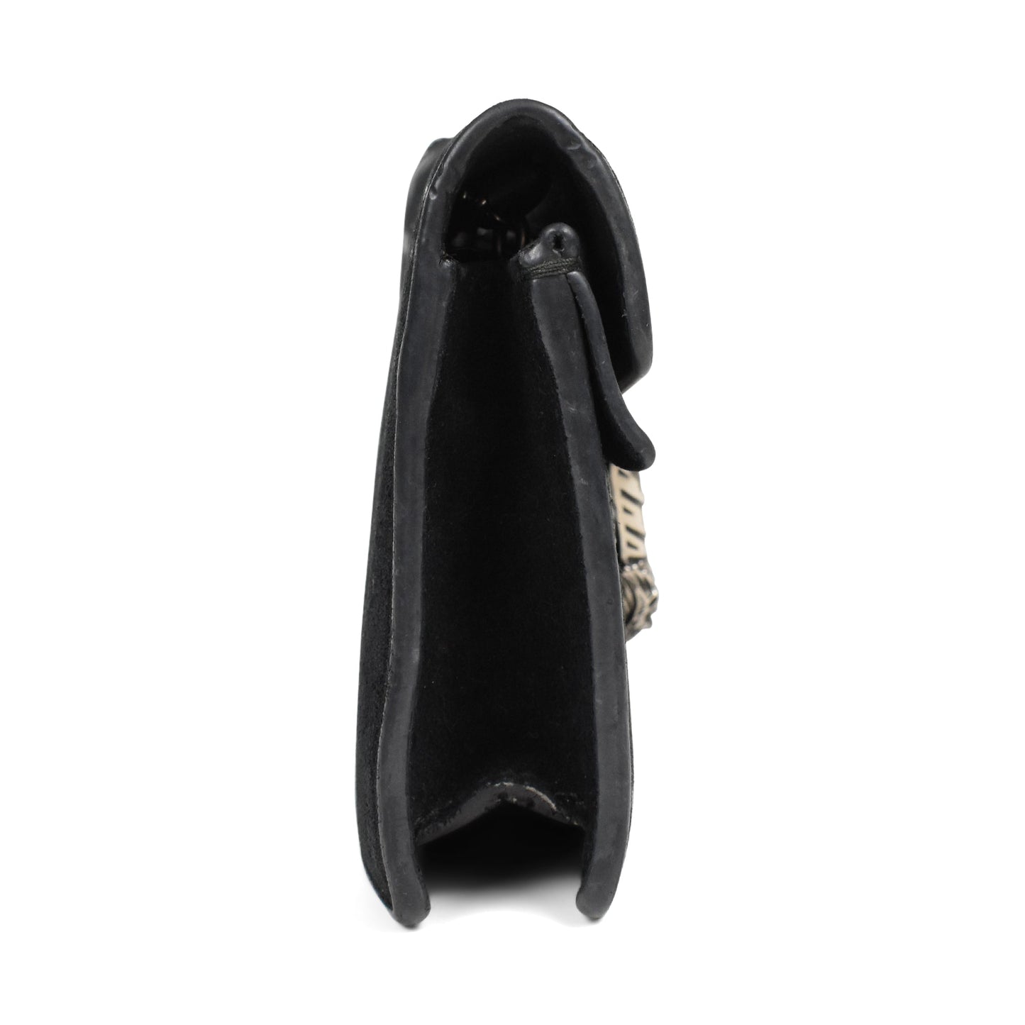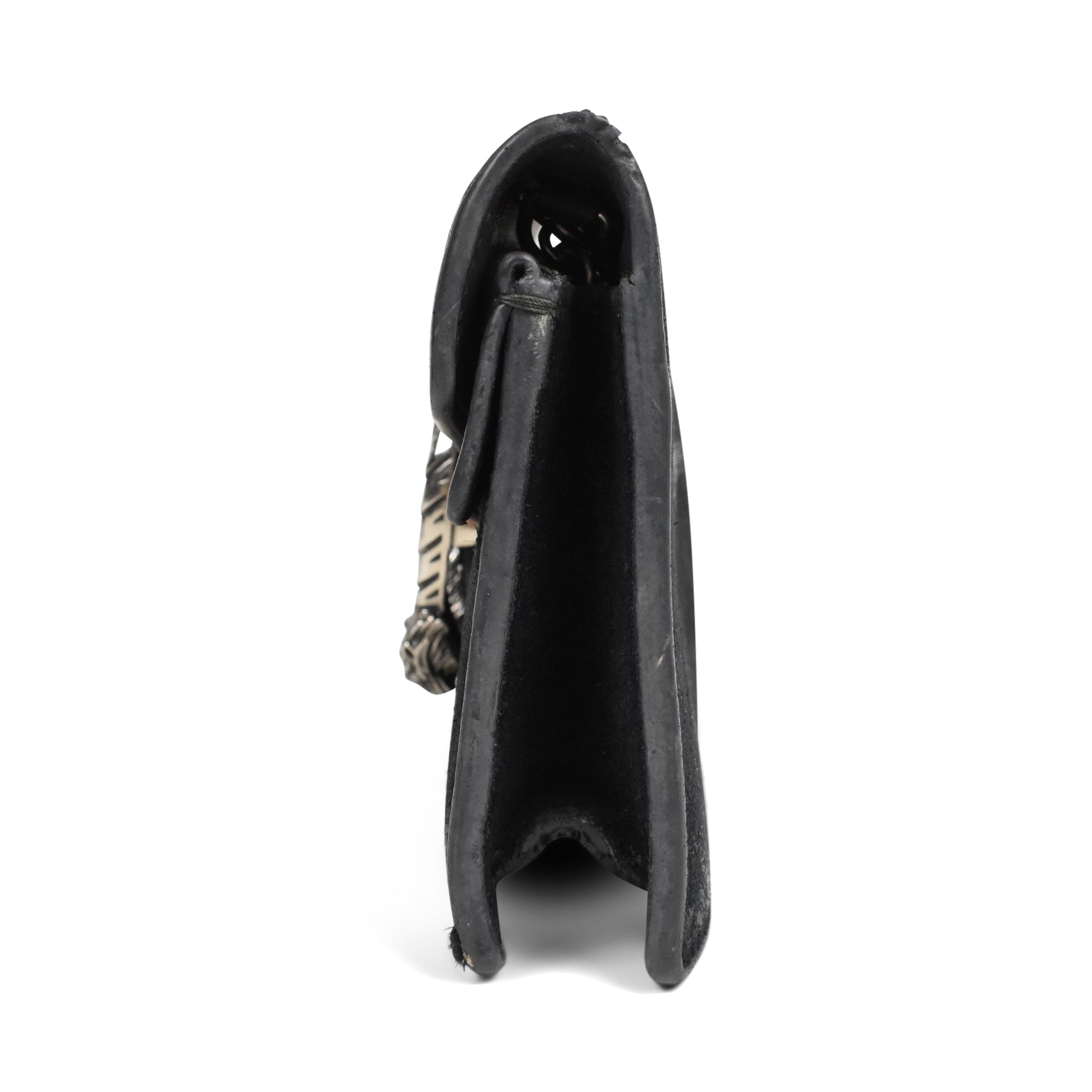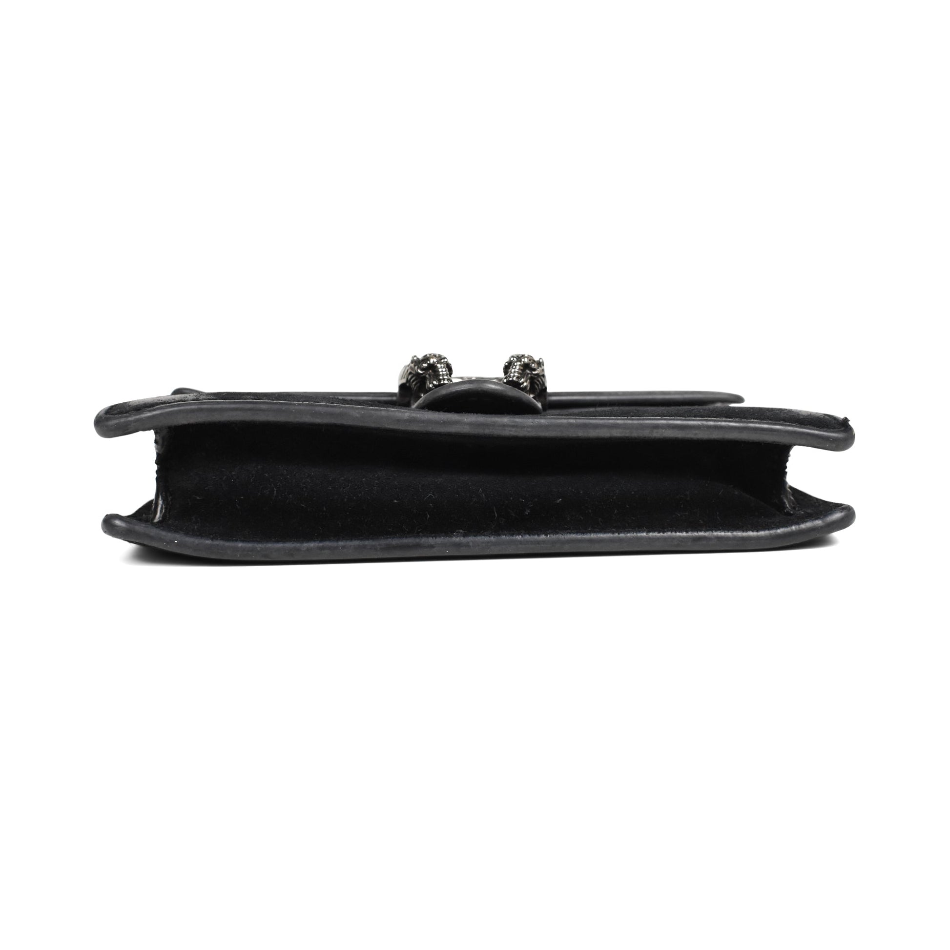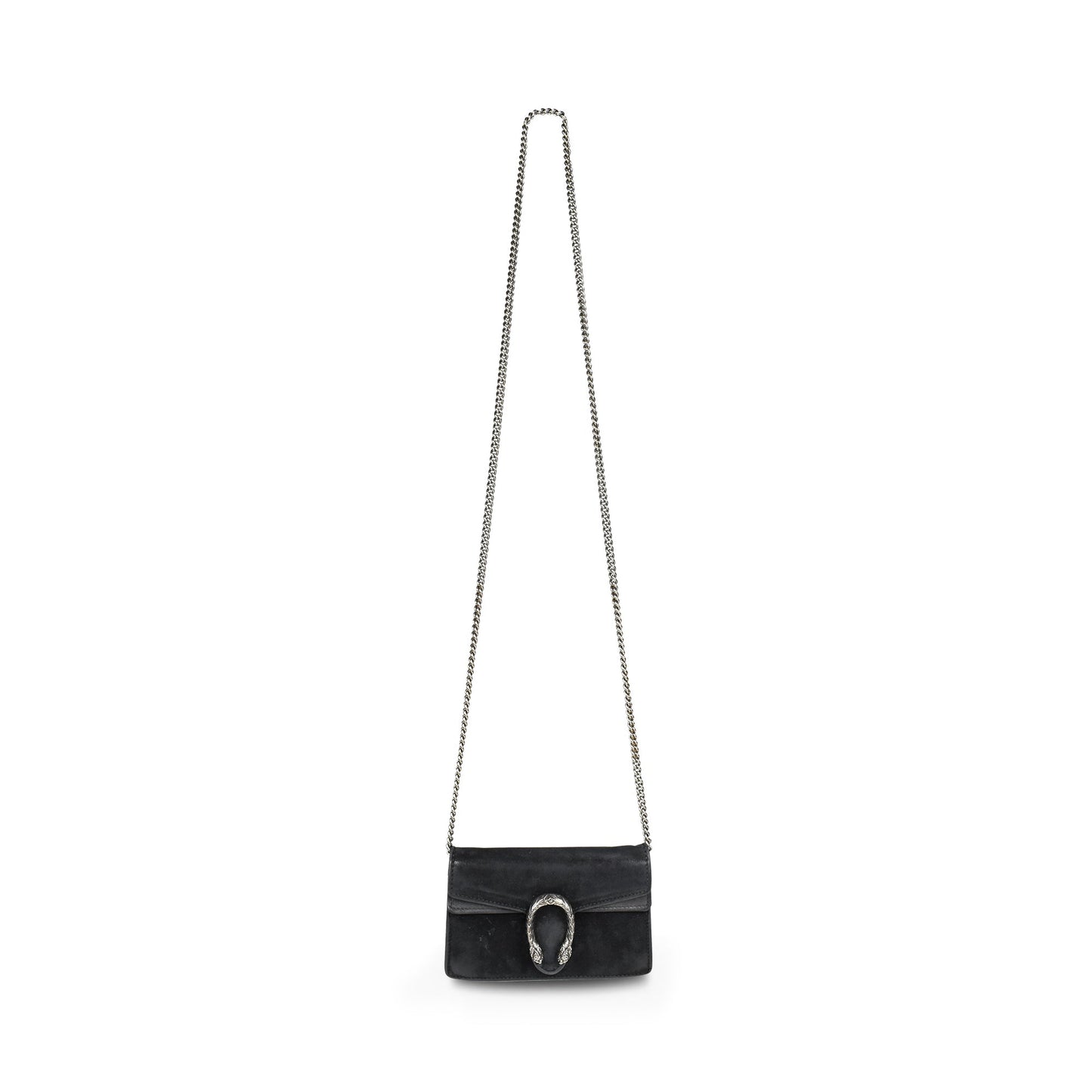 Gucci 'Supreme Mini Dionysus' shoulder bag in black suede with black leather trim. Features a silver dionysus clasp, a magnetic closure and a removable long chain strap. The interior is tan suede lined and includes a key ring chain that allows the bag to be attached to a larger bag.