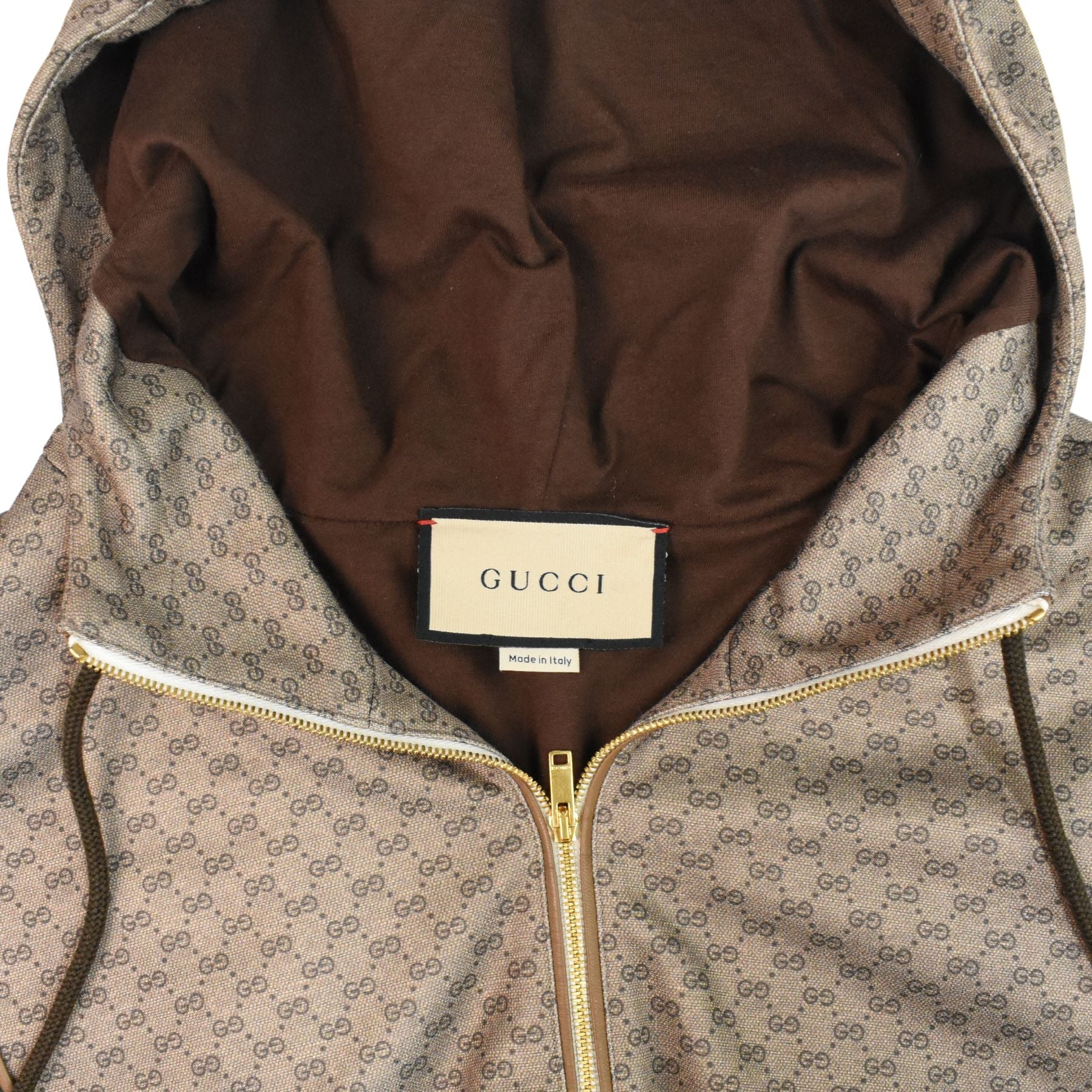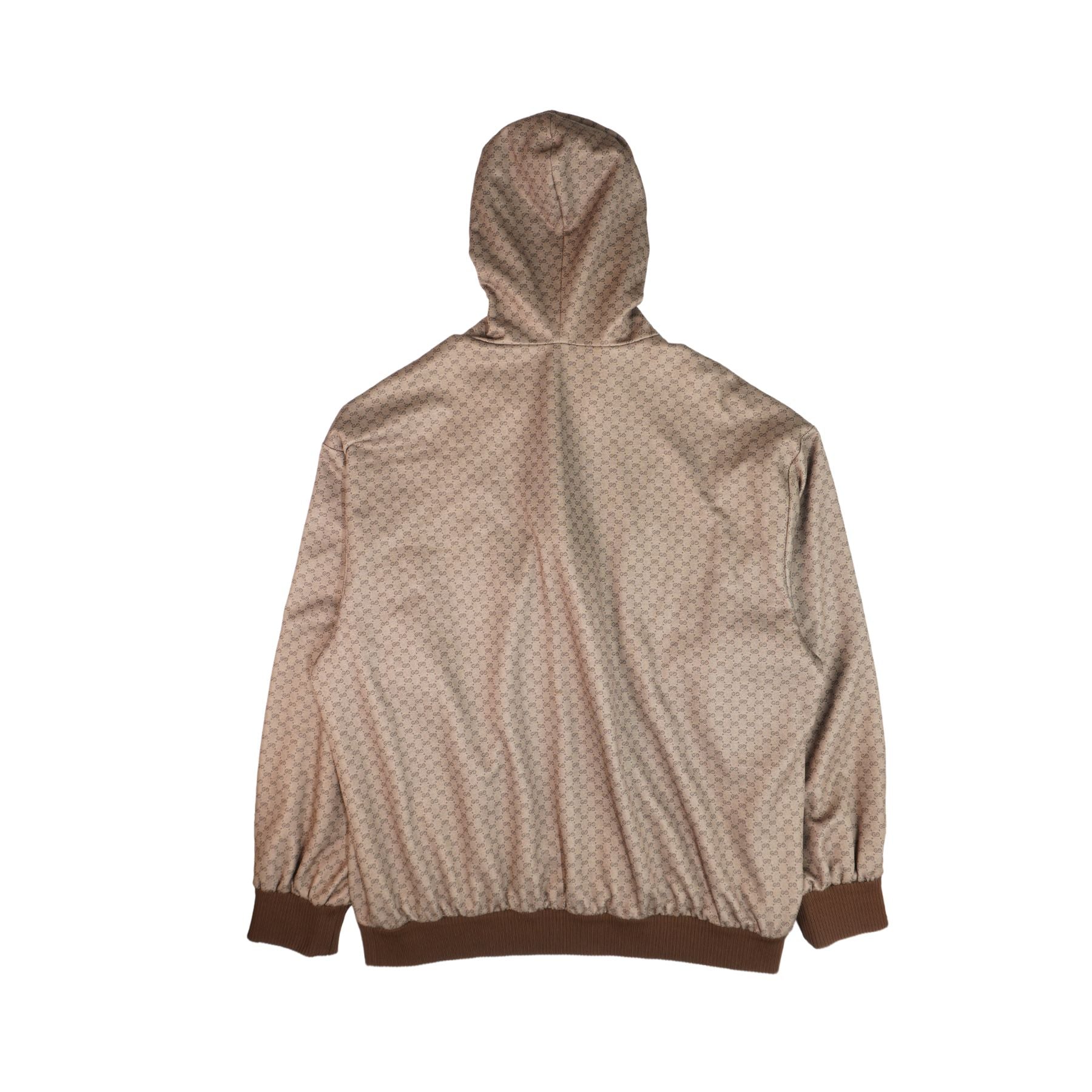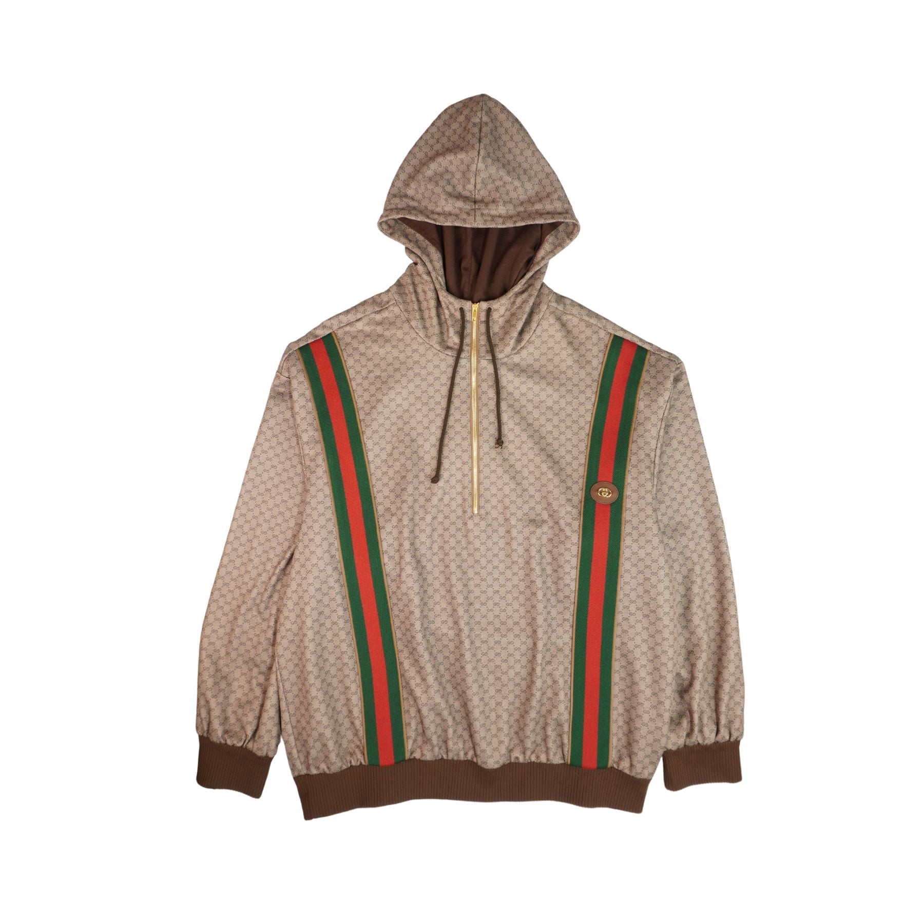Gucci hooded sweater in brown mini monogram pattern with brown ribbed sleeve cuffs and hem. Features a quarter zip closure in gold hardware, a hood with brown adjustable drawstrings, red and green racing stripes down the front with brown leather trim, and a gold hardware 'GG' logo on brown leather patch on the chest.
