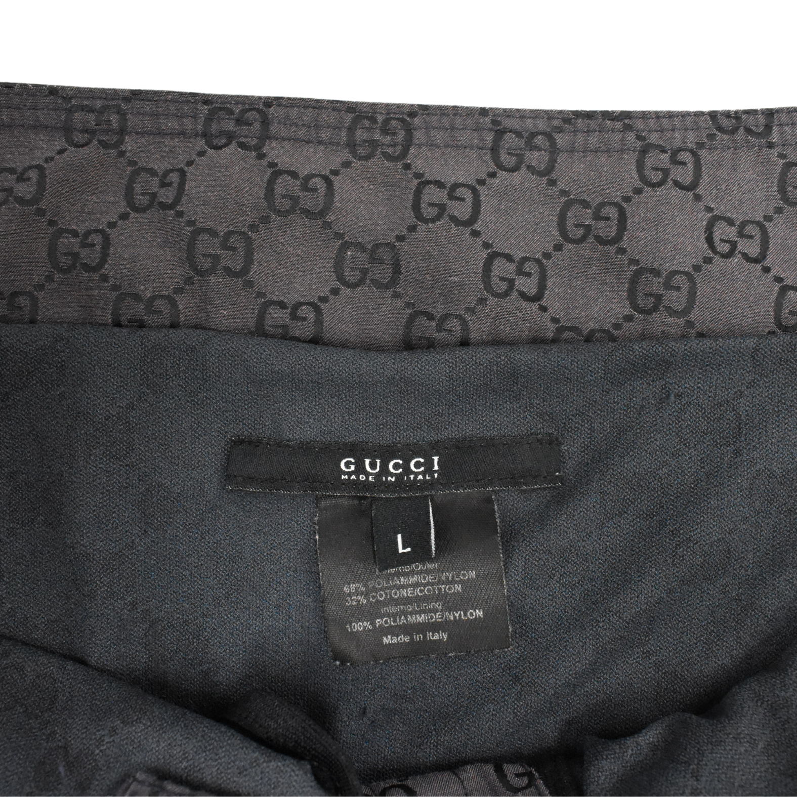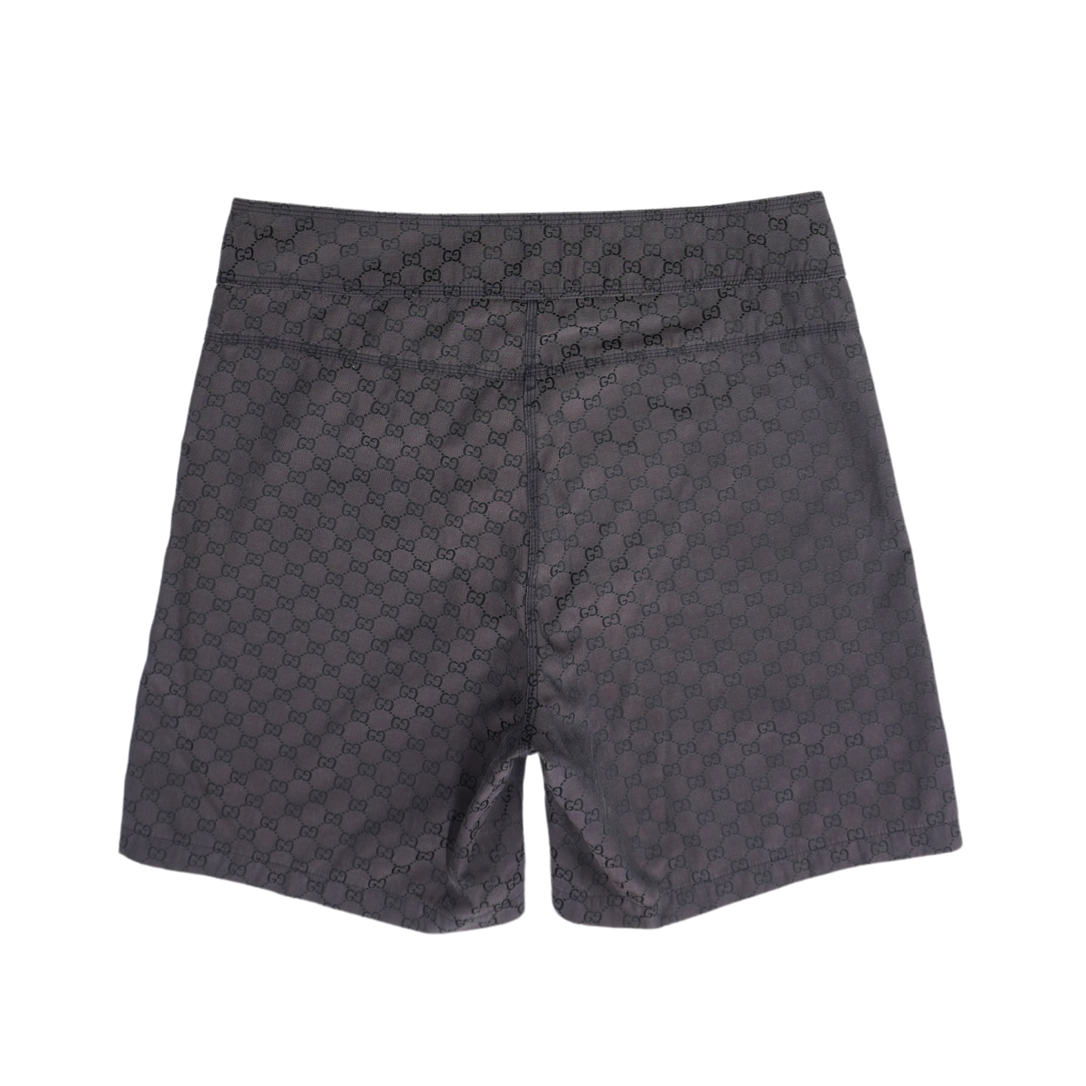 Gucci swim shorts in dark washed purple nylon with an all-over black supreme GG monogram print.