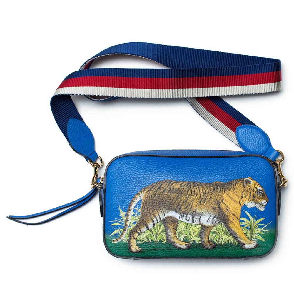 This stylish crossbody is crafted of blue calfskin leather with printed tiger graphics. This crossbody features a blue, white, and red canvas web shoulder strap and the top zipper opens to a beige course linen interior.