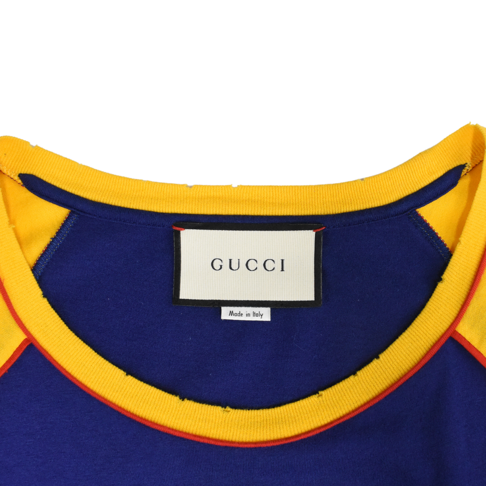 Gucci t-shirt in navy and yellow cotton with red piping, distressed hems, a 'GUCCI ANIMALIUM' text graphic, and red and black embroidered wolf decal.