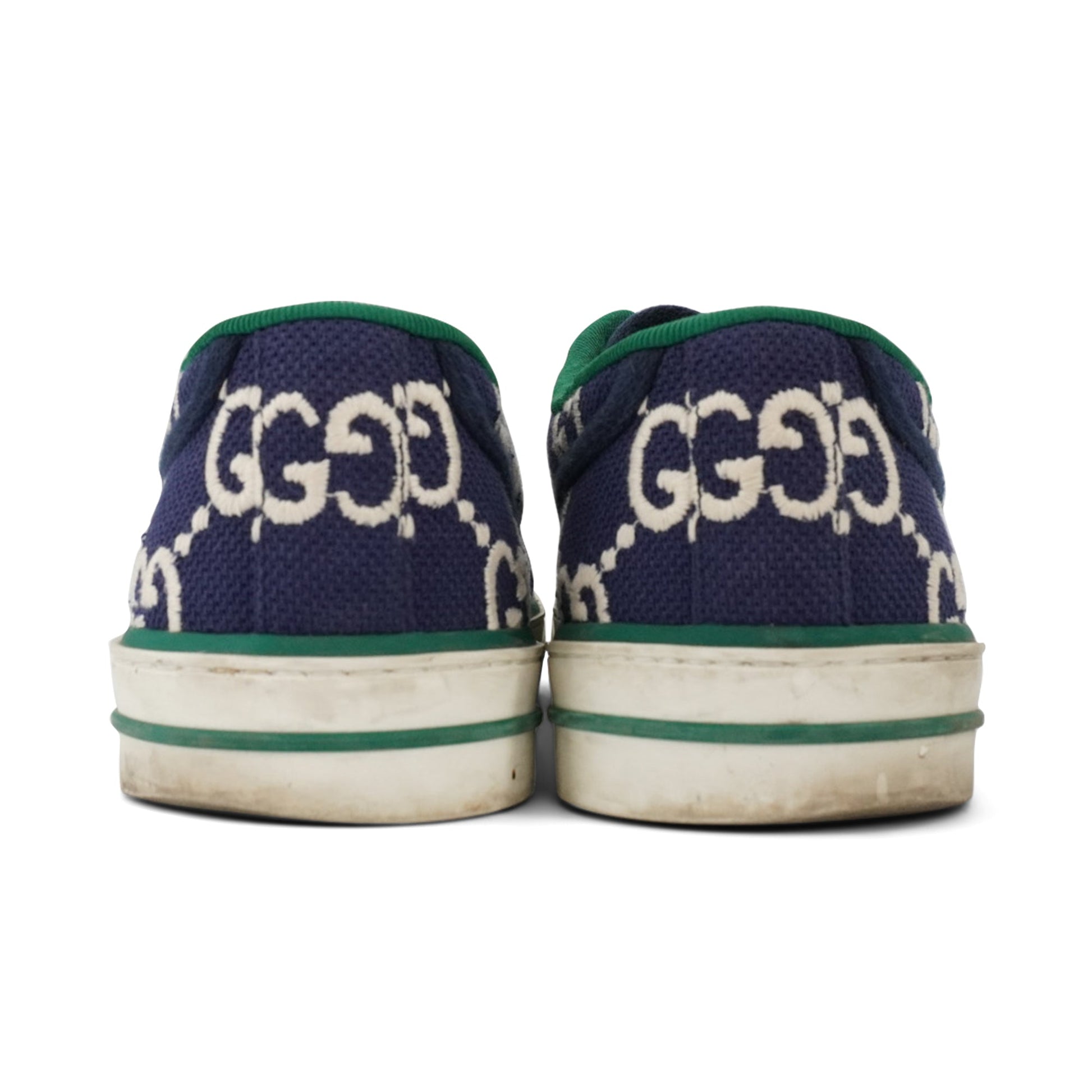 Gucci 'Tennis 1977' low-top sneakers in navy canvas with white embroidered monogram and red-green racing stripe detail.