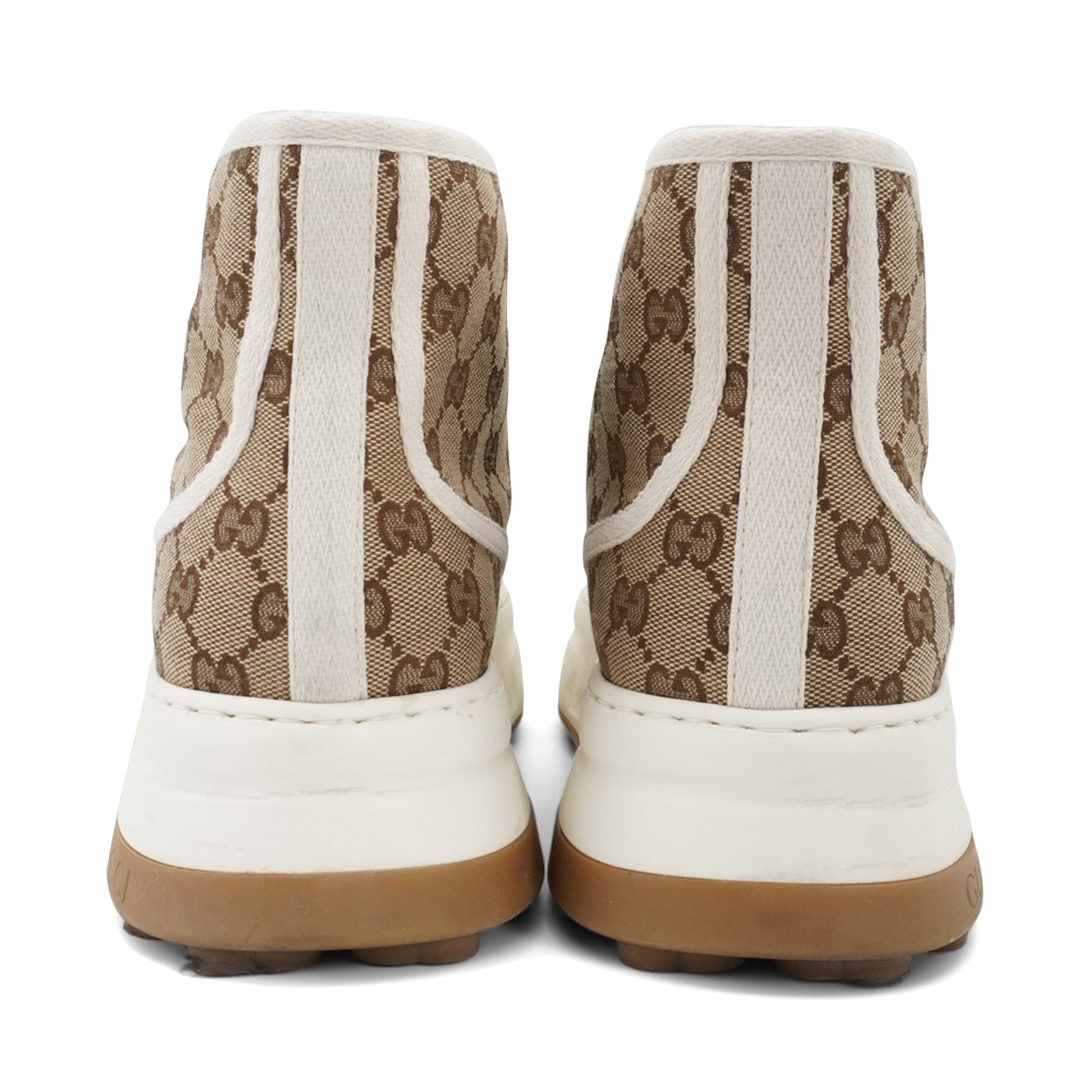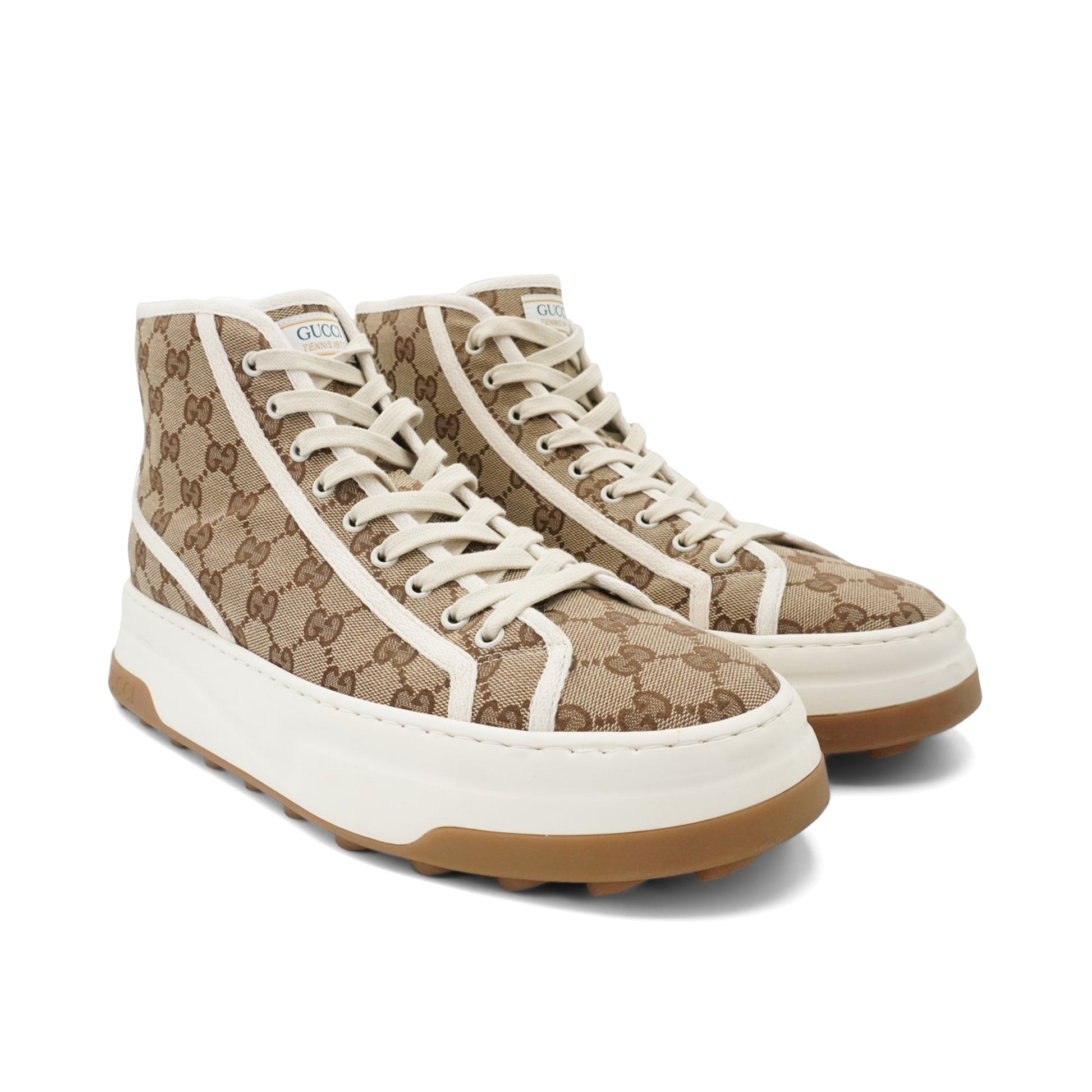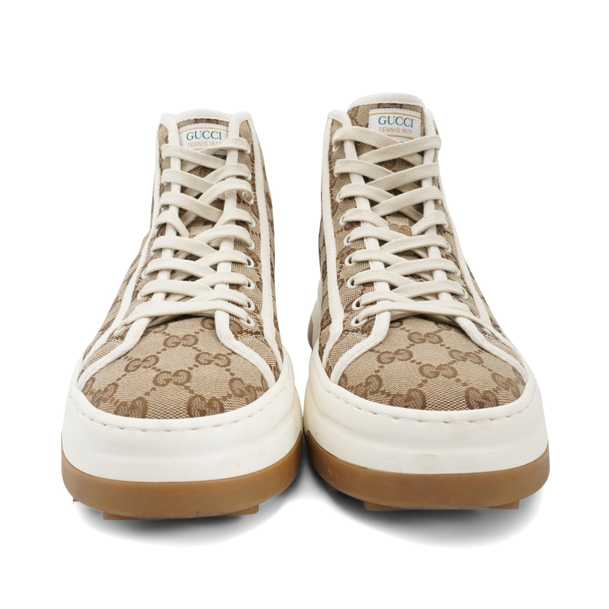Gucci 'Tennis 1977' high-top sneakers in brown classic 'GG' monogram pattern canvas with a white canvas trim, a white rubber sole and brown outsole.