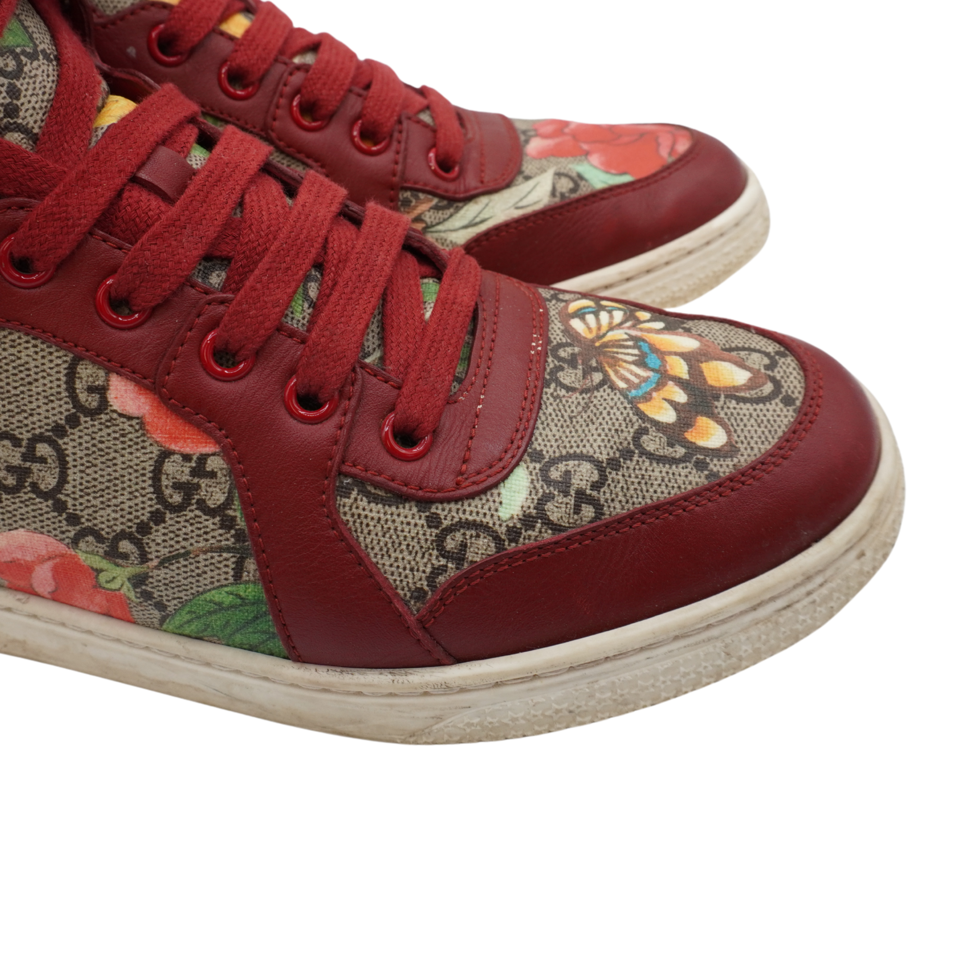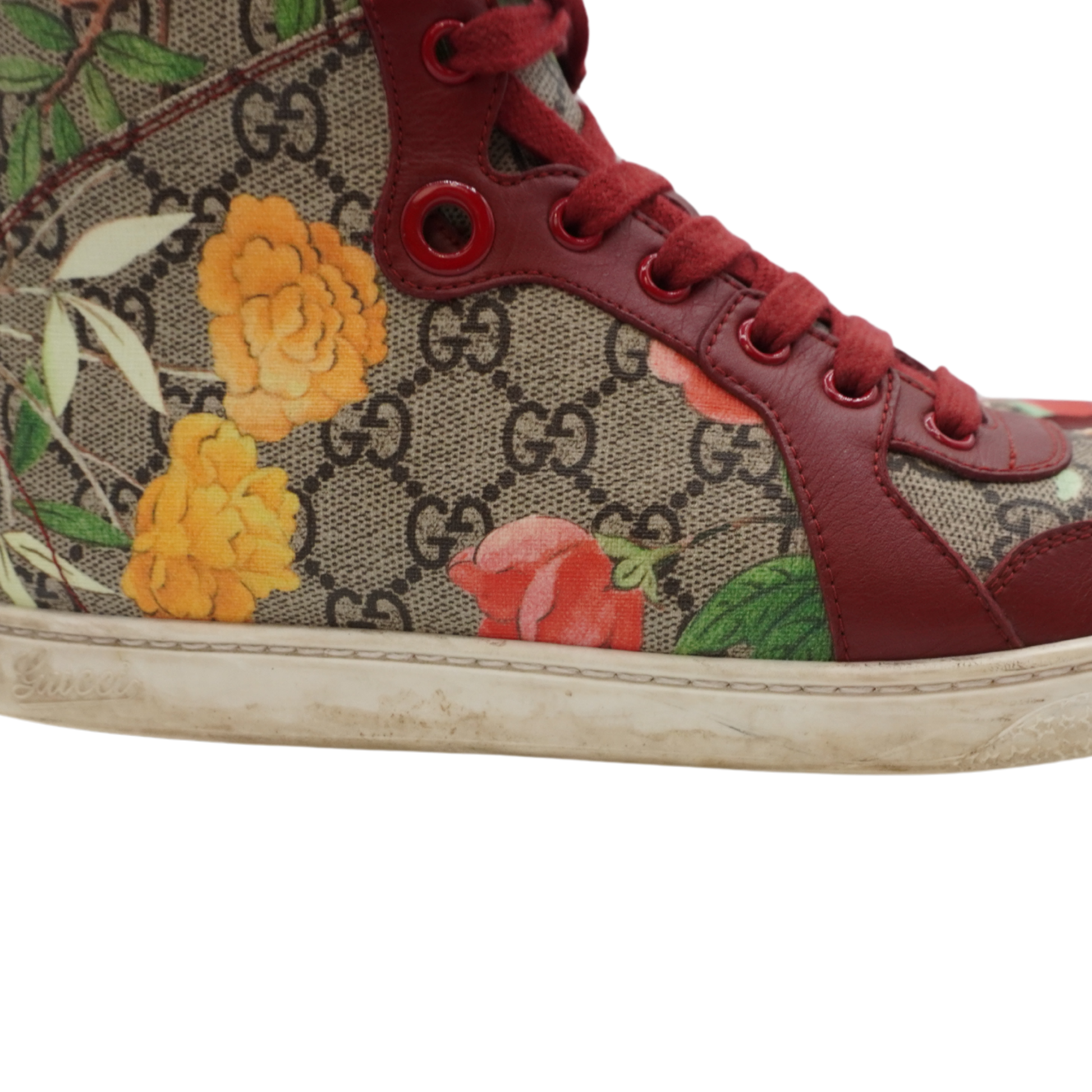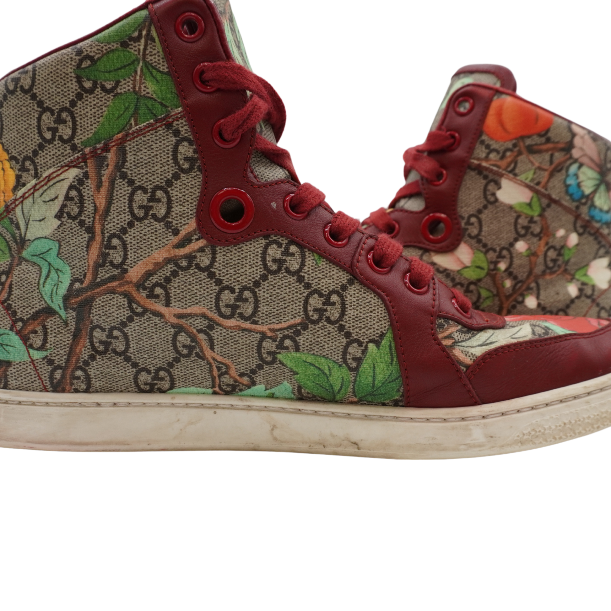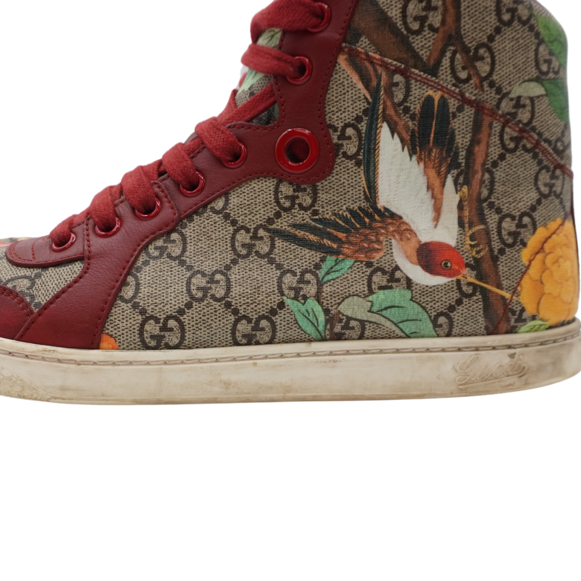 Gucci 'Tian' high-top sneakers in beige monogram coated canvas with an all-over floral and bird graphic print, red leather trim, and a white rubber sole.