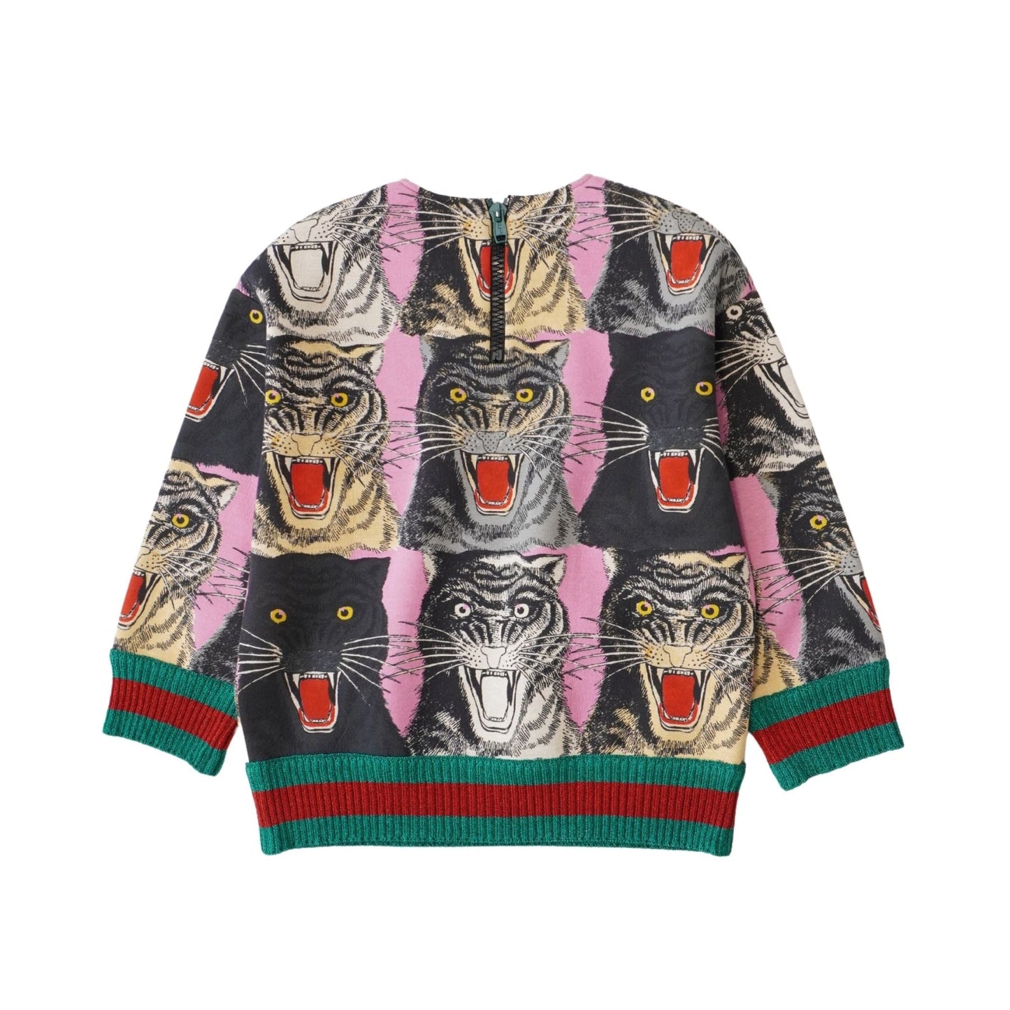 Gucci 'Tiger' long-sleeve crewneck sweater in pink padded cotton with tiger print throughout. Features green and red lurex thread racing stripe knit hem and a quarter-zip closure in black and green hardware on the back.