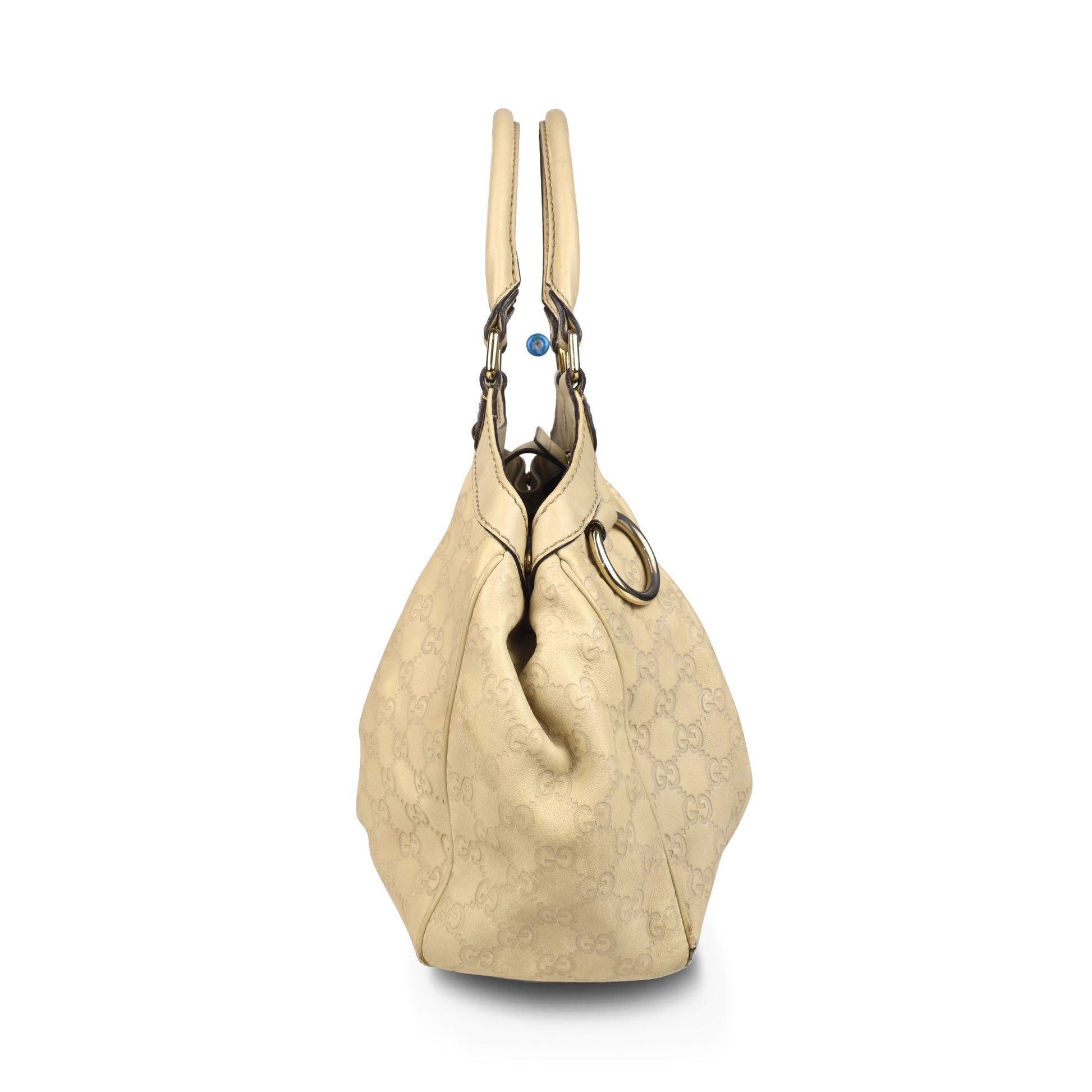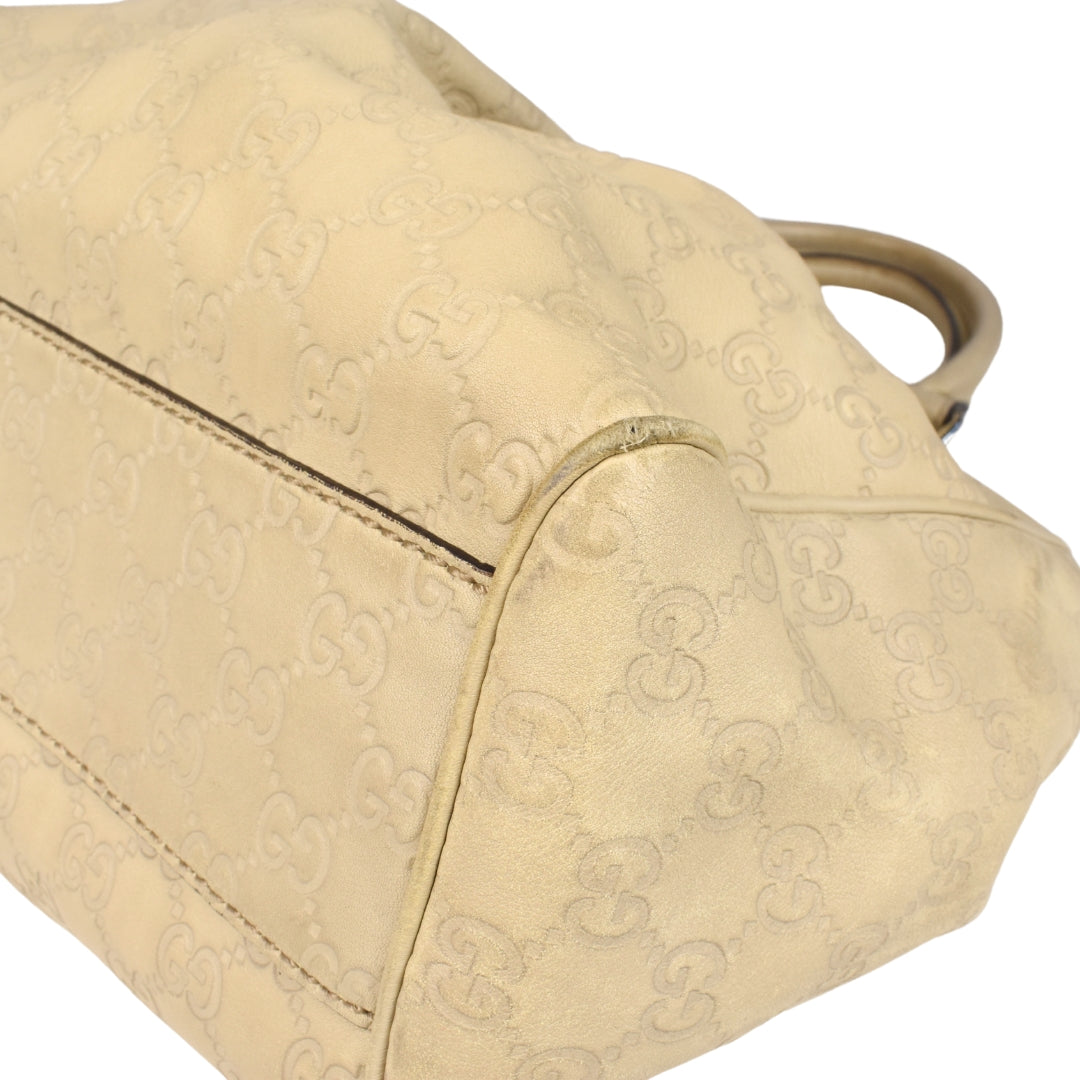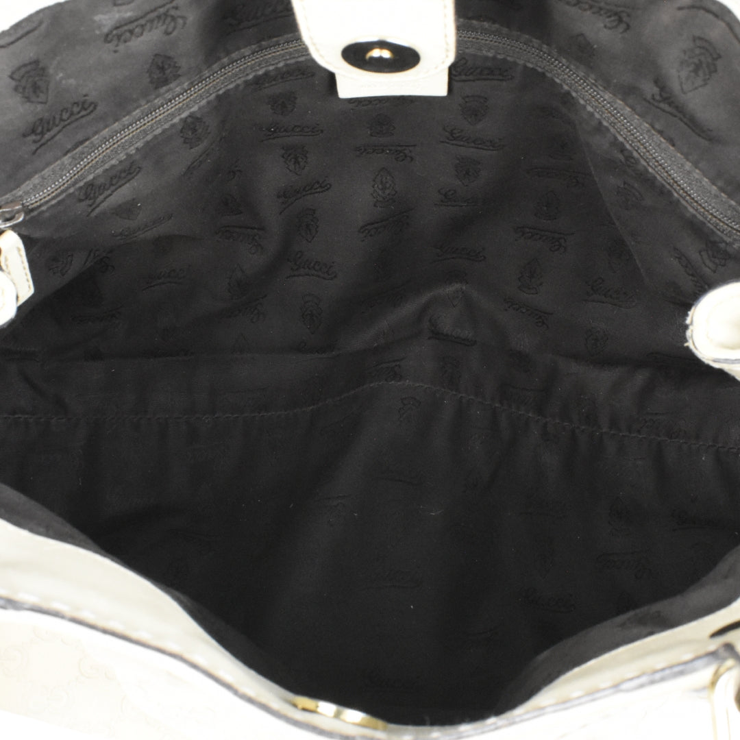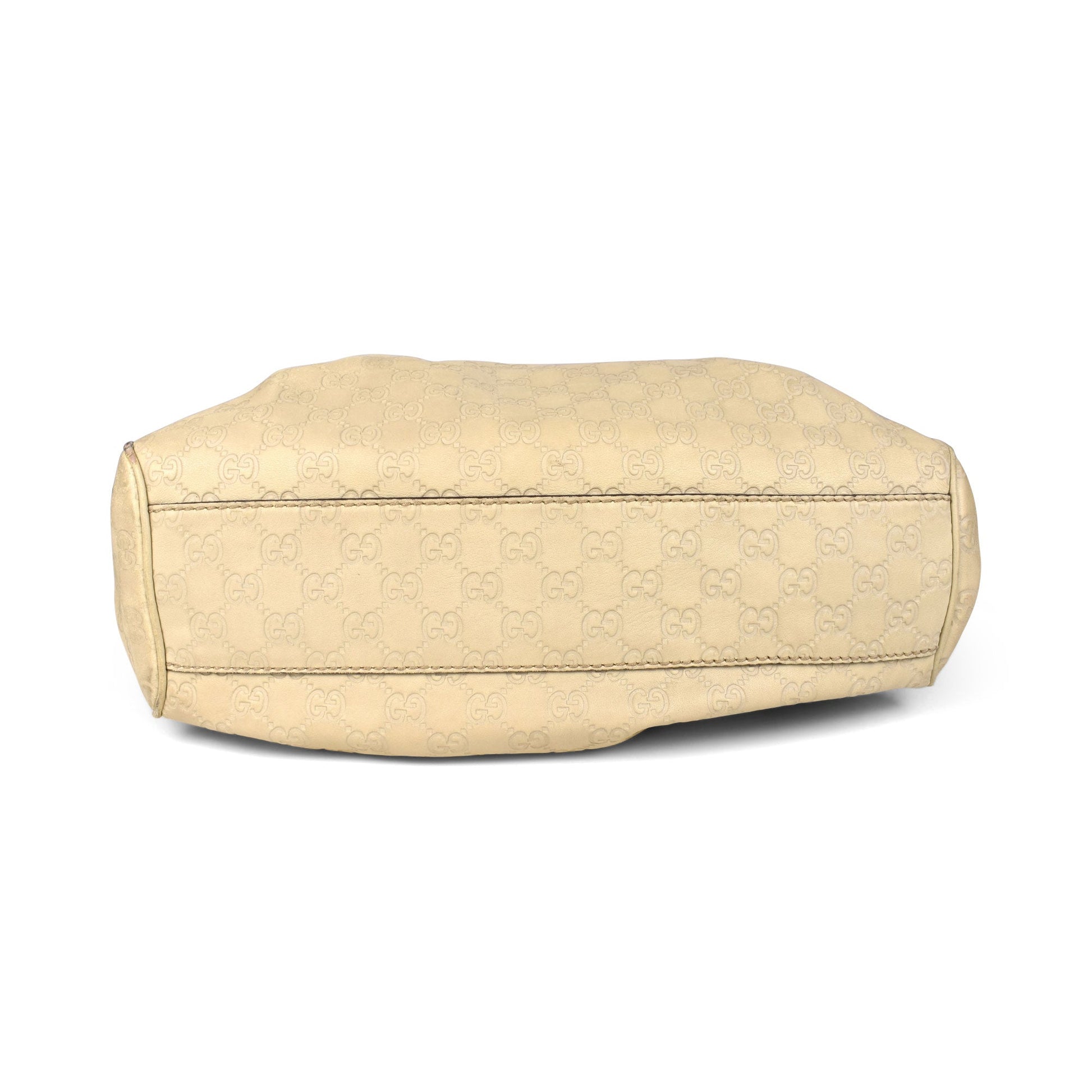 Gucci tote bag in cream 'GG' monogram embossed leather with 2 rolled top handles, a gold hardware o-ring, and a magnetic button closure. The interior is brown fabric lined with a zip pocket.