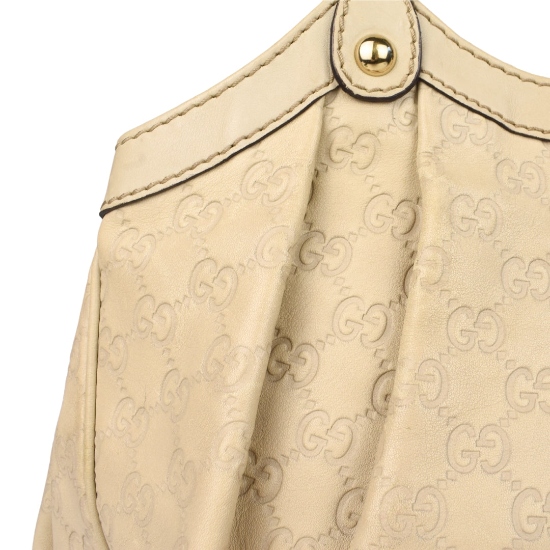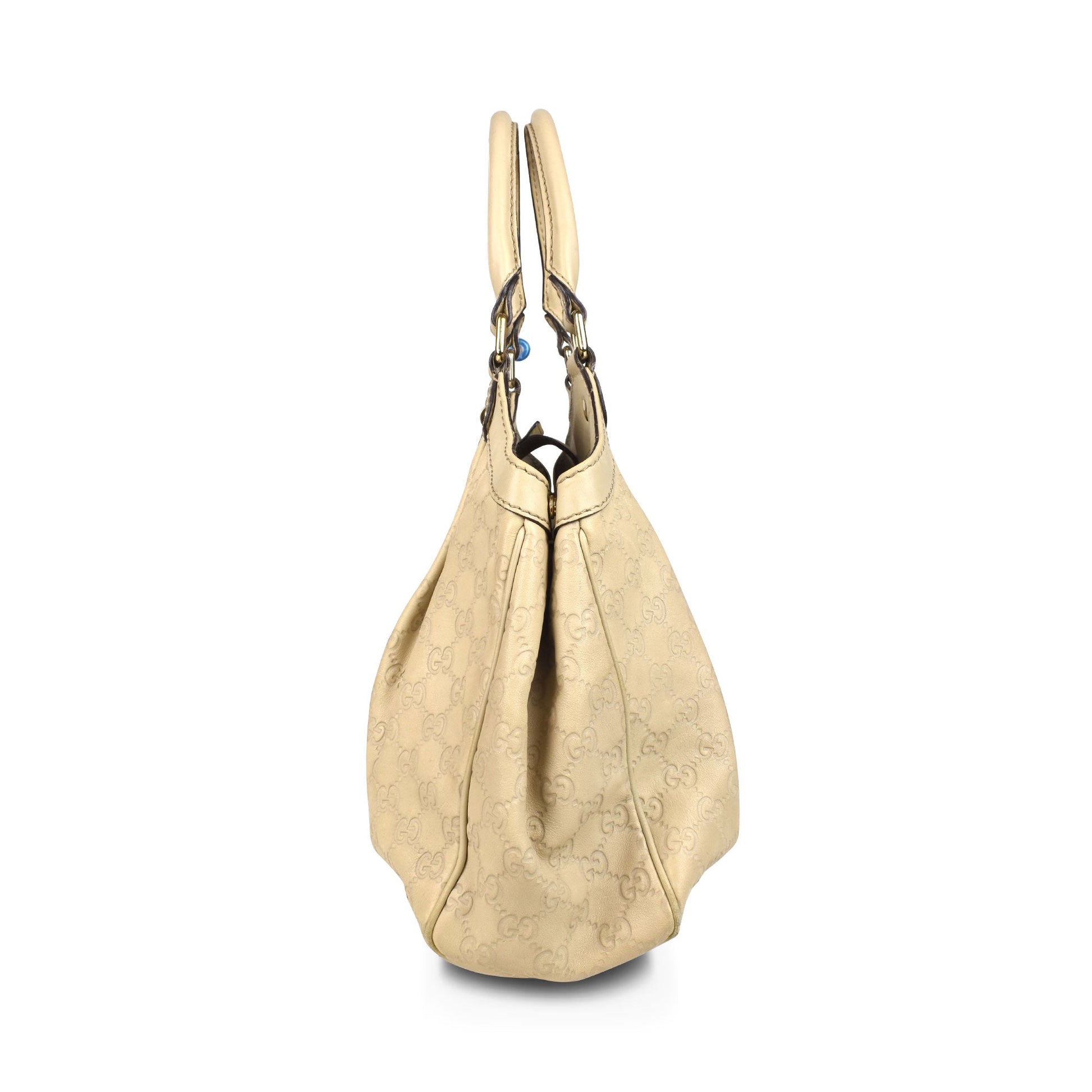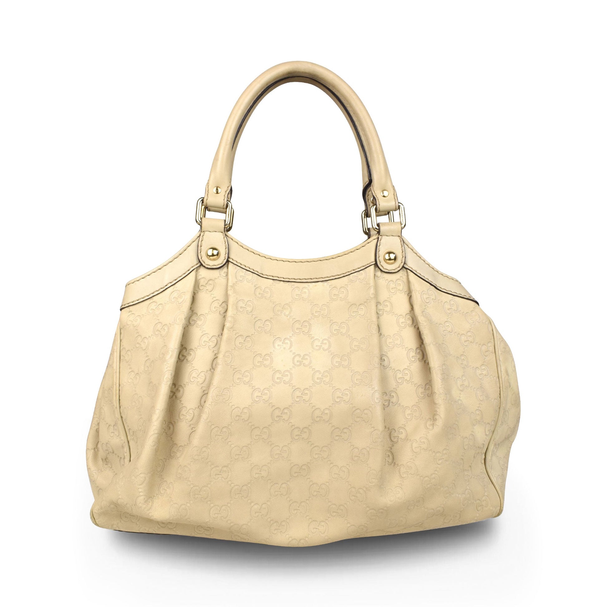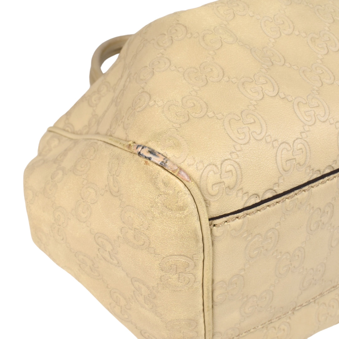 Gucci tote bag in cream 'GG' monogram embossed leather with 2 rolled top handles, a gold hardware o-ring, and a magnetic button closure. The interior is brown fabric lined with a zip pocket.