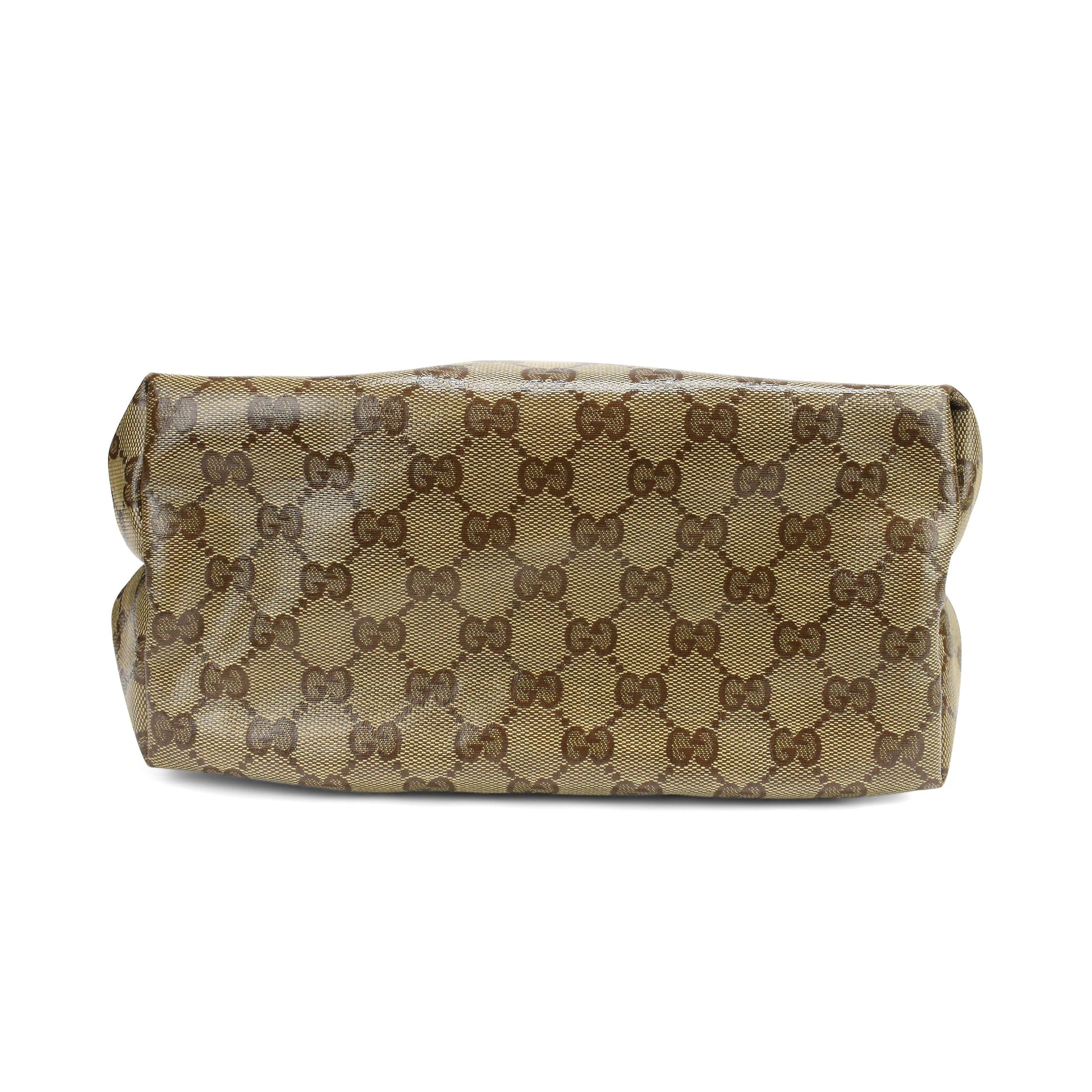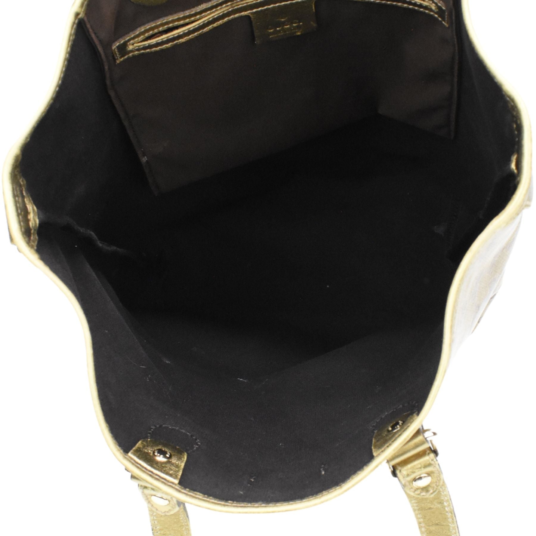 Gucci tote bag in brown logo monogram coated canvas with metallic gold leather trim. Features two flat top handles and a gold d-ring on the side. The interior is brown fabric lined.