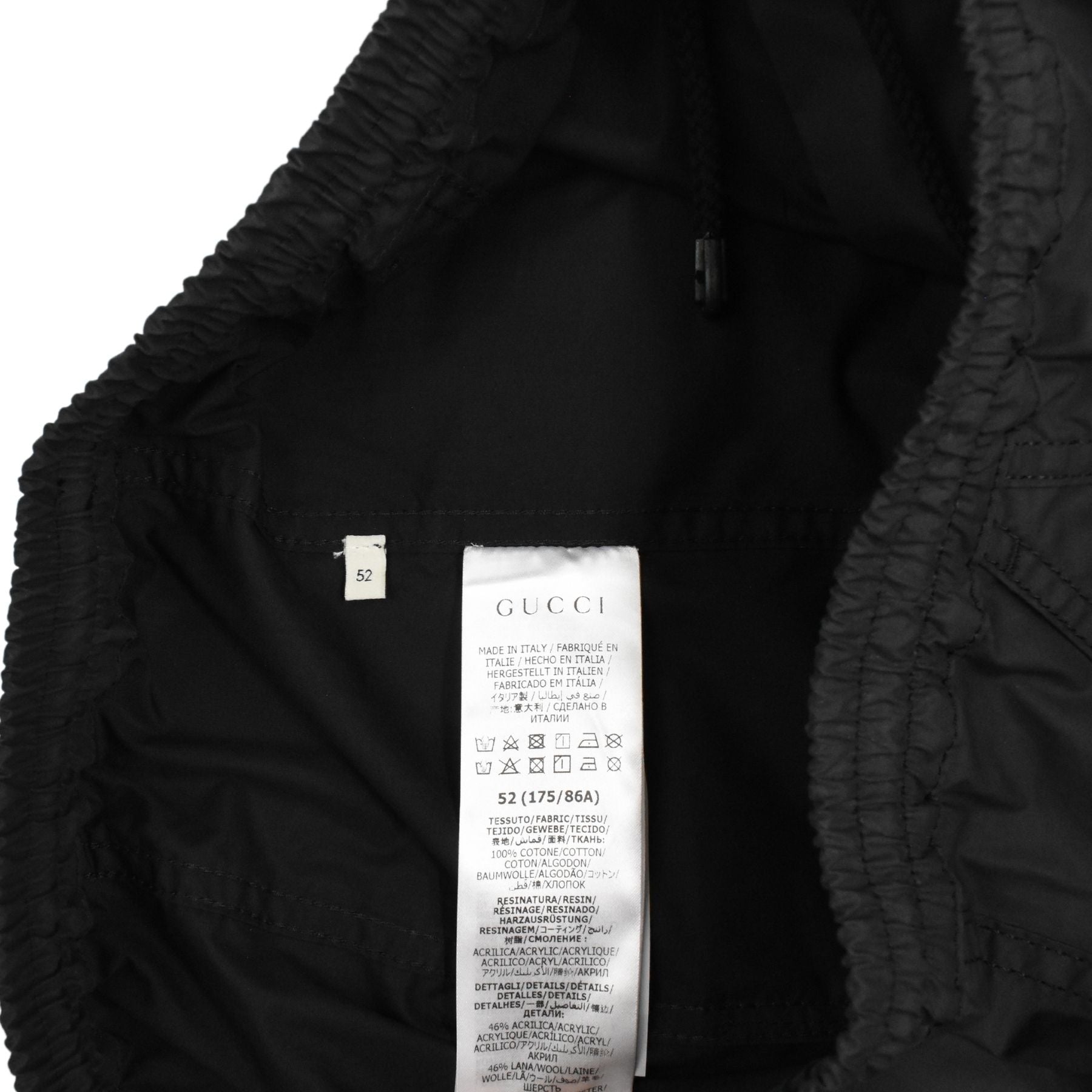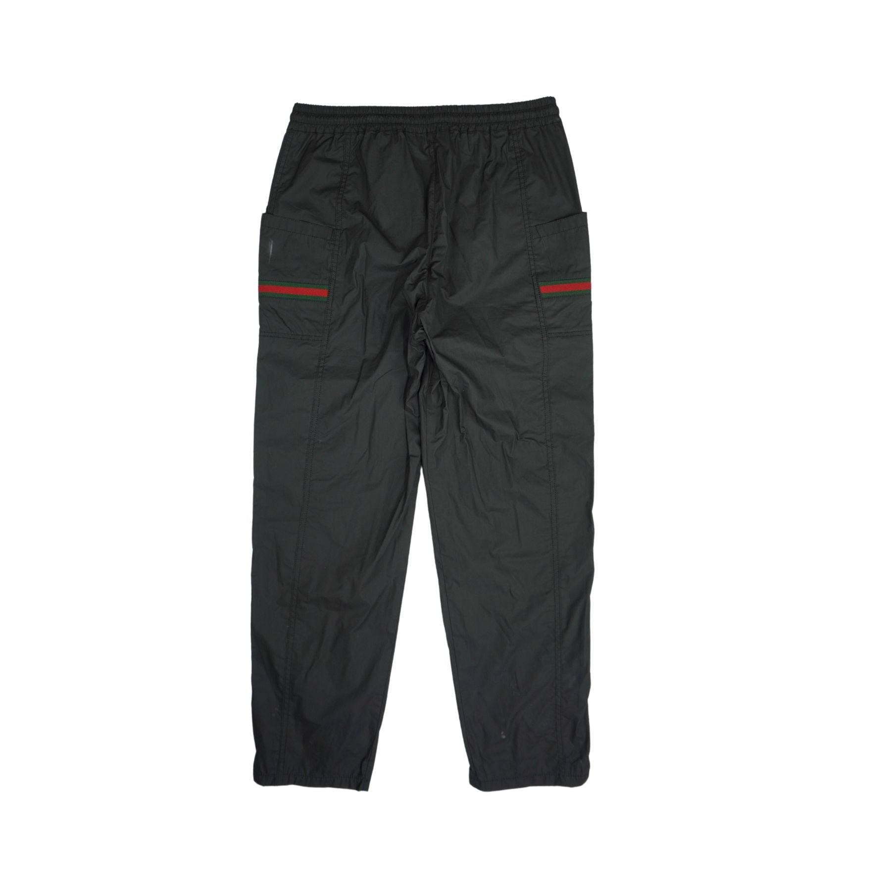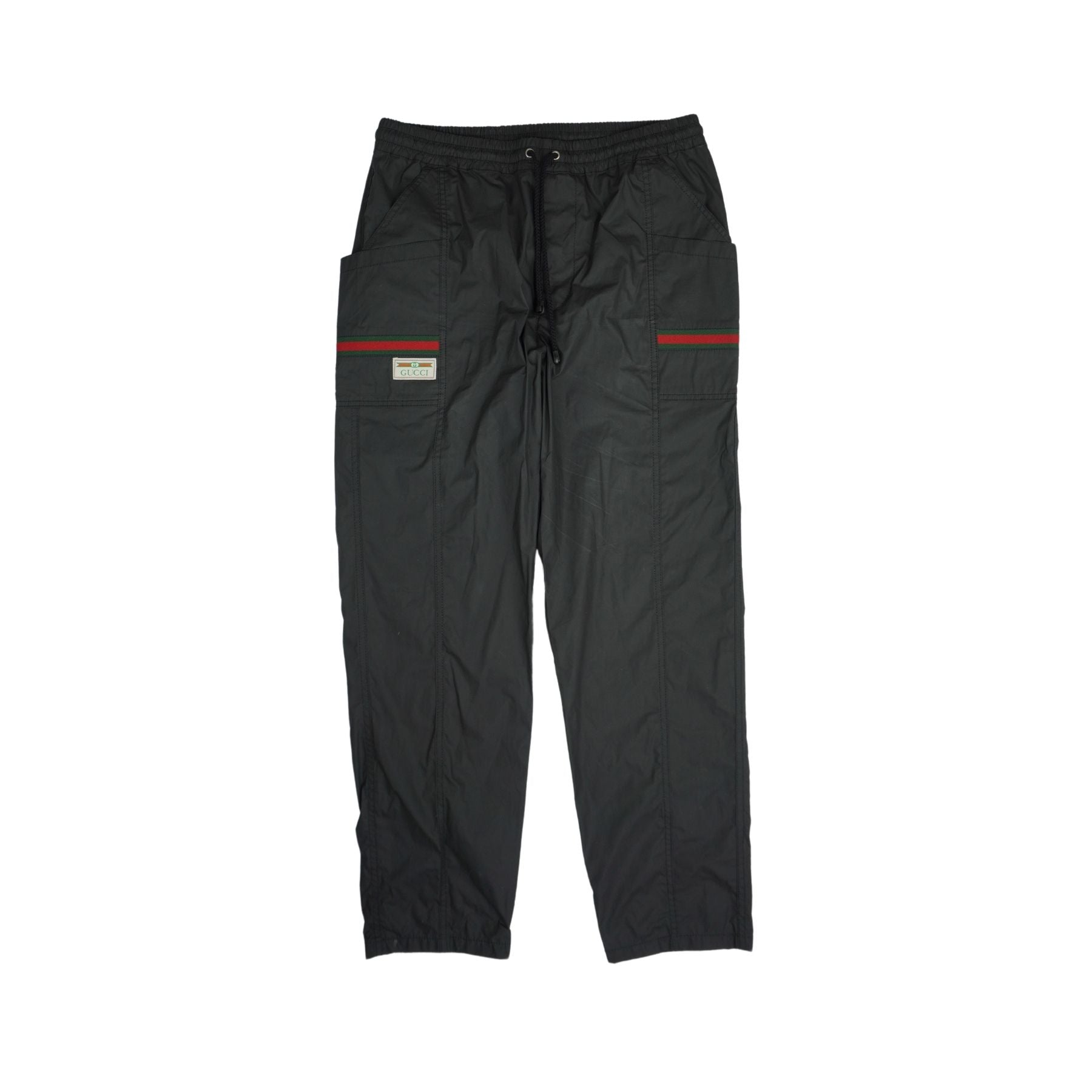 Gucci track pants in black nylon with a drawstring waistband, cargo pockets, red and green racing stripe ribbon trim, and a vintage logo patch.
