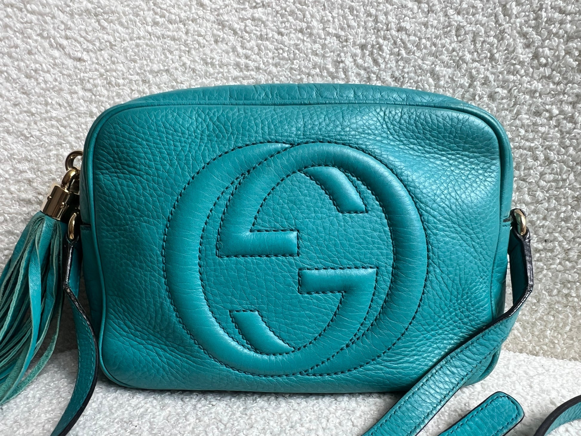 Gucci Soho Disco in Turquoise Leather with pale gold hardware. This practical, cross body, camera style bag is compact in size but still fits a reasonable amount. Can be worn over shoulder or cross body. Gucci's most popular style and goes with any outfit, dressed up or down. This turquoise shade is rare and does not come up preloved often.