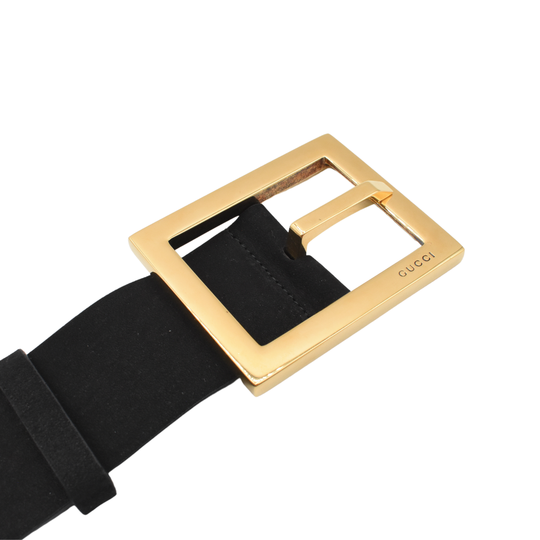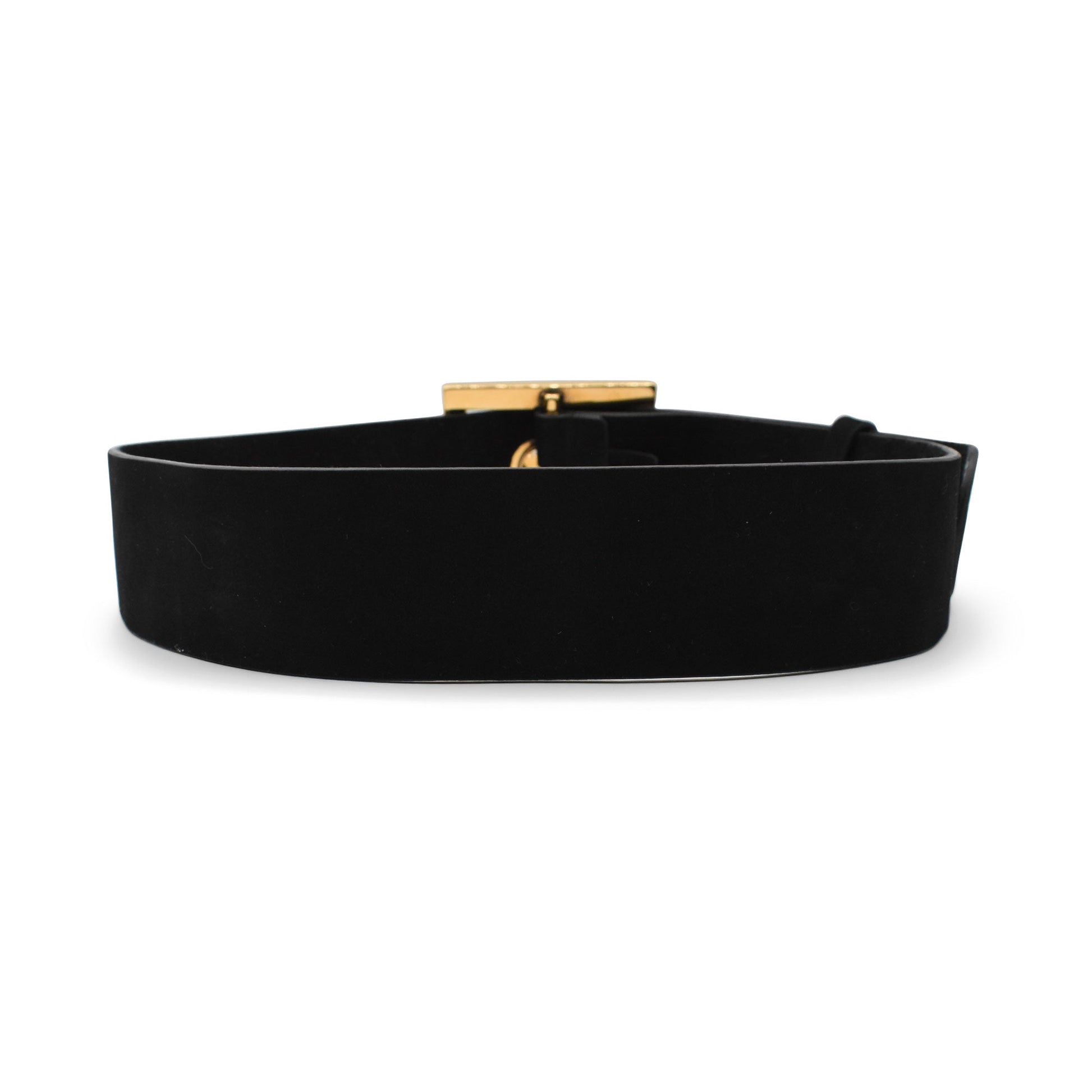Gucci thick vintage belt in black suede with a large gold square buckle and gold grommet hardware.