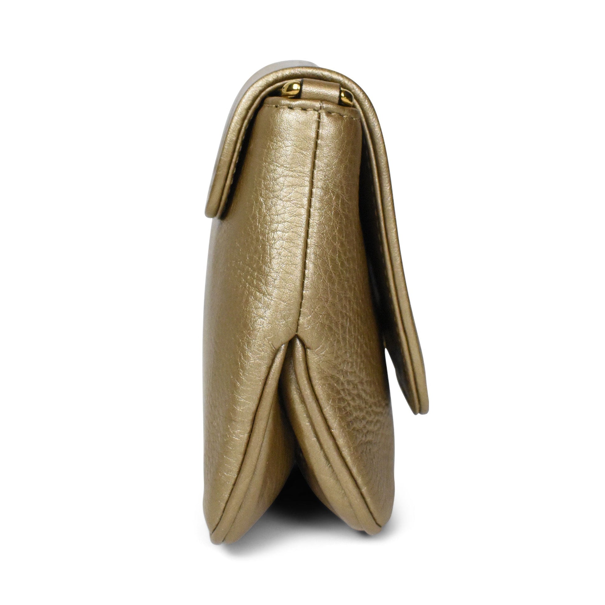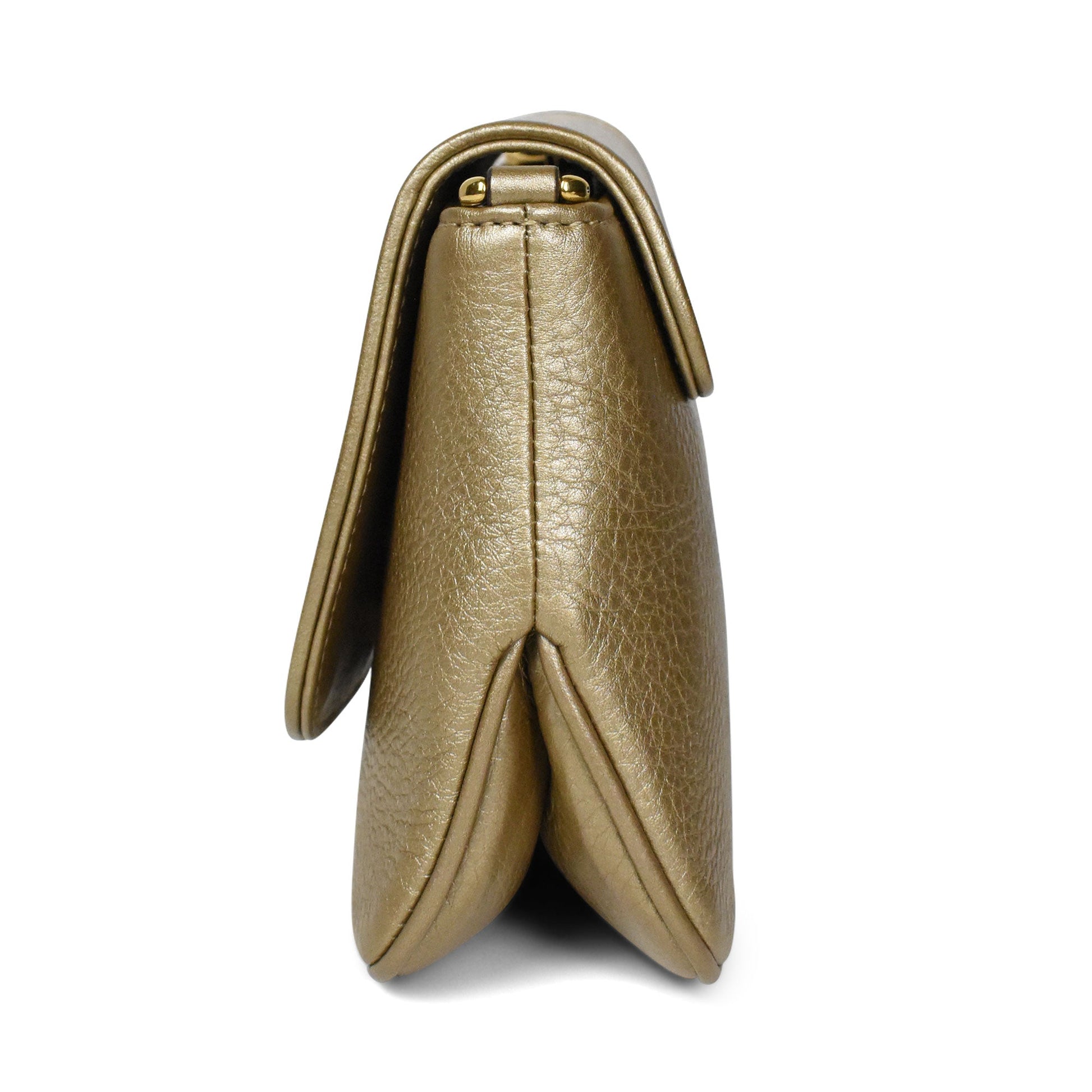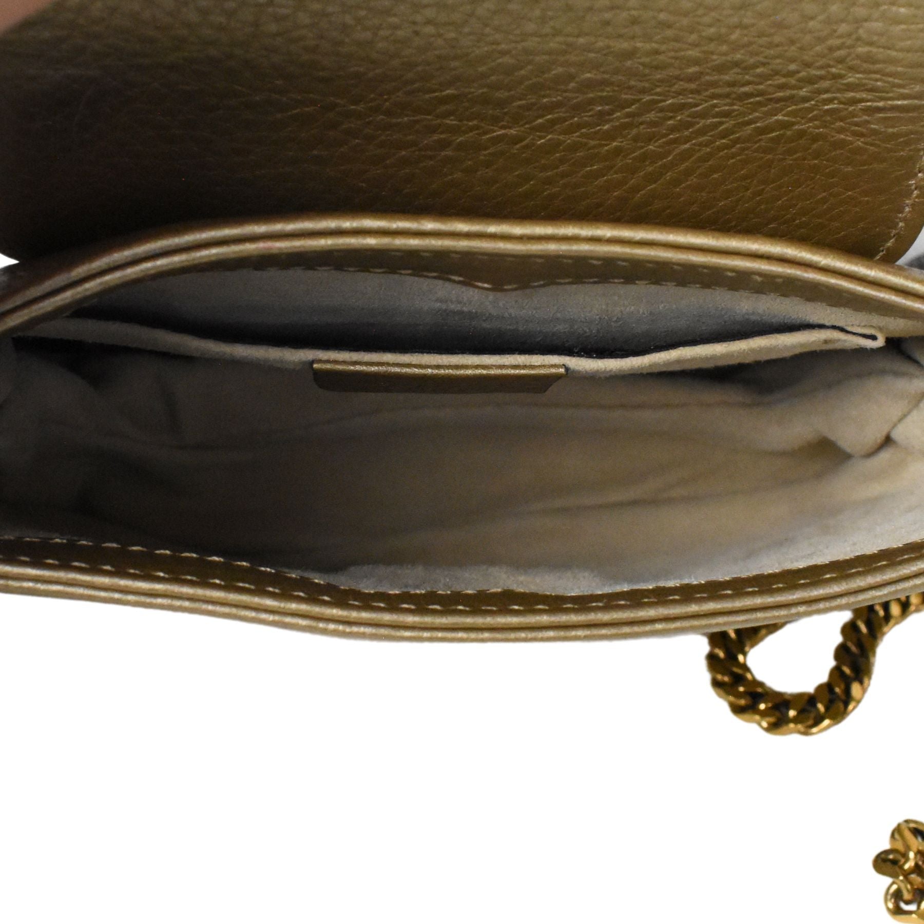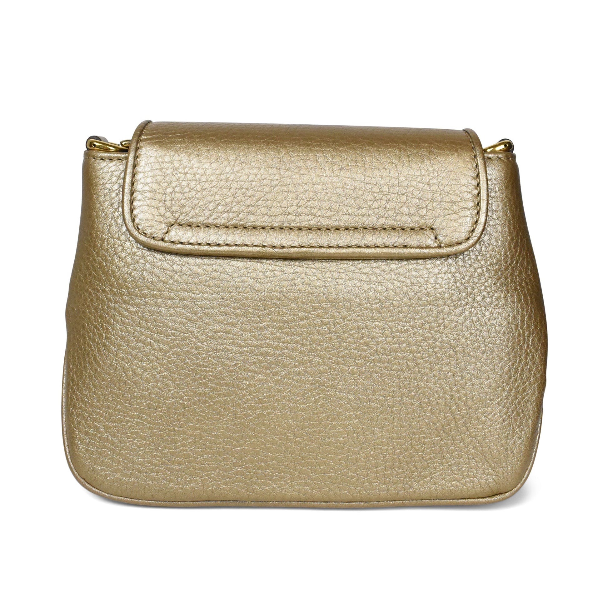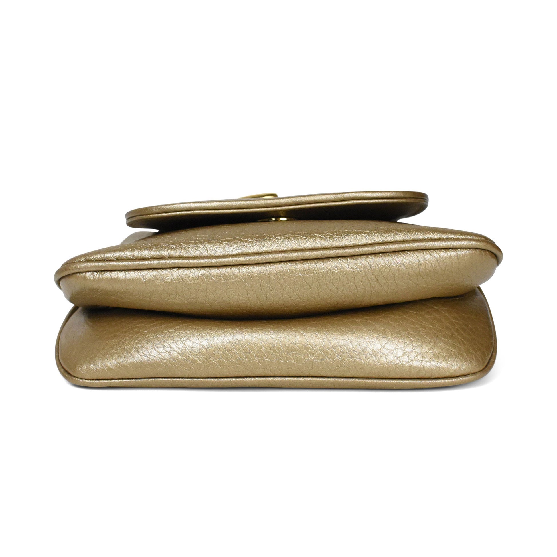 Gucci '1973' crossbody bag in gold grained leather with a long crossbody gold hardware strap. Features a magnetic top flap closure with gold hardware logo on the front. The interior is beige suede lined with a slip pocket.