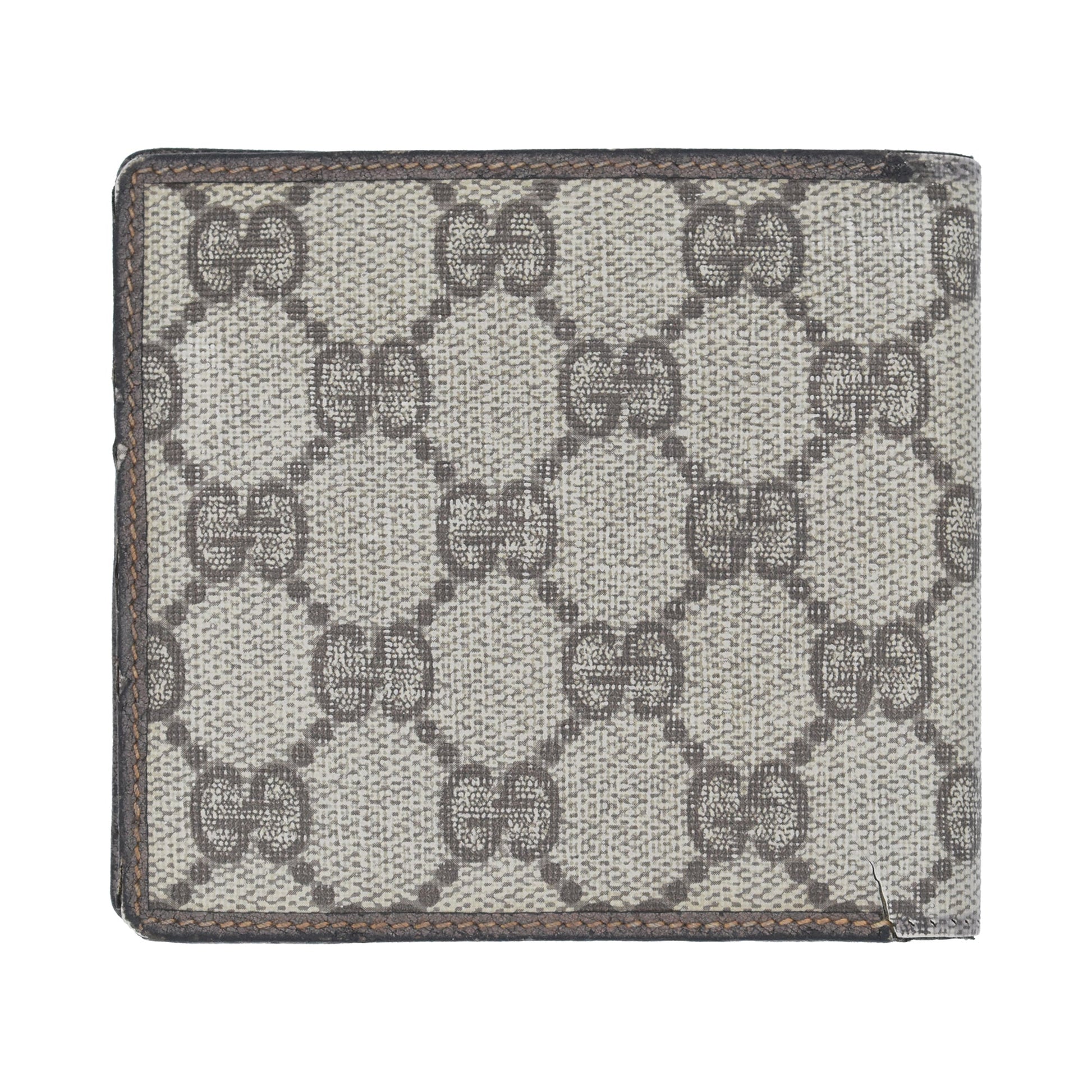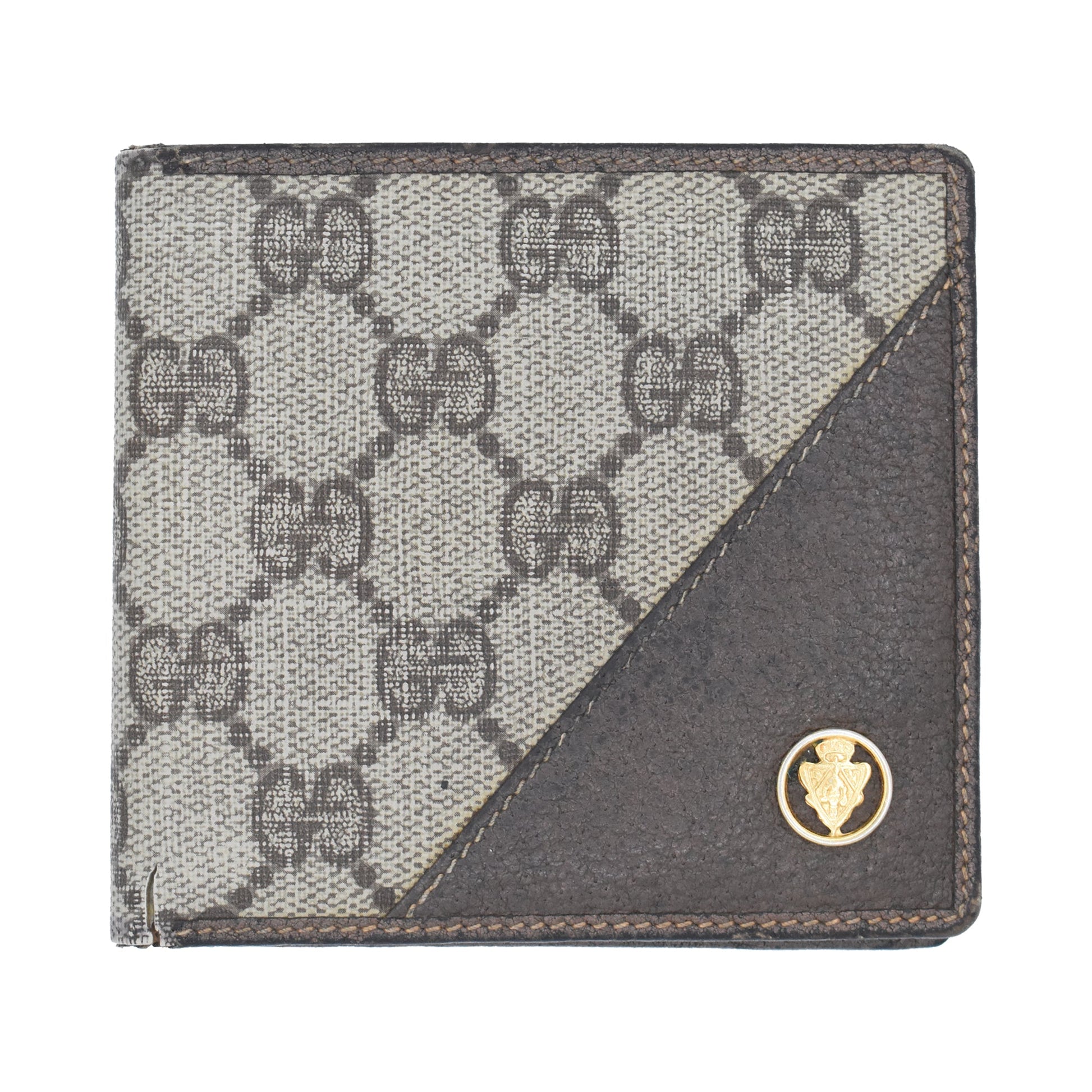 Gucci vintage bi-fold wallet in beige monogram coated canvas with brown leather trim and a leather corner on the front. Features a gold hardware logo crest on the front. The interior is brown leather lined with multiple card slots, a slip pocket, and a coin pouch.