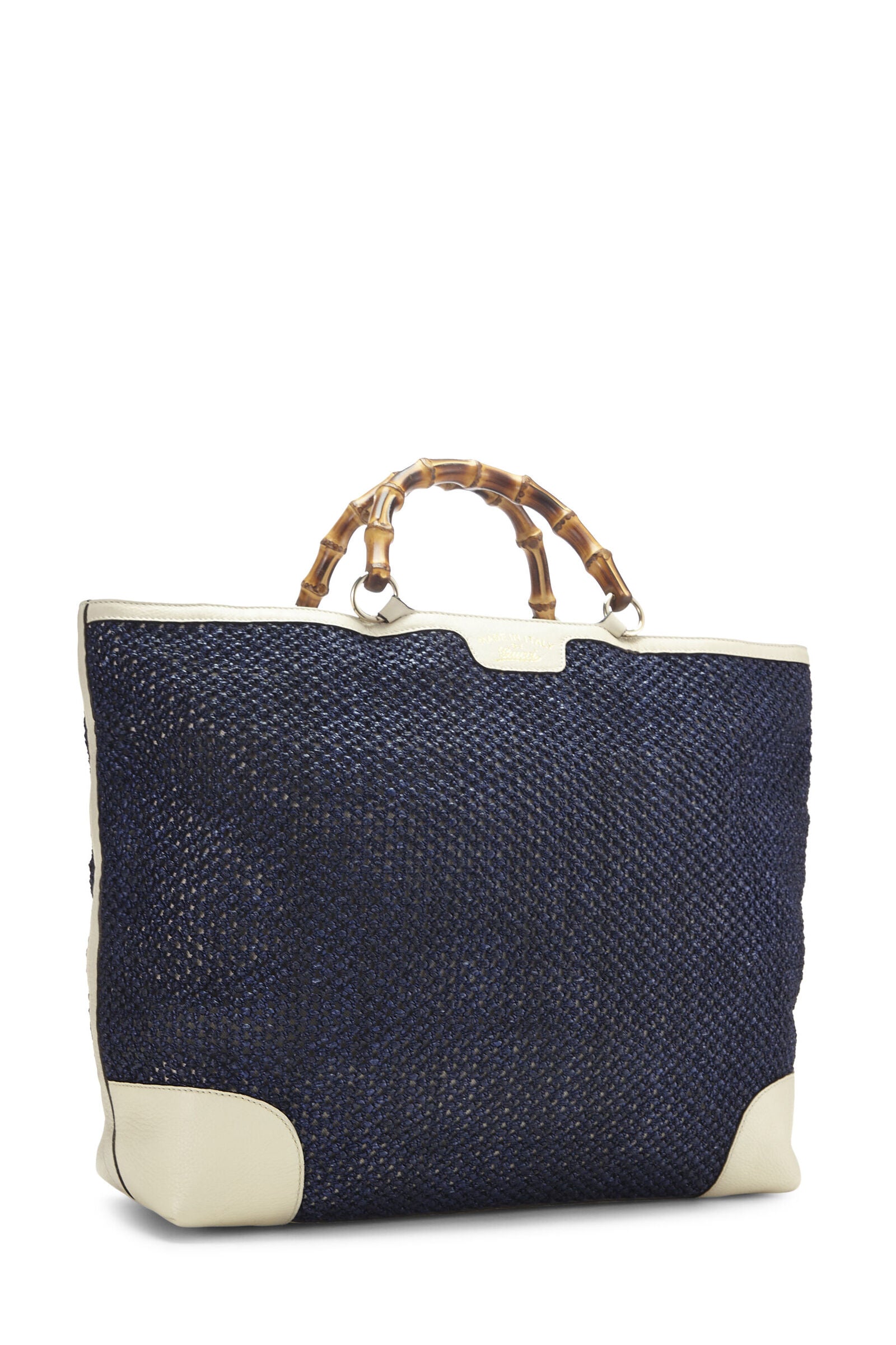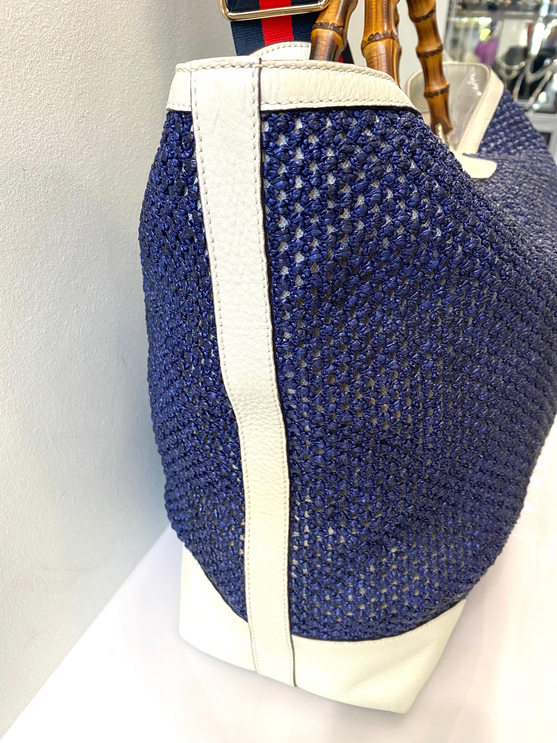 A chic and spacious tote bag ready to accompany you to the beach. Rendered in a wonderful mix of straw, leather and canvas, the blue straw contrasts beautifully. Finished with gold-tone hardware and features two bamboo top handles.