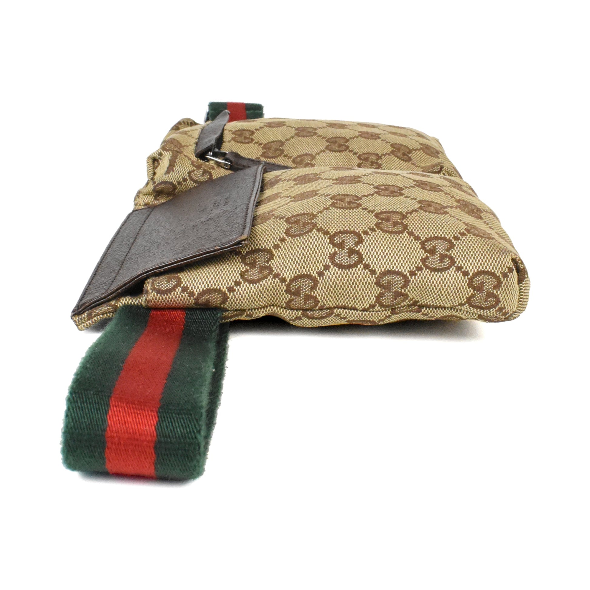 Gucci waist bag in brown monogram canvas with two main pockets. Features a brown leather velcro flap closure on one pocket, a zip closure on the other pocket with brown leather trim, a red and green racing canvas stripe strap, and a buckle in silver hardware.
