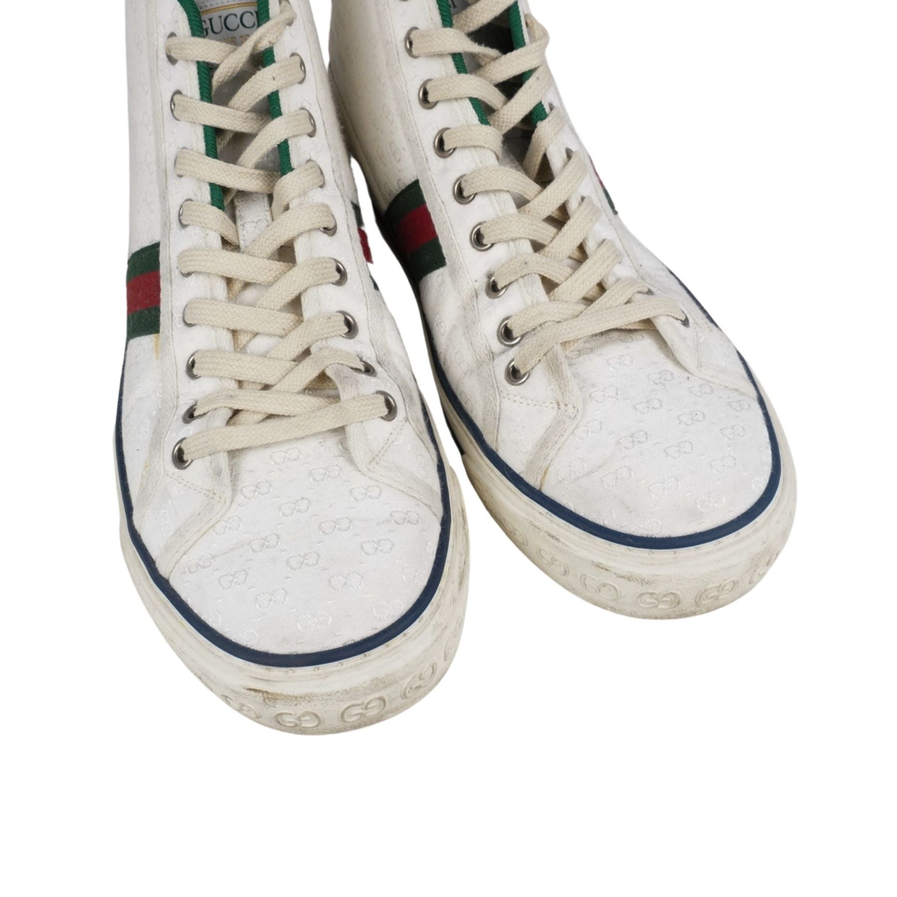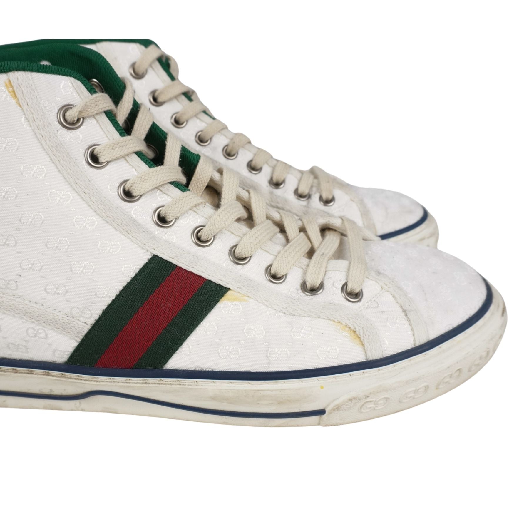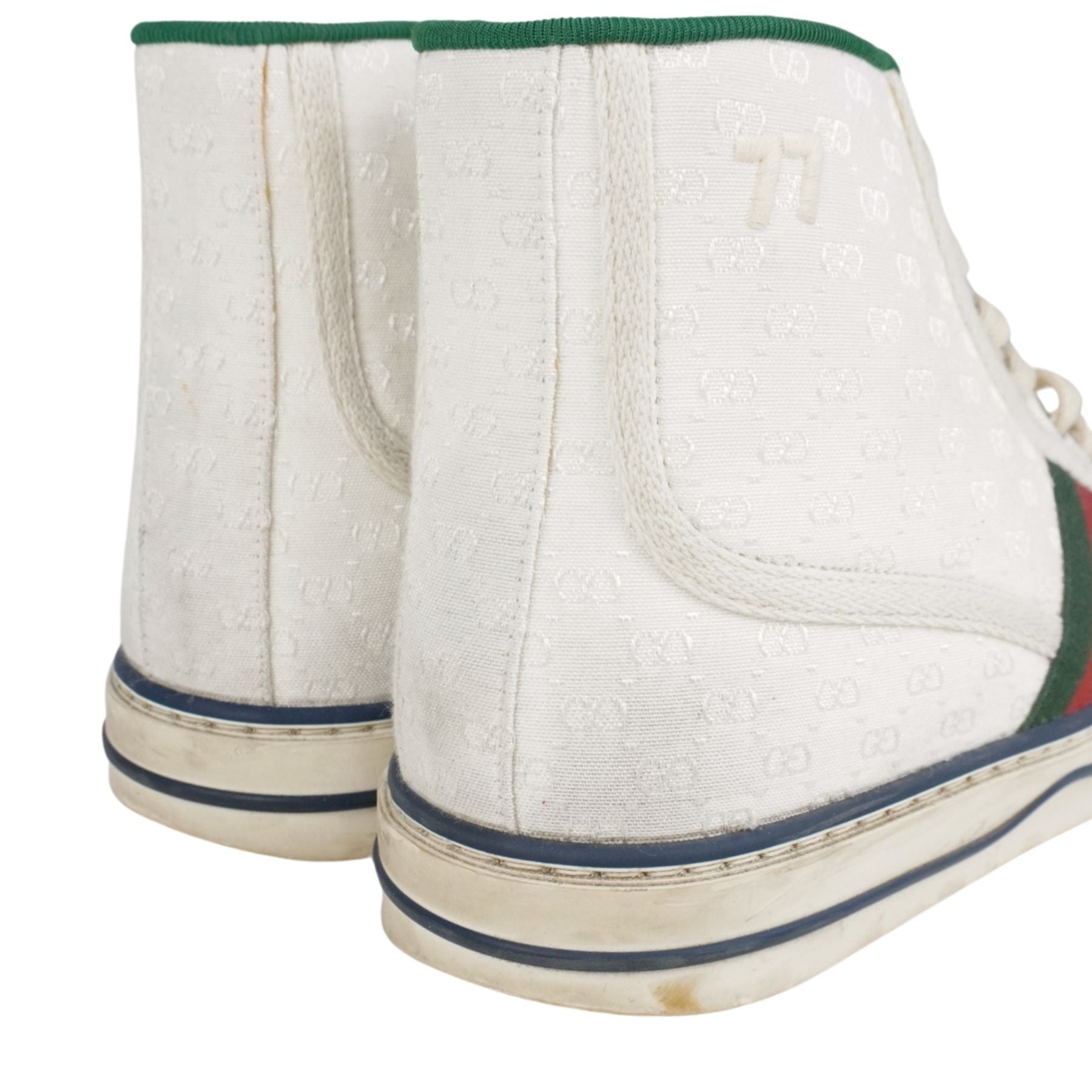 Gucci 'Tennis 1977' high-top sneakers in white canvas monogram with a green trim, web racing stripe, and a lace-up closure. Features a rubber and stripe sole with GG logo.
