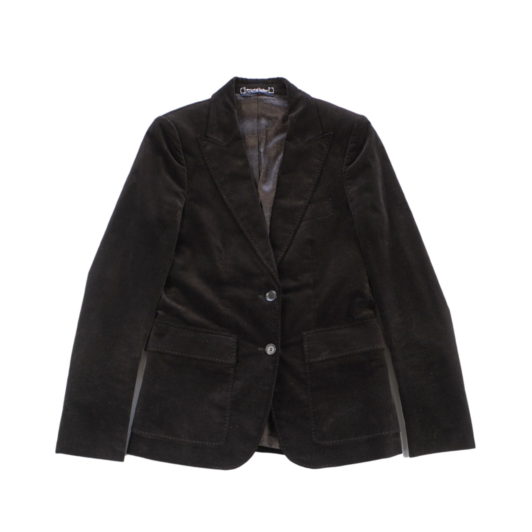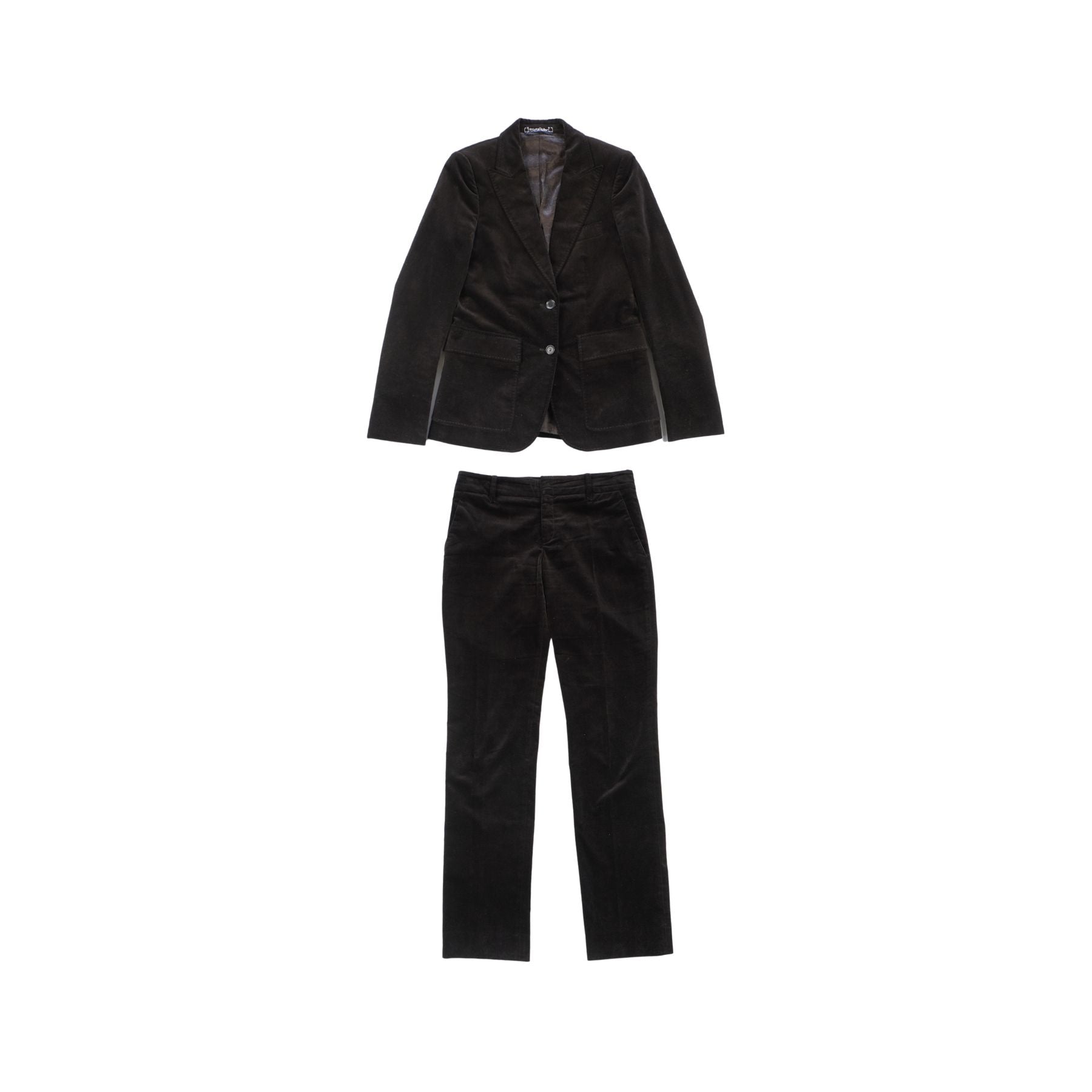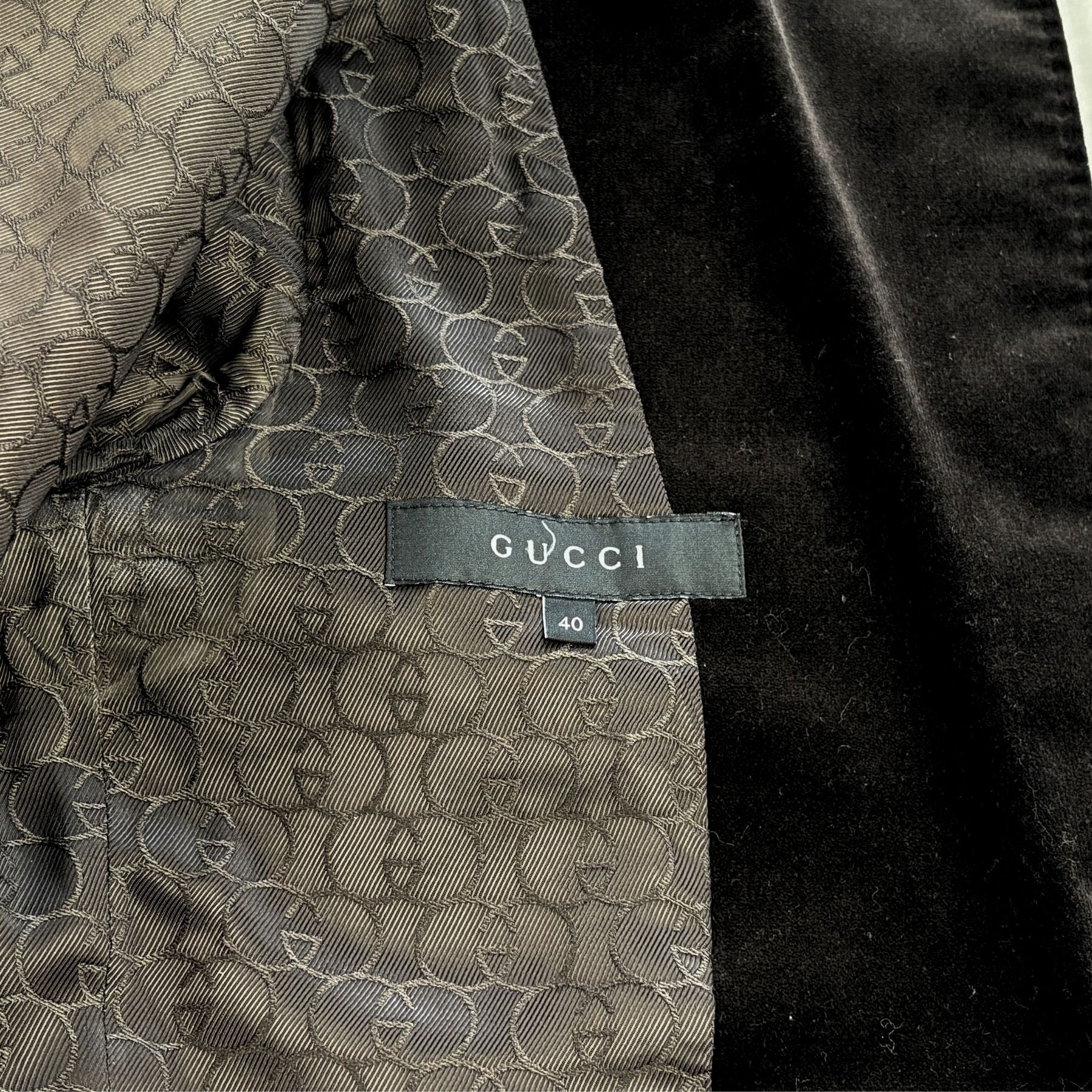 Gucci dark brown velour suit with a single breasted blazer, a peak collar, flap pockets and satin GG monogram lining. Includes matching mid-rise straight leg pants.