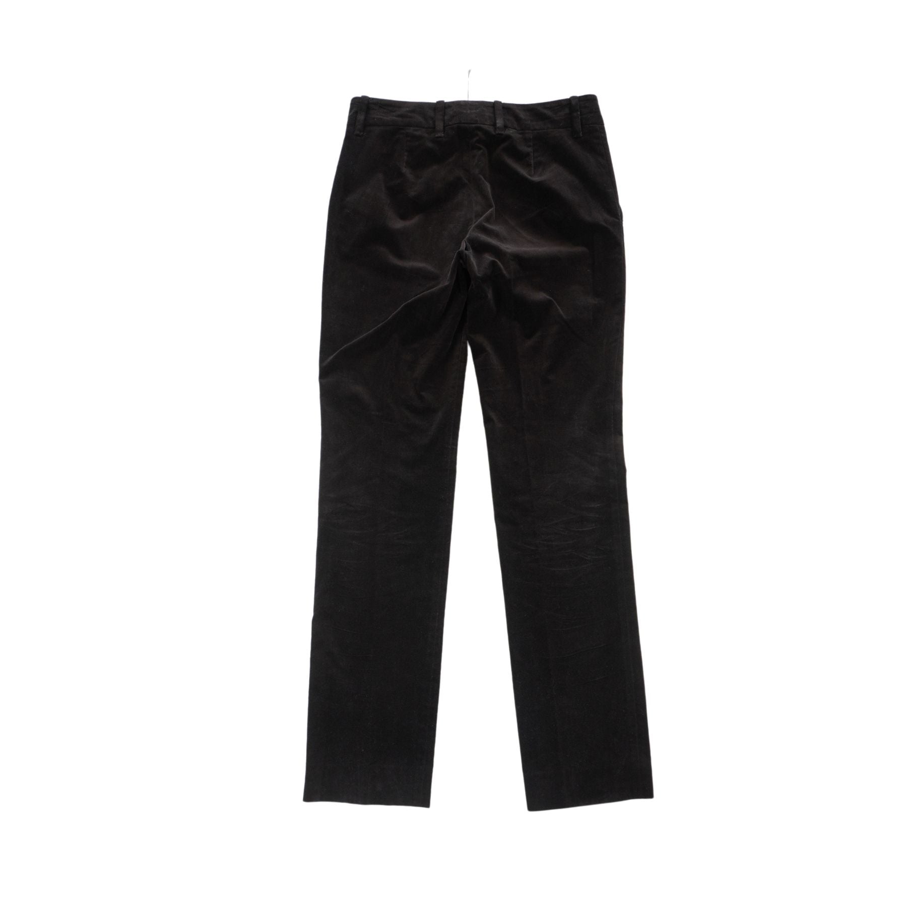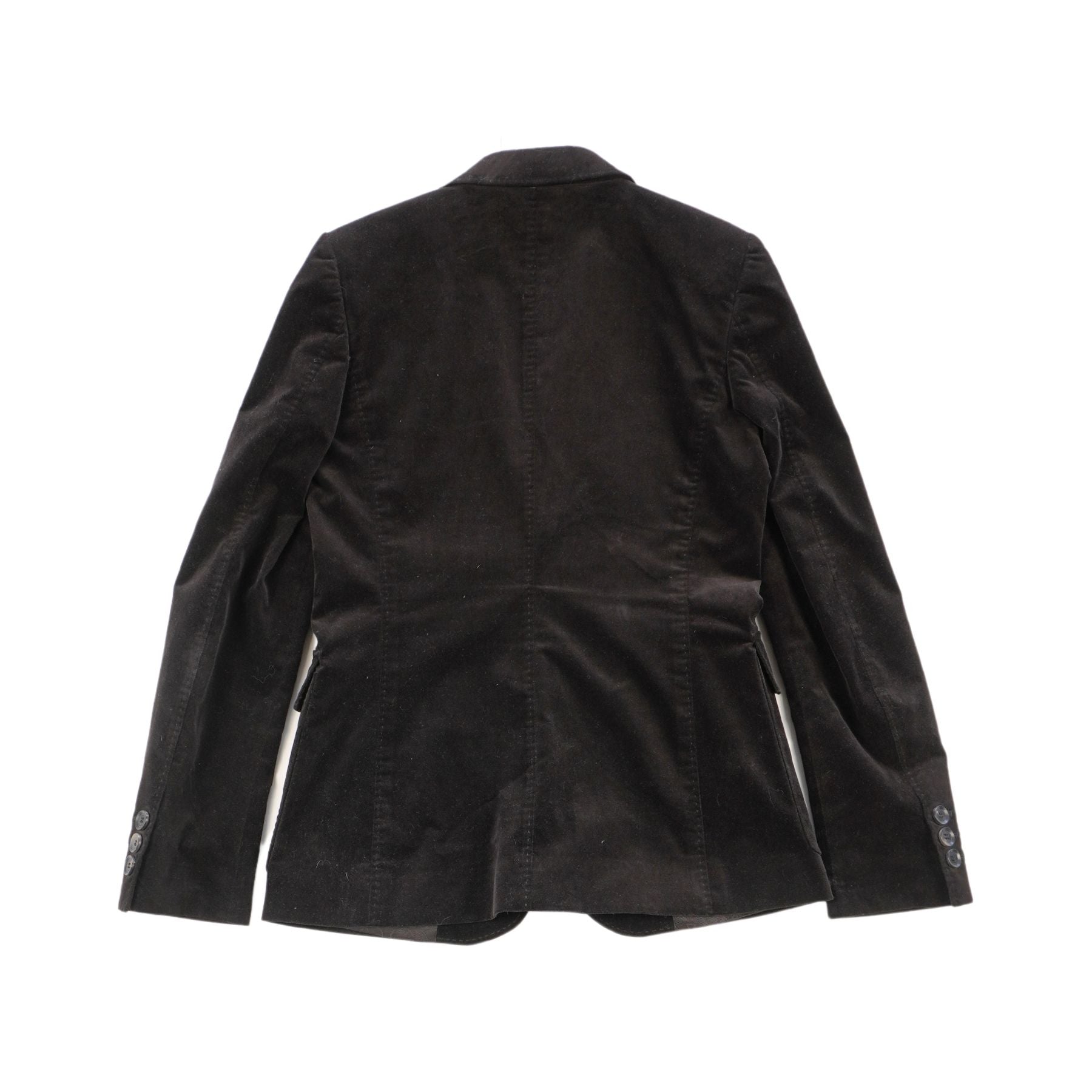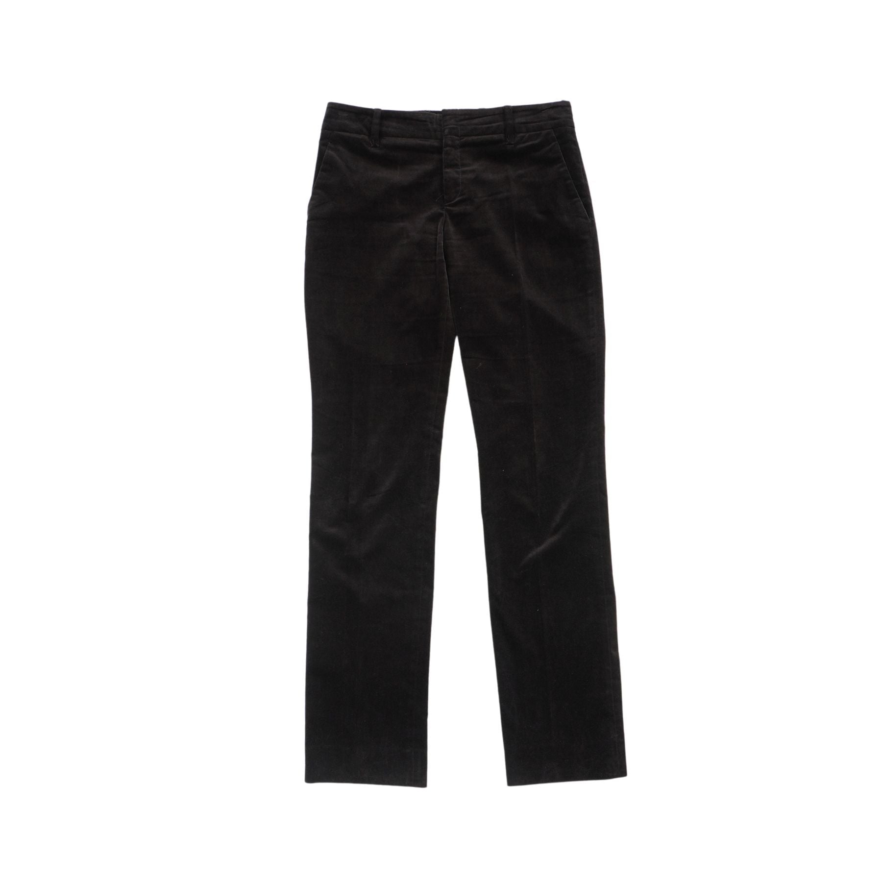Gucci dark brown velour suit with a single breasted blazer, a peak collar, flap pockets and satin GG monogram lining. Includes matching mid-rise straight leg pants.