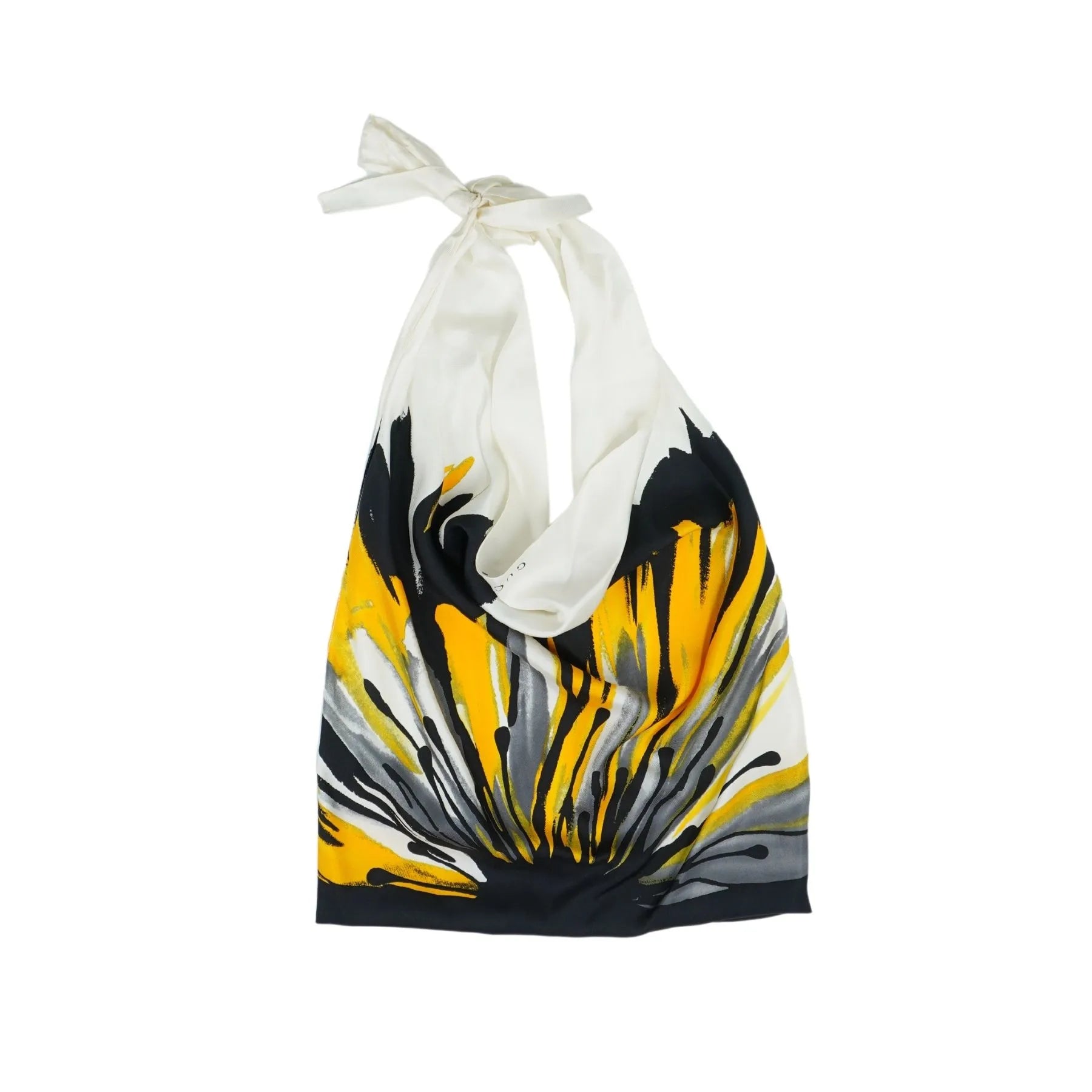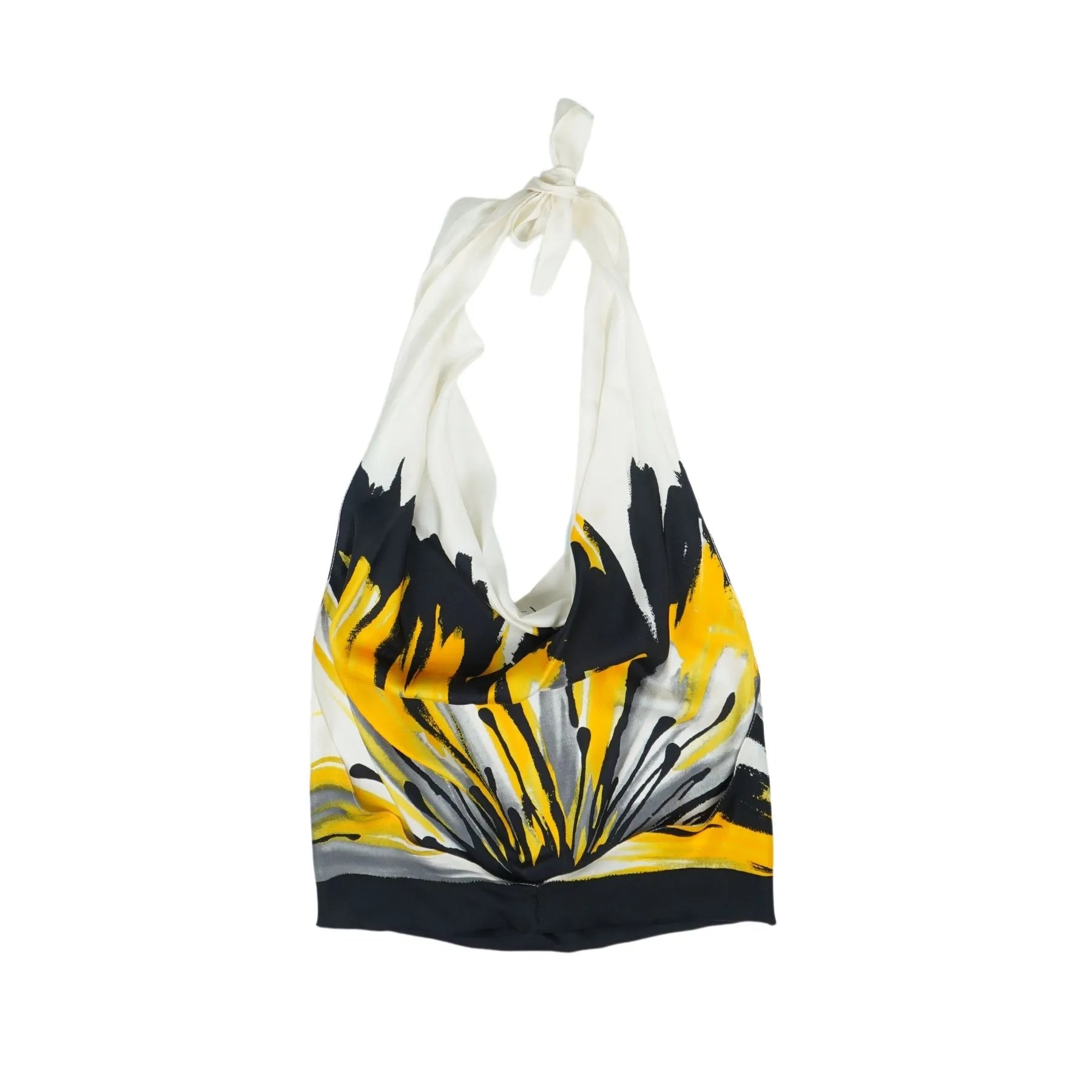Gucci re-worked scarf top in black, white, yellow and grey abstract platter printed with a Gucci logo.