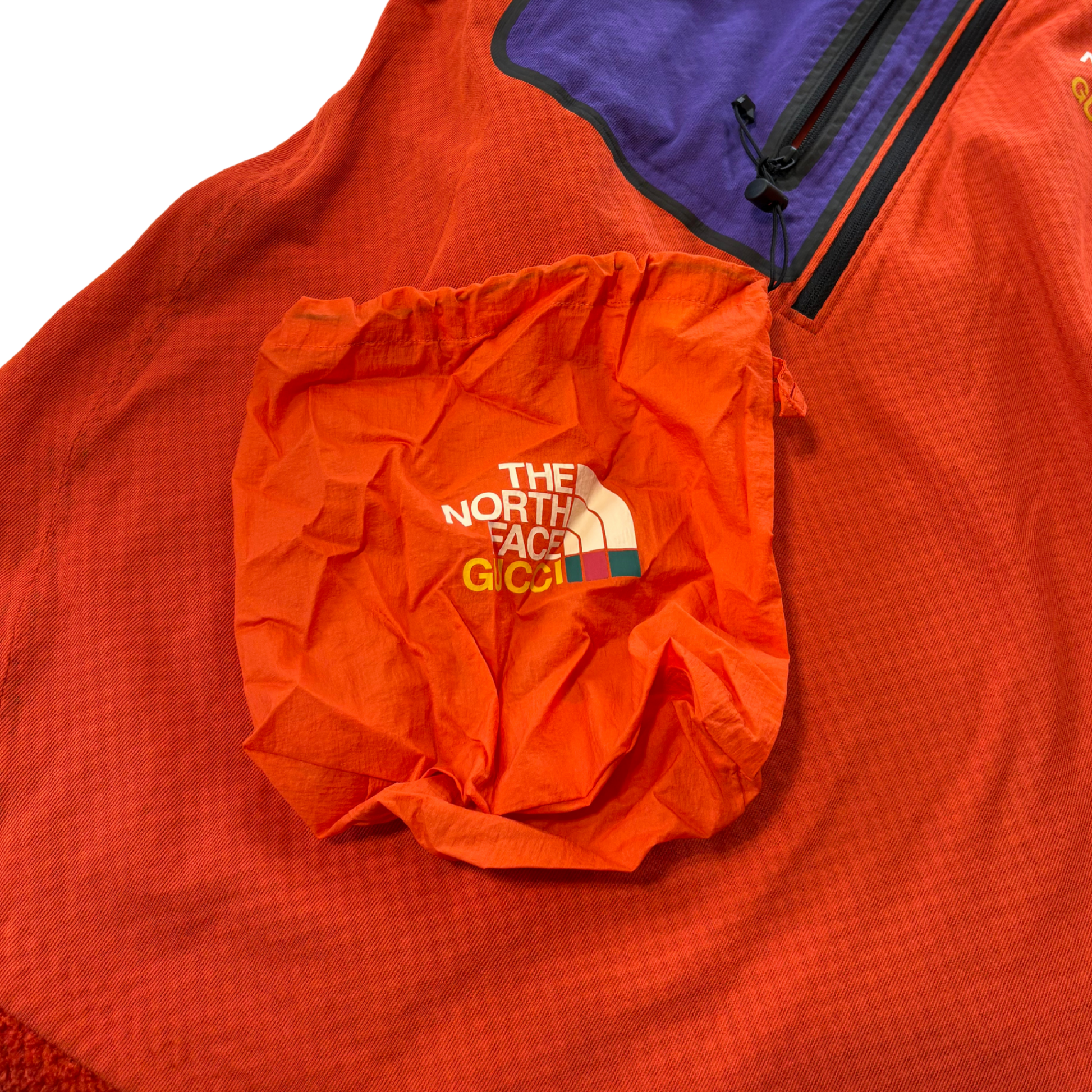 Gucci x The North Face packable pullover hoodie in an orange lightweight technical jersey fleece with black trim, a half-zip opening in black hardware, a large purple chest pocket, and a logo graphic on the chest and back.