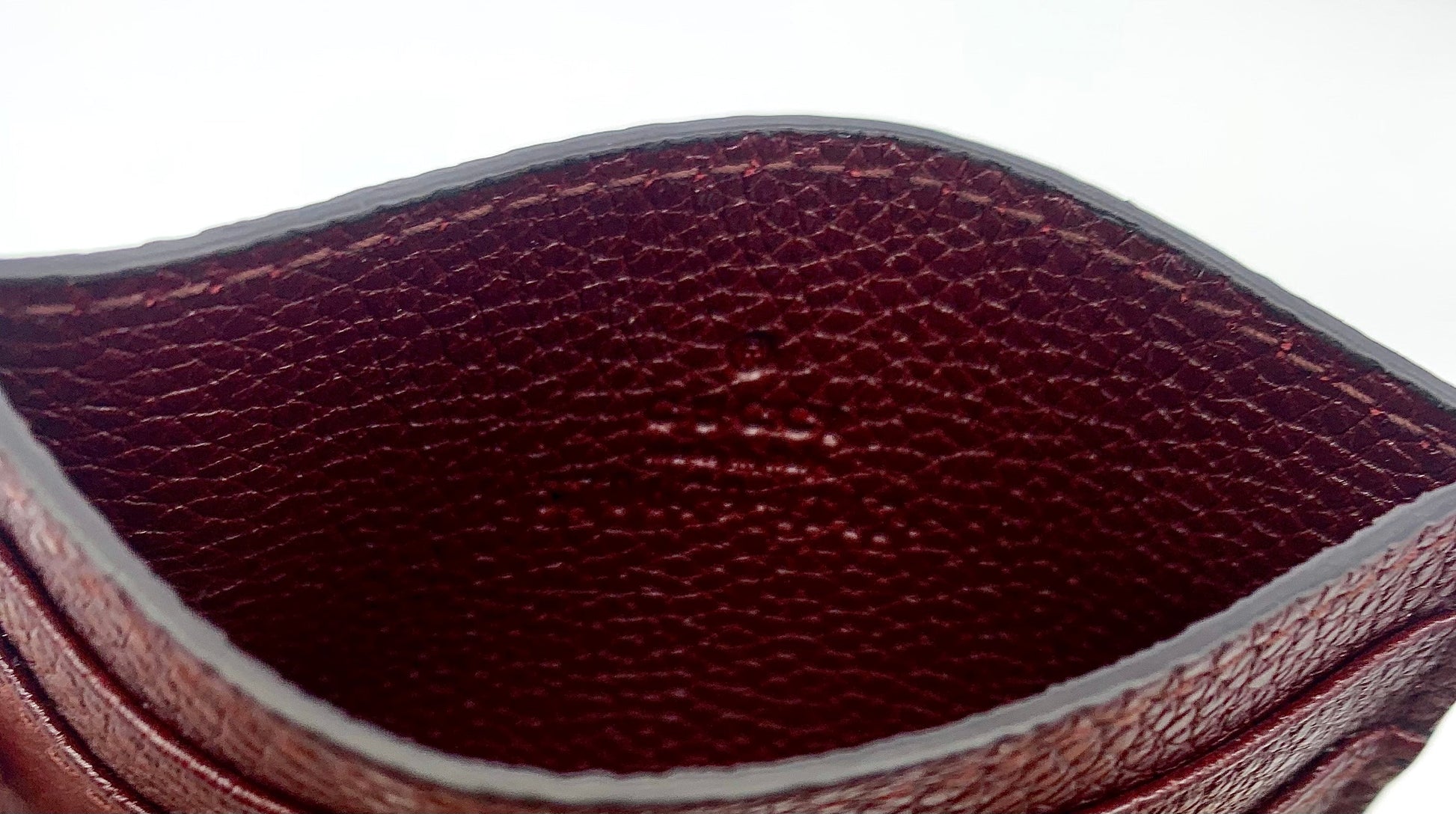 This slim profile card holder is crafted of textured leather with silver and gold-tone horsebit interlocking GG hardware. The front has two card slots and the back has two card slots. Gucci logo is embossed on the interior.