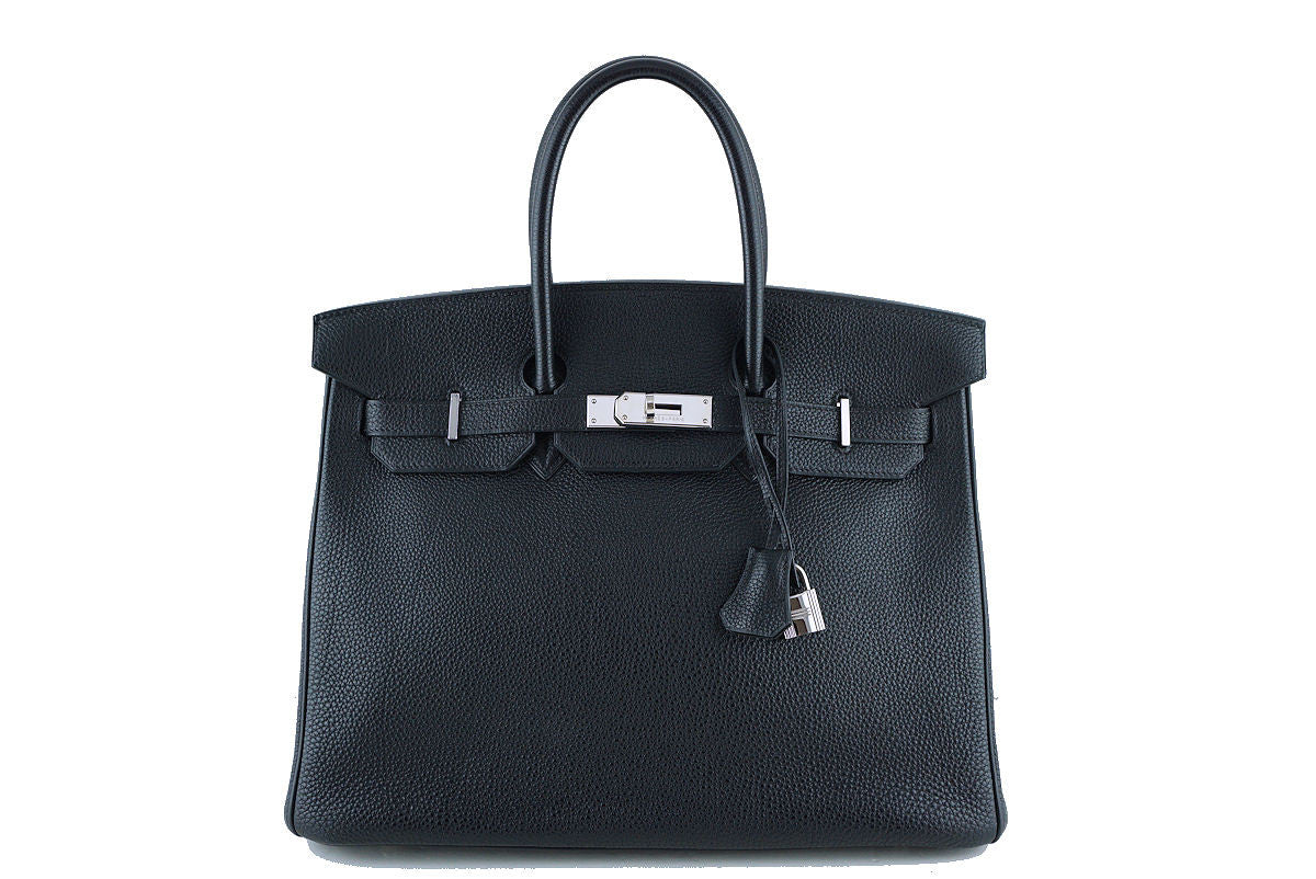 The Hermes Birkin is probably one of the most coveted and desired bags in the world. Currently, the Togo baby bull 35cm Birkin is extremely difficult to find in Black with Palladium Hardware, particularly in this condition.