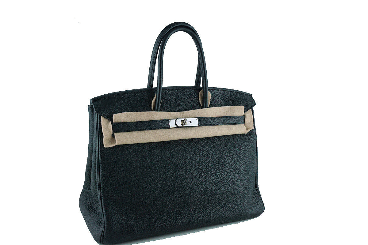 The Hermes Birkin is probably one of the most coveted and desired bags in the world. Currently, the Togo baby bull 35cm Birkin is extremely difficult to find in Black with Palladium Hardware, particularly in this condition.