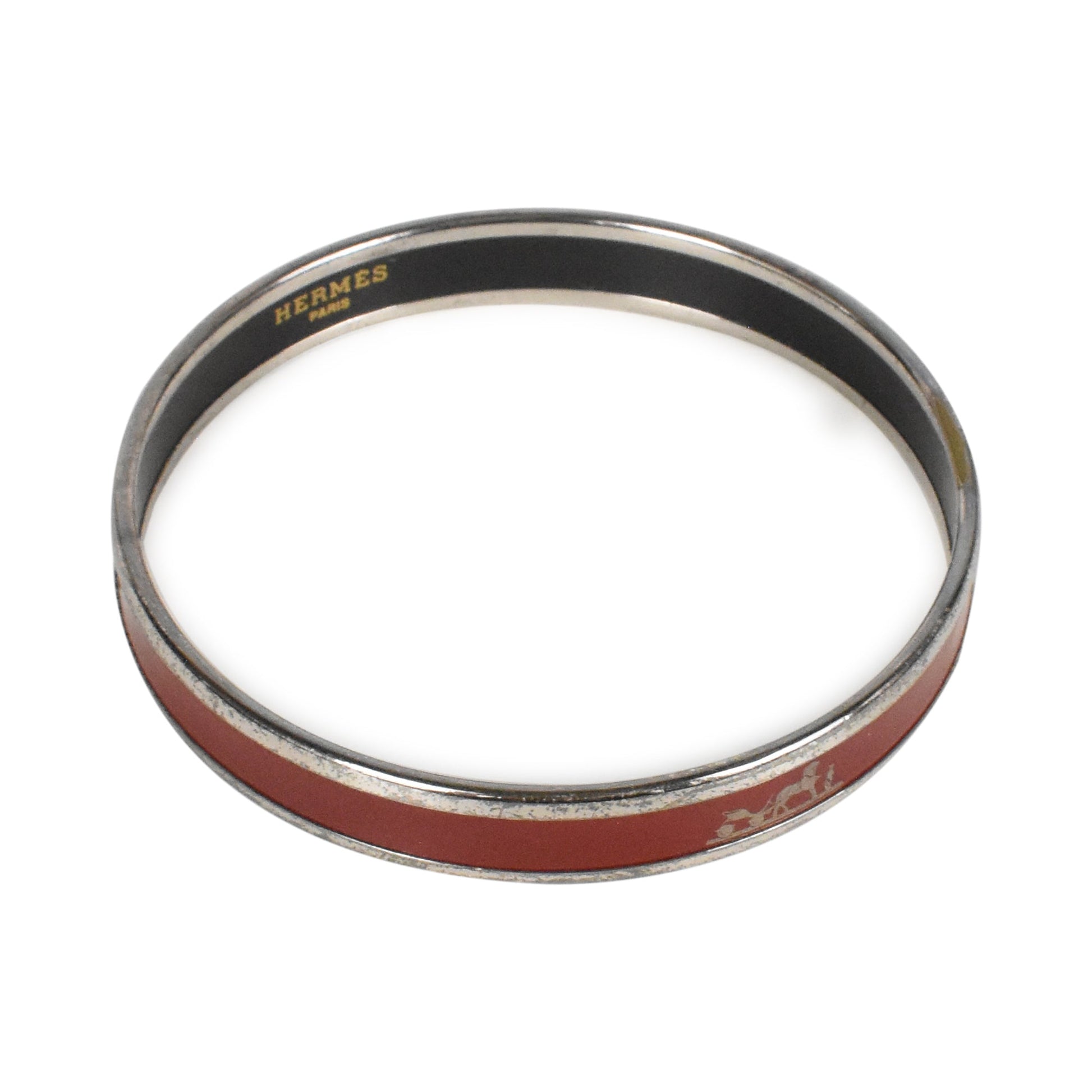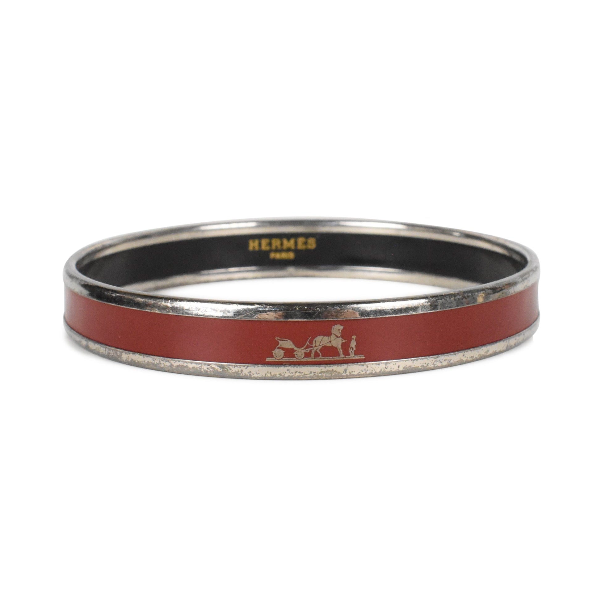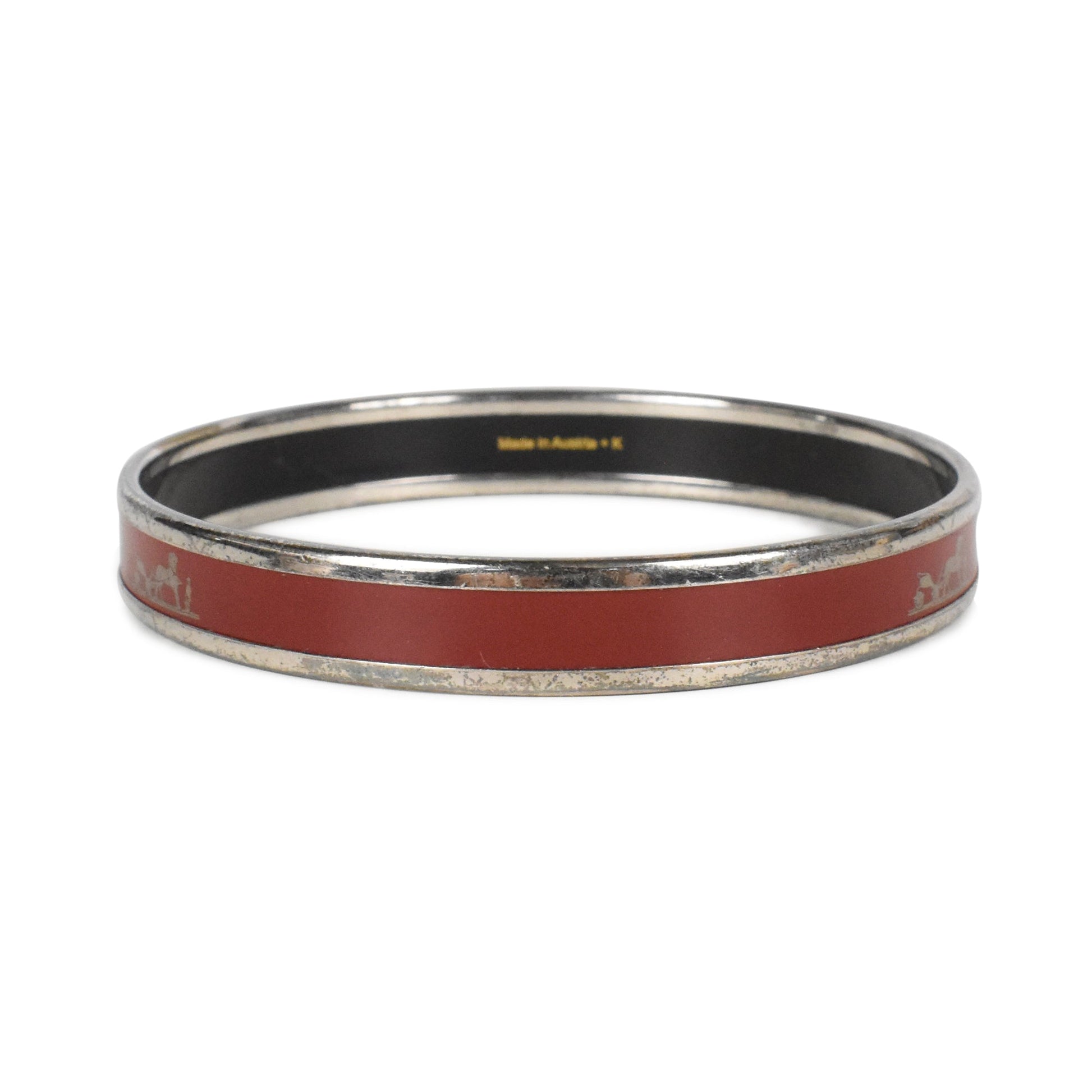 Hermes thin bangle bracelet in silver with burgundy red enamel inlay. Features logos on the perimeter.