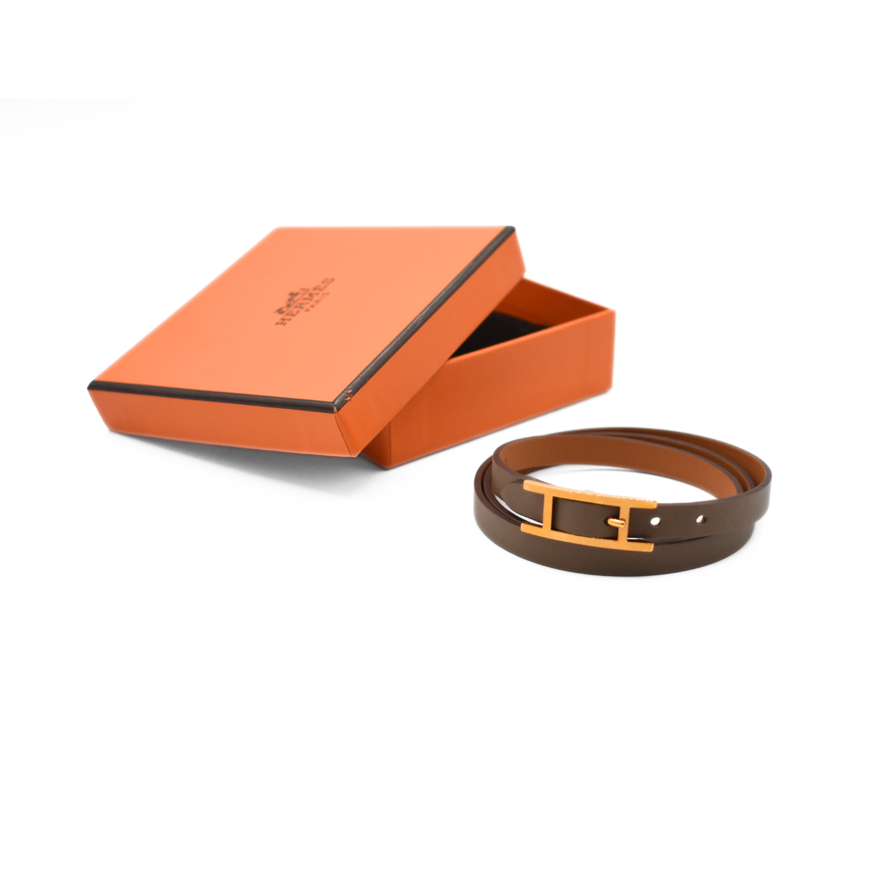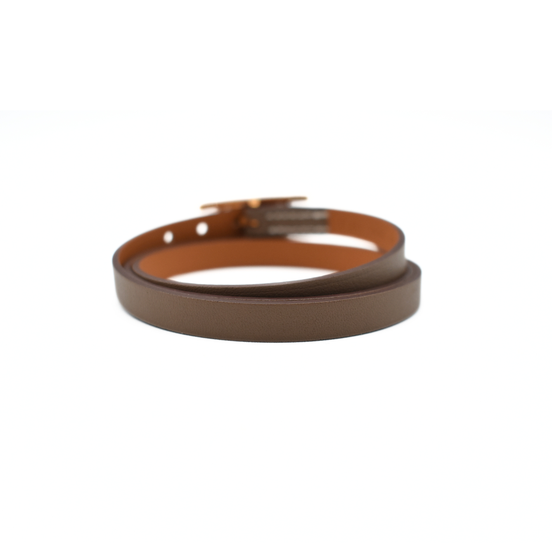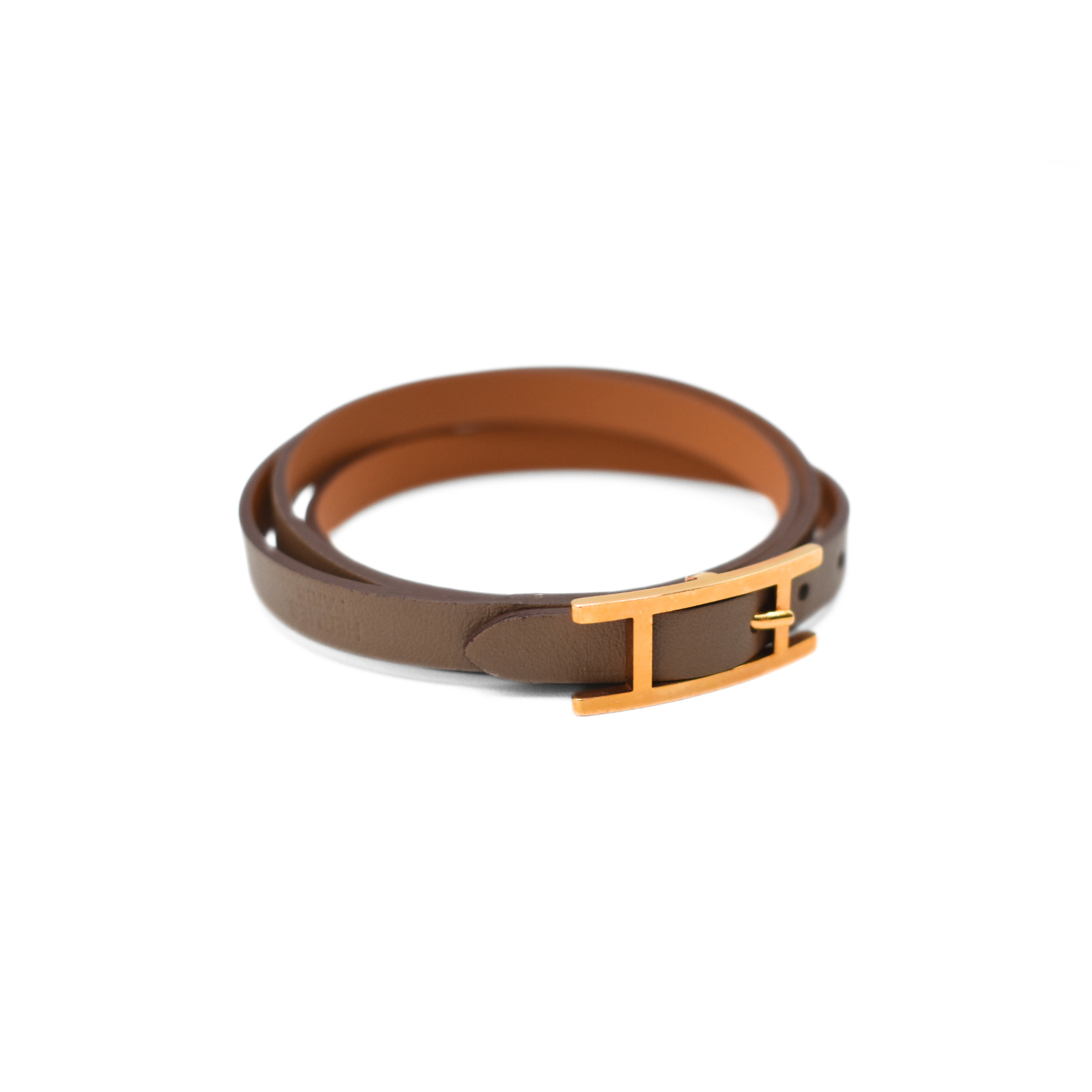 Hermes 'Behapi 3 Tour' bracelet in brown etoupe leather with gold h-buckle hardware.