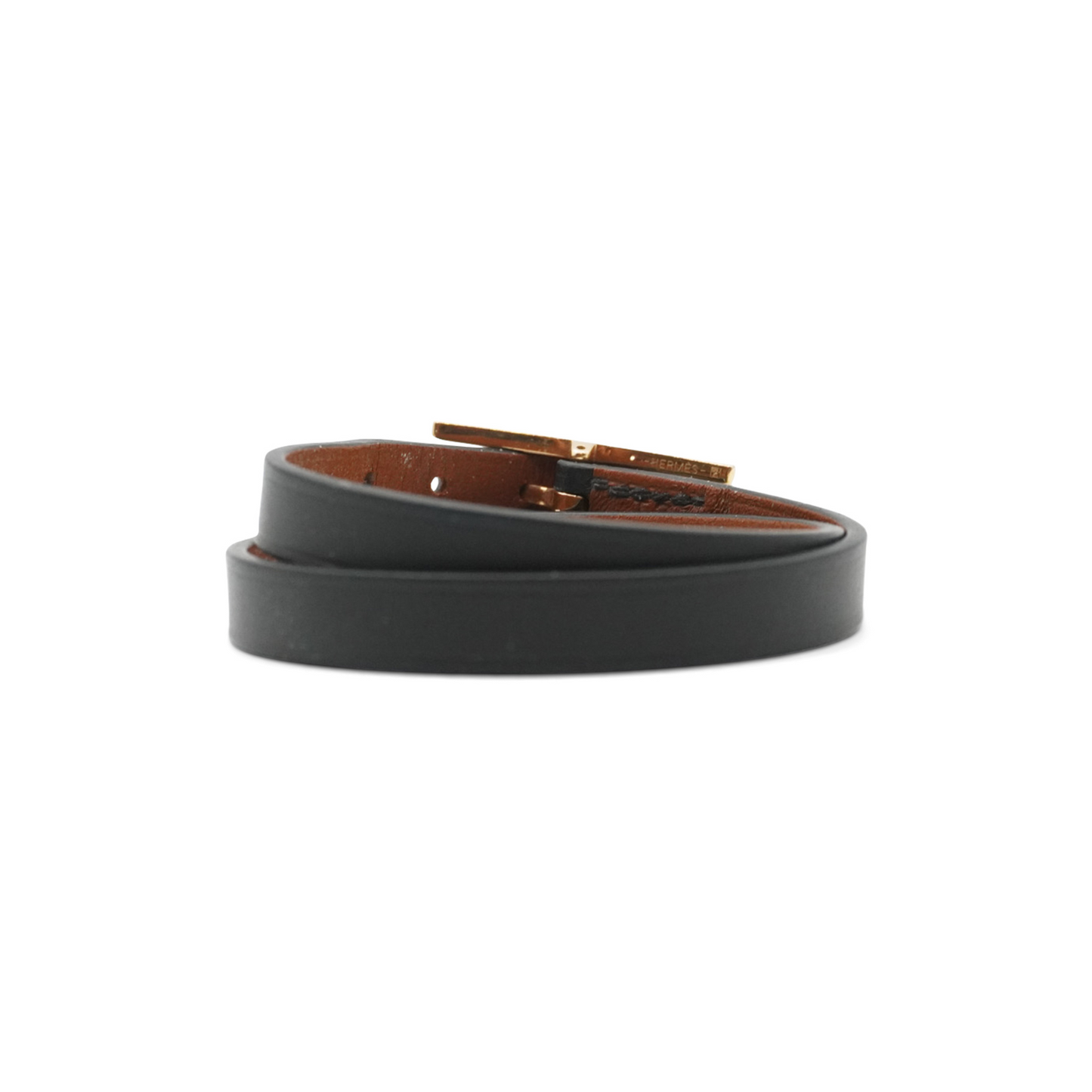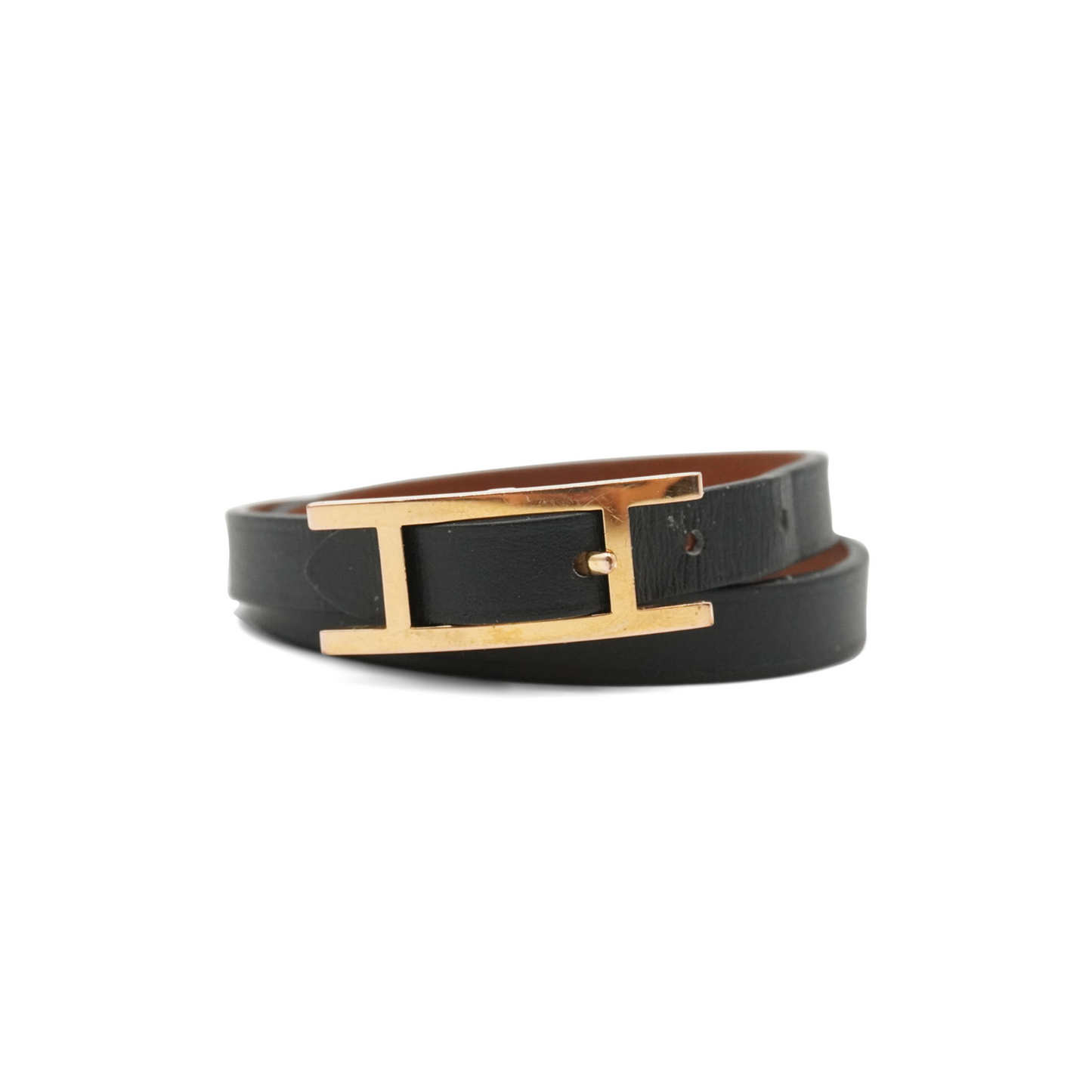 Hermes 'Behapi Double Tour' wrap bracelet in black etoupe leather with gold h-buckle hardware.