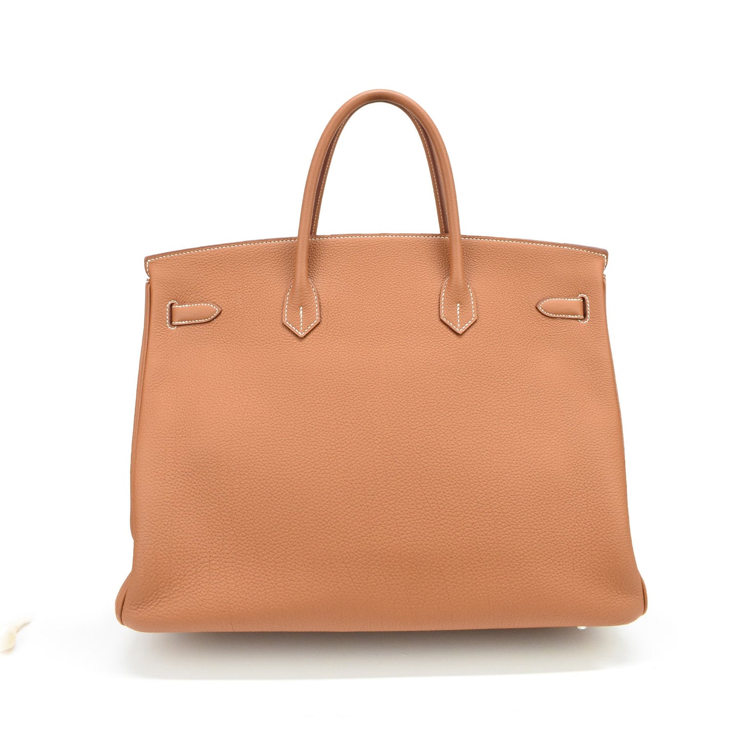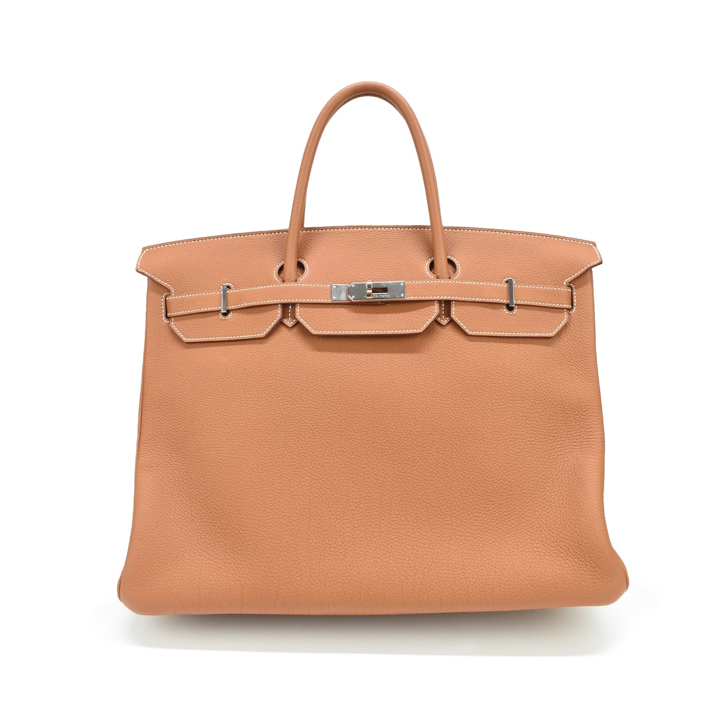 Hermes 'Birkin 40' bag in brown togo leather with white top stitching, rolled leather top handles, a top flap opening and a twist lock closure in palladium hardware. The interior is lined with tonal biscuit leather and has a flat zip pocket.