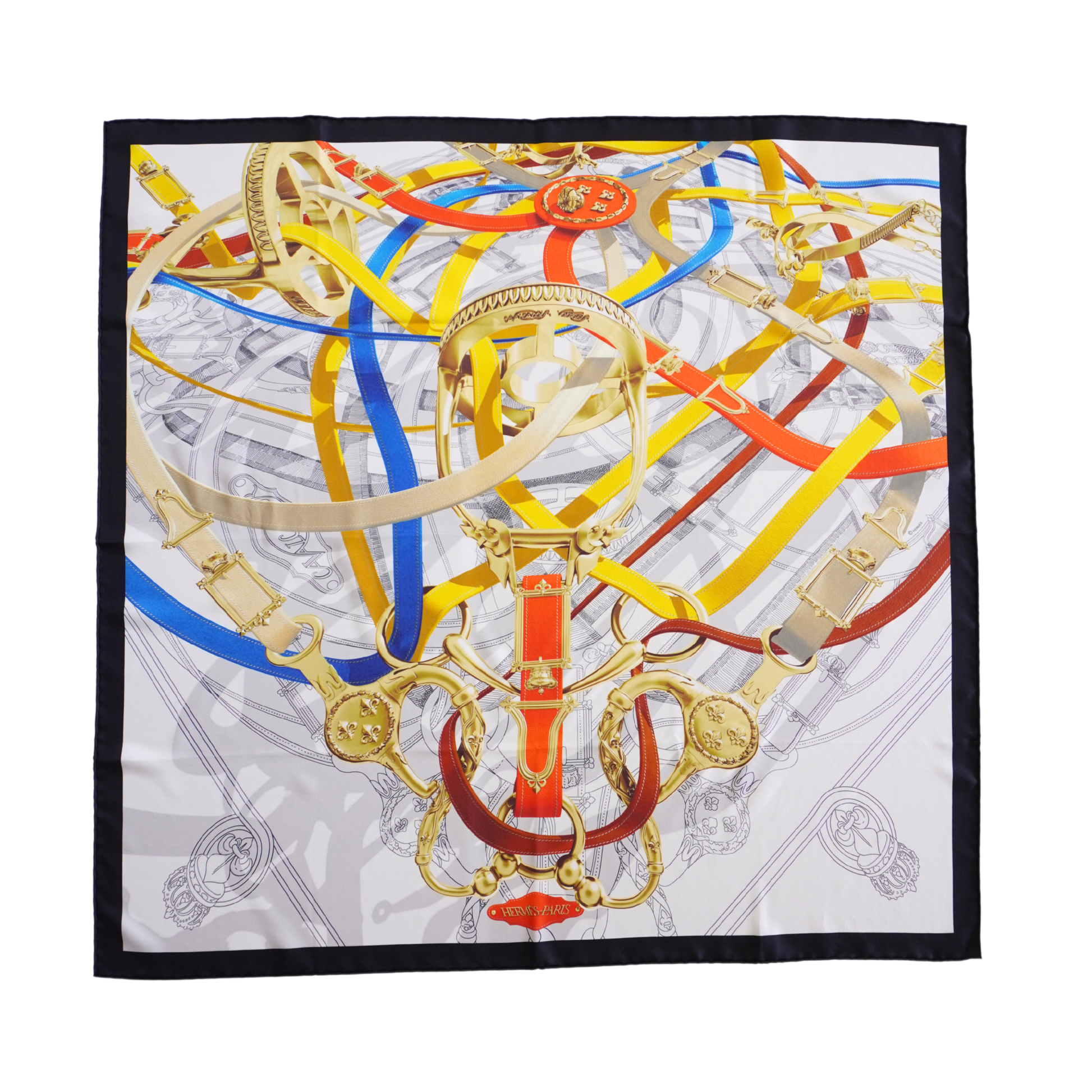 Hermes 'Caval Cadour Voltigeur' scarf in cream silk with a black trim and a large red, blue, yellow and gold ribbon and hardware print.
