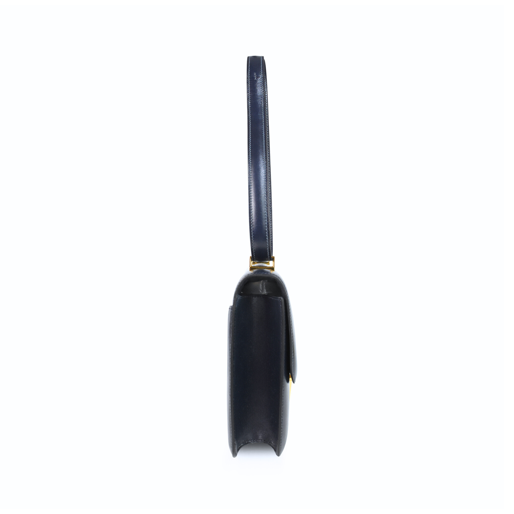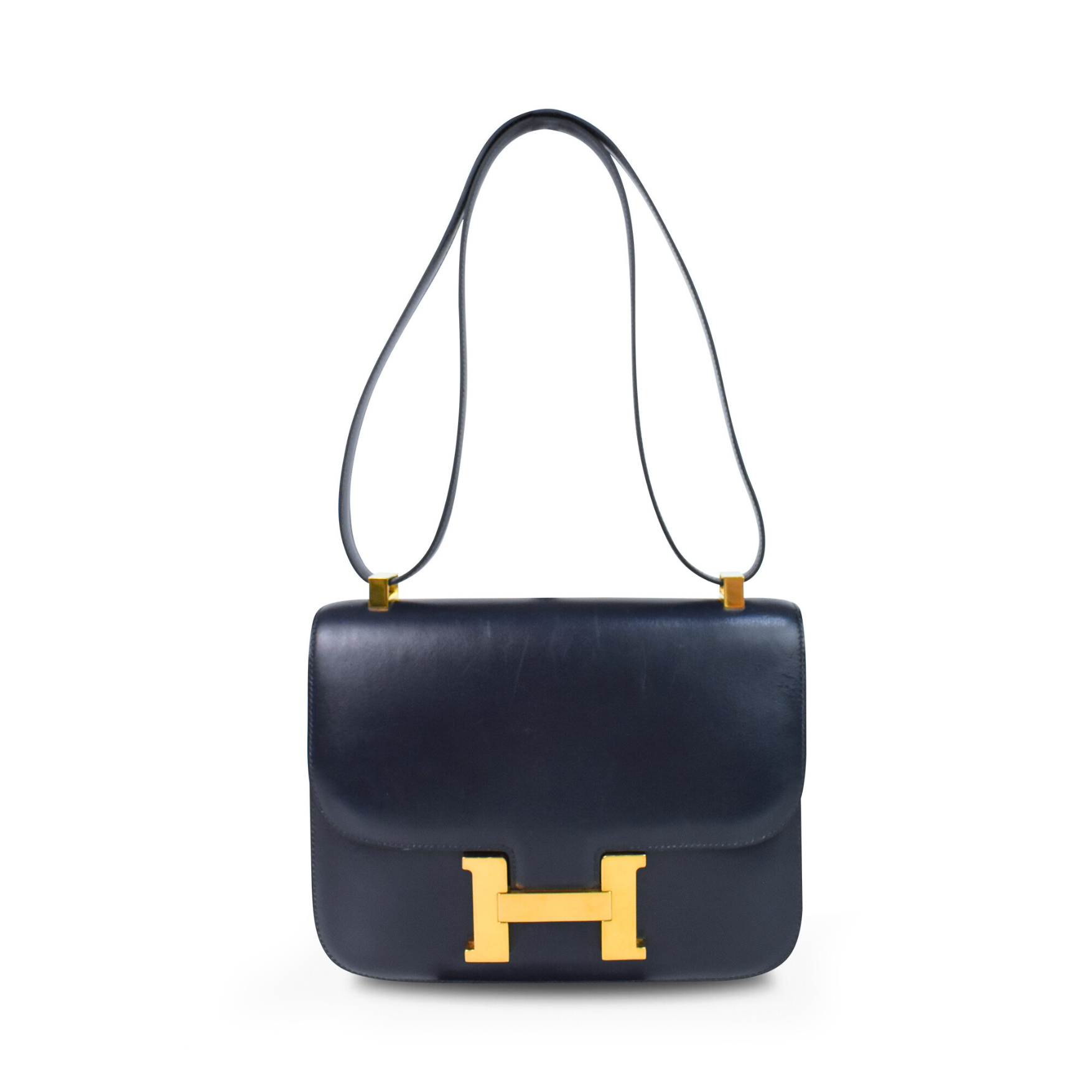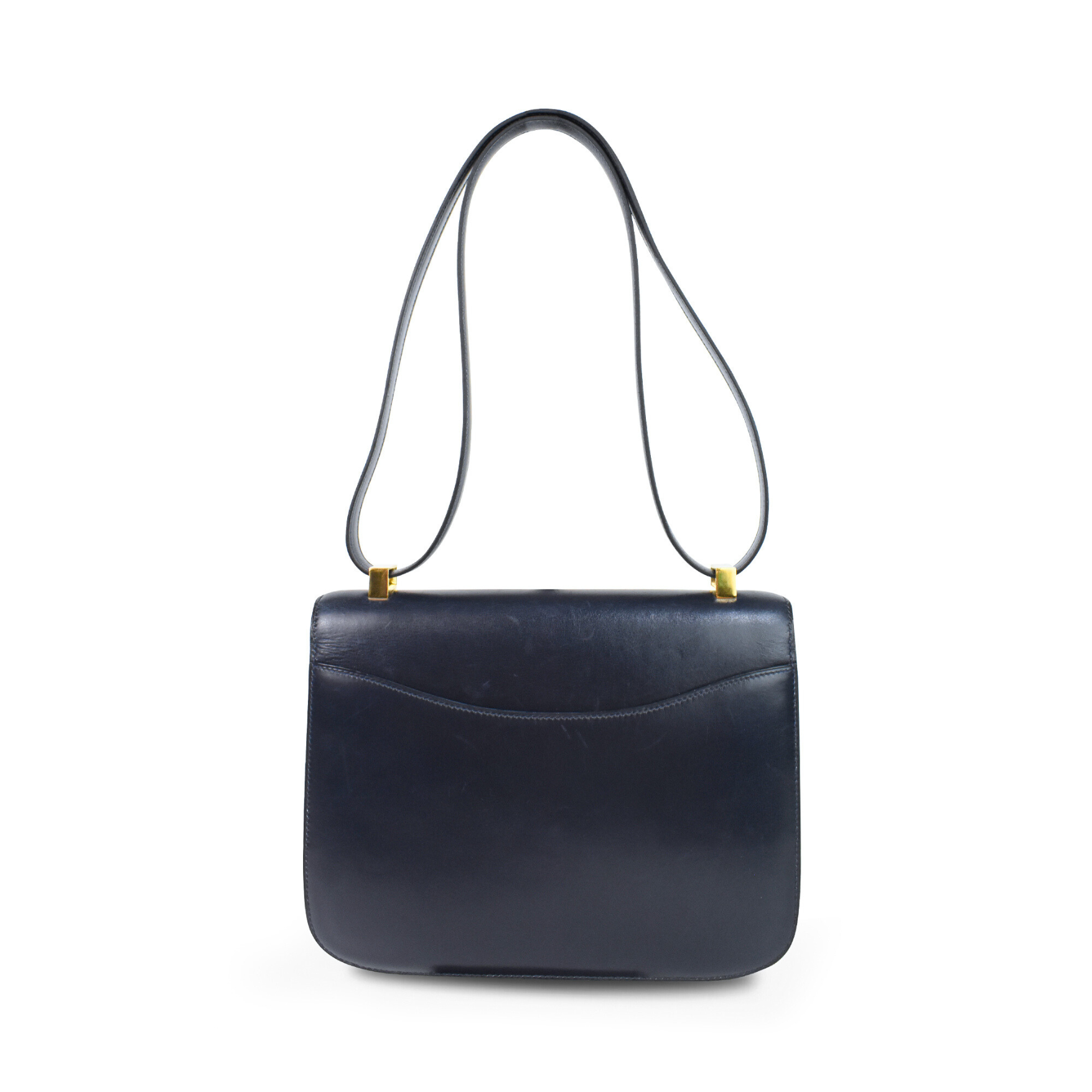 Hermes 'Constance 24' shoulder bag in dark navy leather with an adjustable shoulder strap, a back slip pocket, and a large gold 'H' clasp on the front. The bag has a top flap opening revealing a leather interior with a zip pocket.