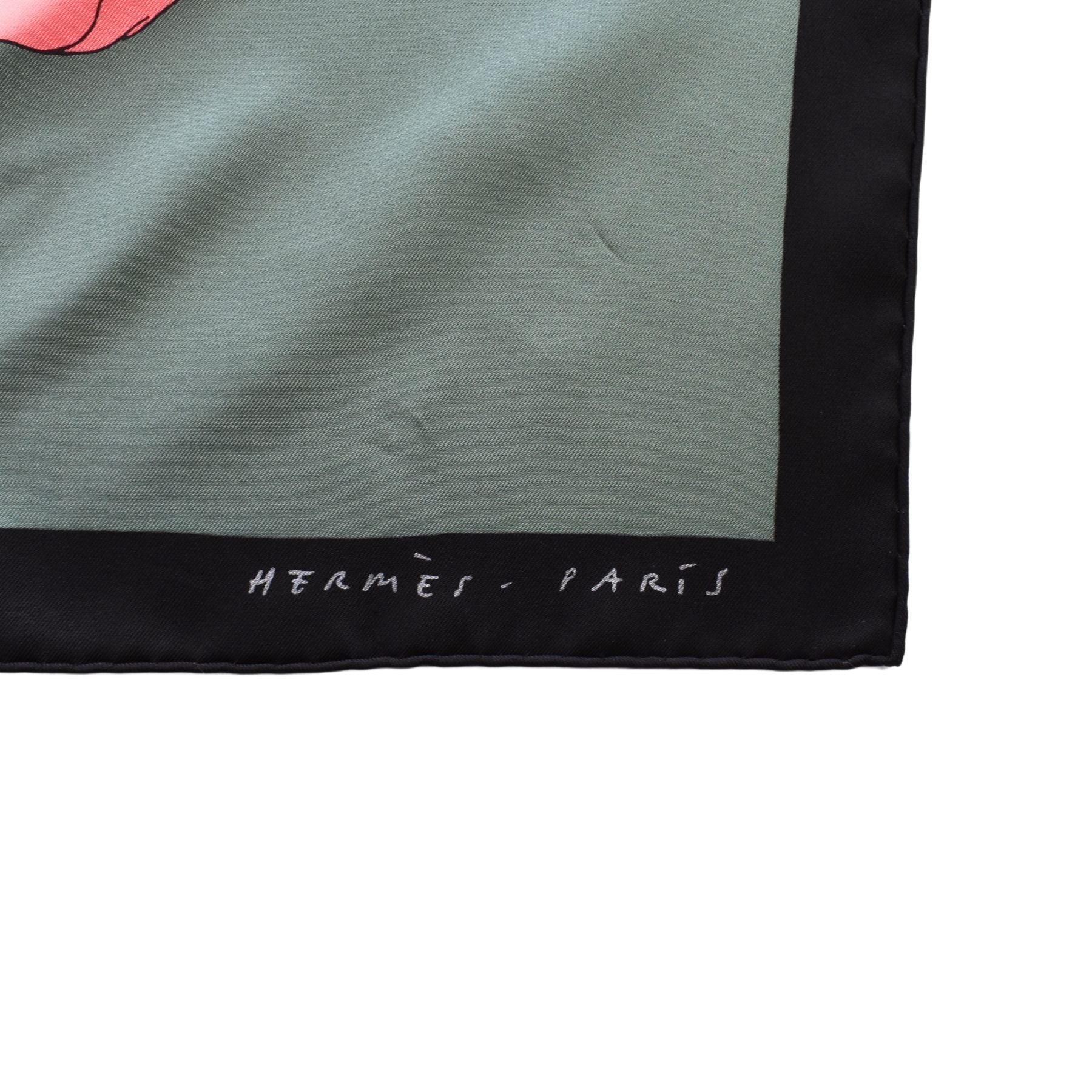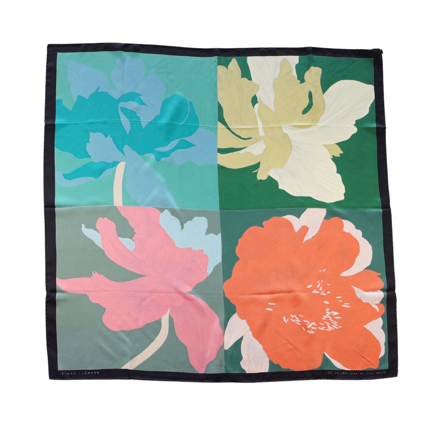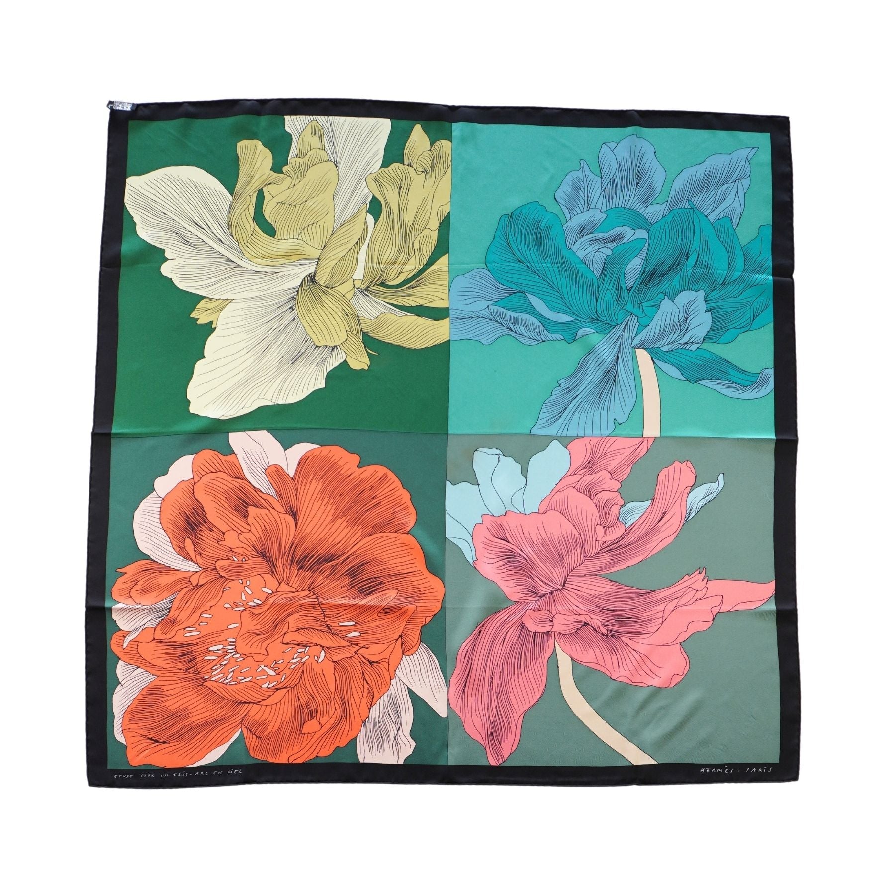 Hermes 'Etudes Pour Un Iris - Arc En Ciel' silk scarf with four brightly coloured iris graphics and an black trim. Designed by Benoît-Pierre Emery and released in 2017.