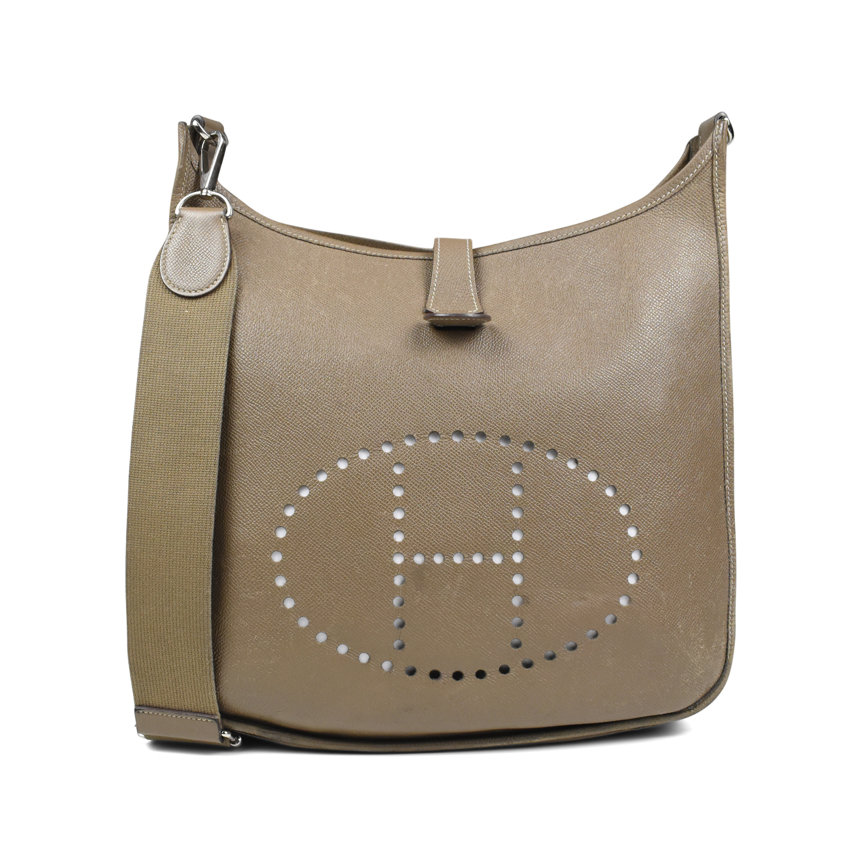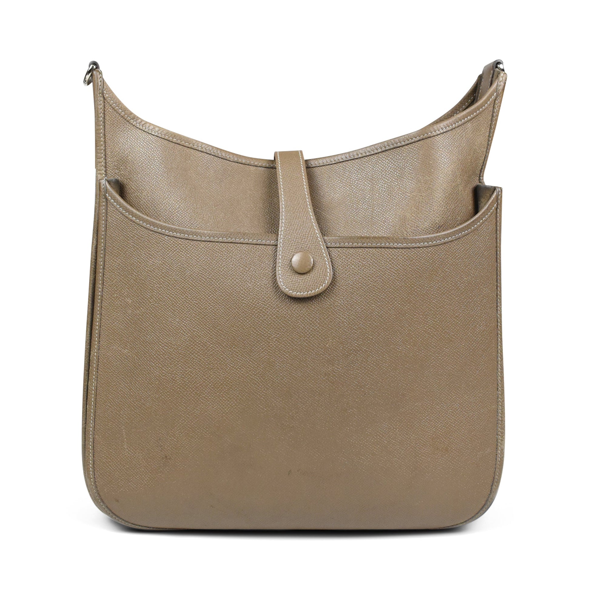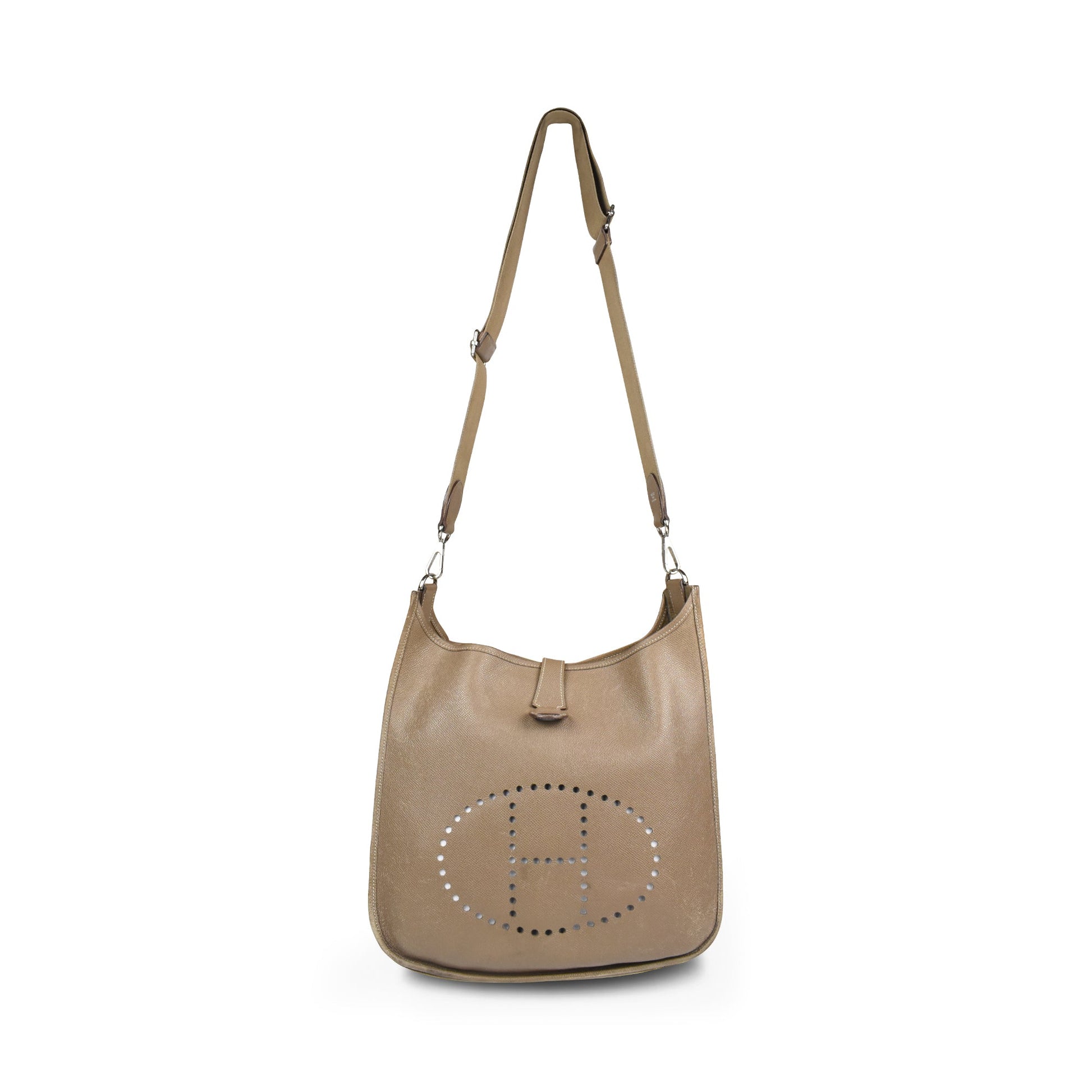 Hermes 'Evelyne 29' saddle bag in taupe epsom leather with a perforated H logo on the front and slip pocket on the back. Features a leather tab closure with snap button and a removable and adjustable canvas crossbody strap with palladium hardware. The interior is a raw suede.