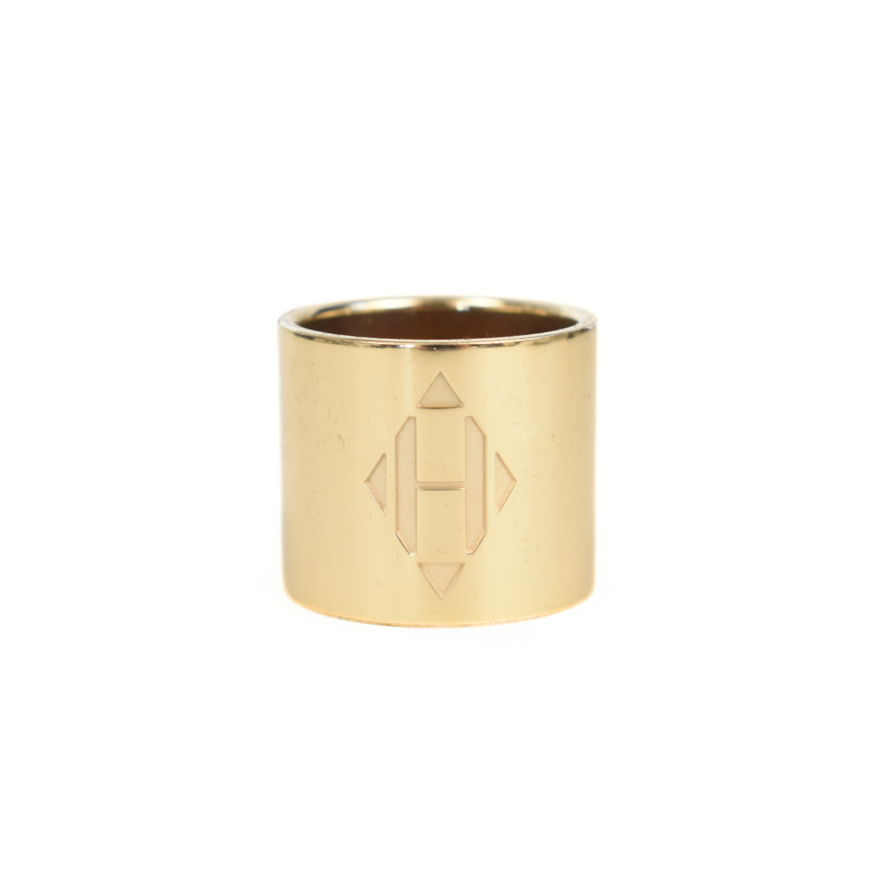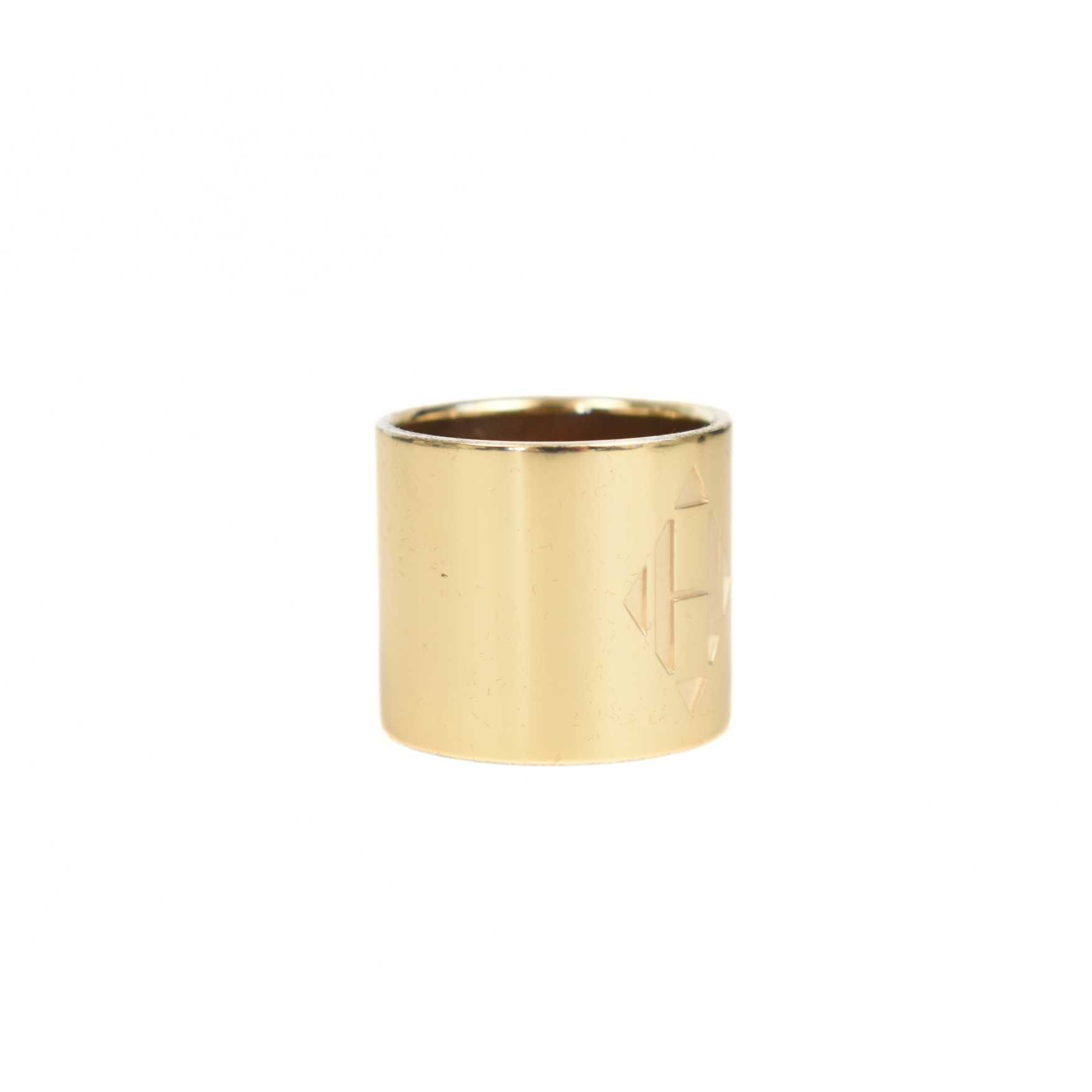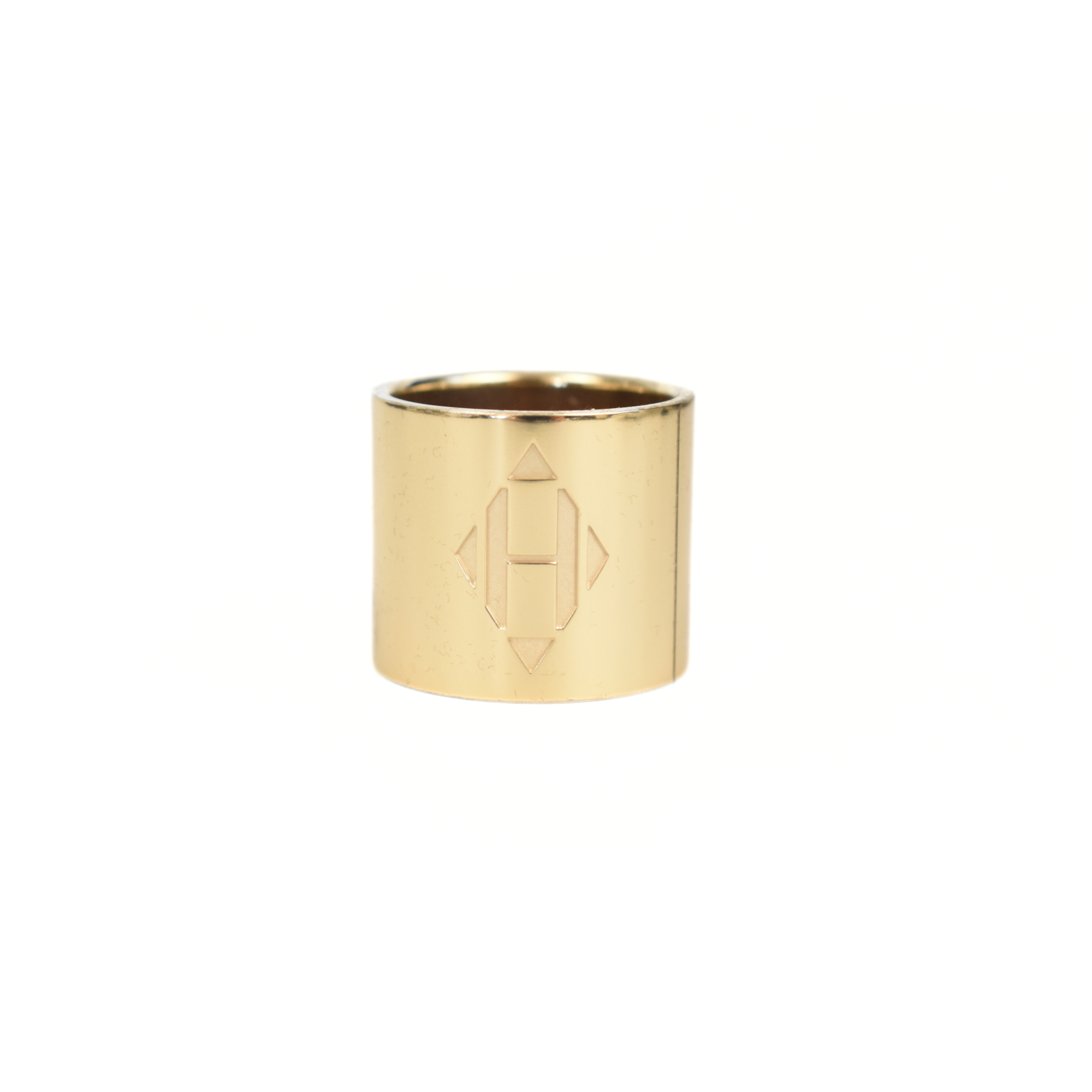 Hermes H' Diamant' scarf ring in gold-tone metal. Features engraved 'H' logo on the front.