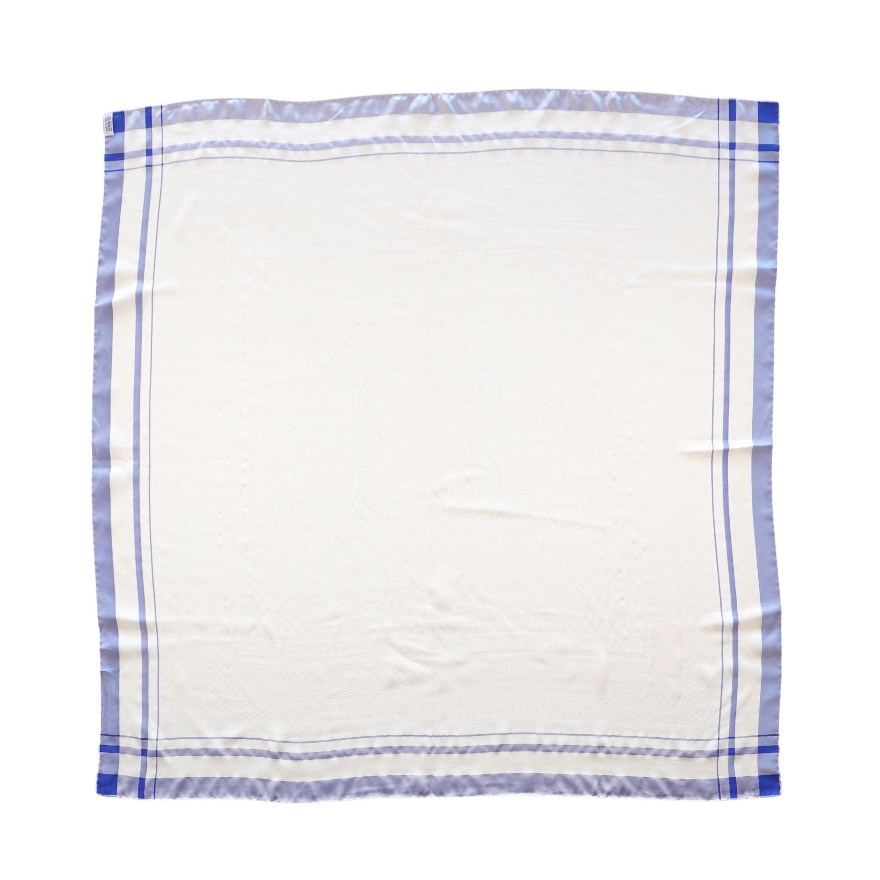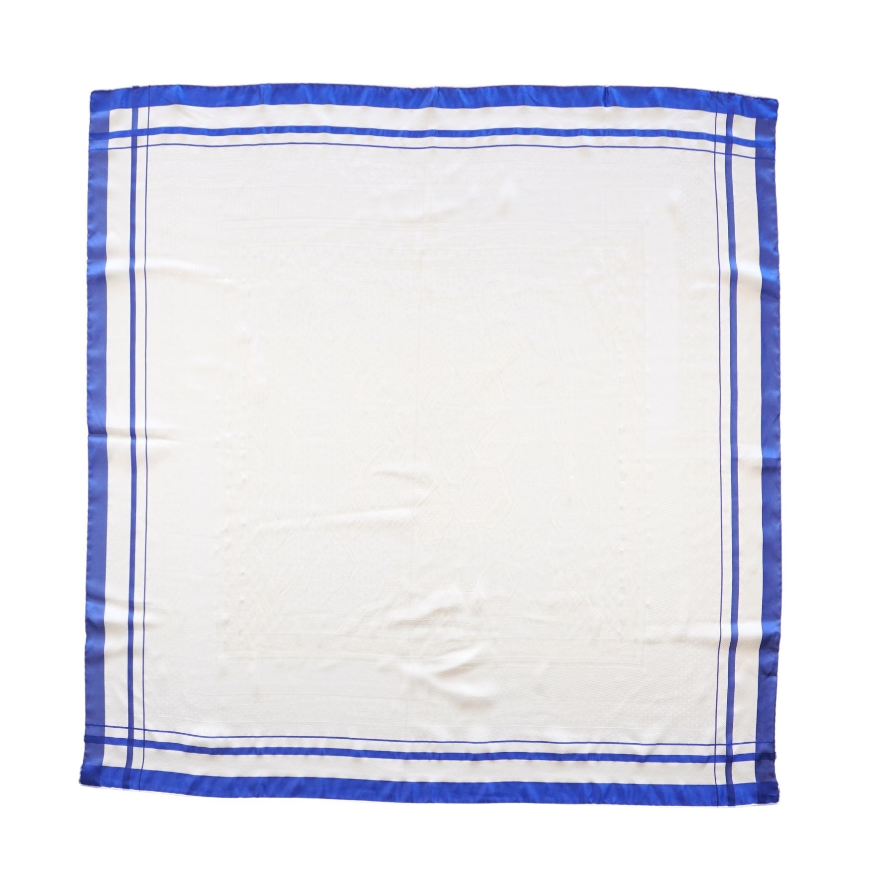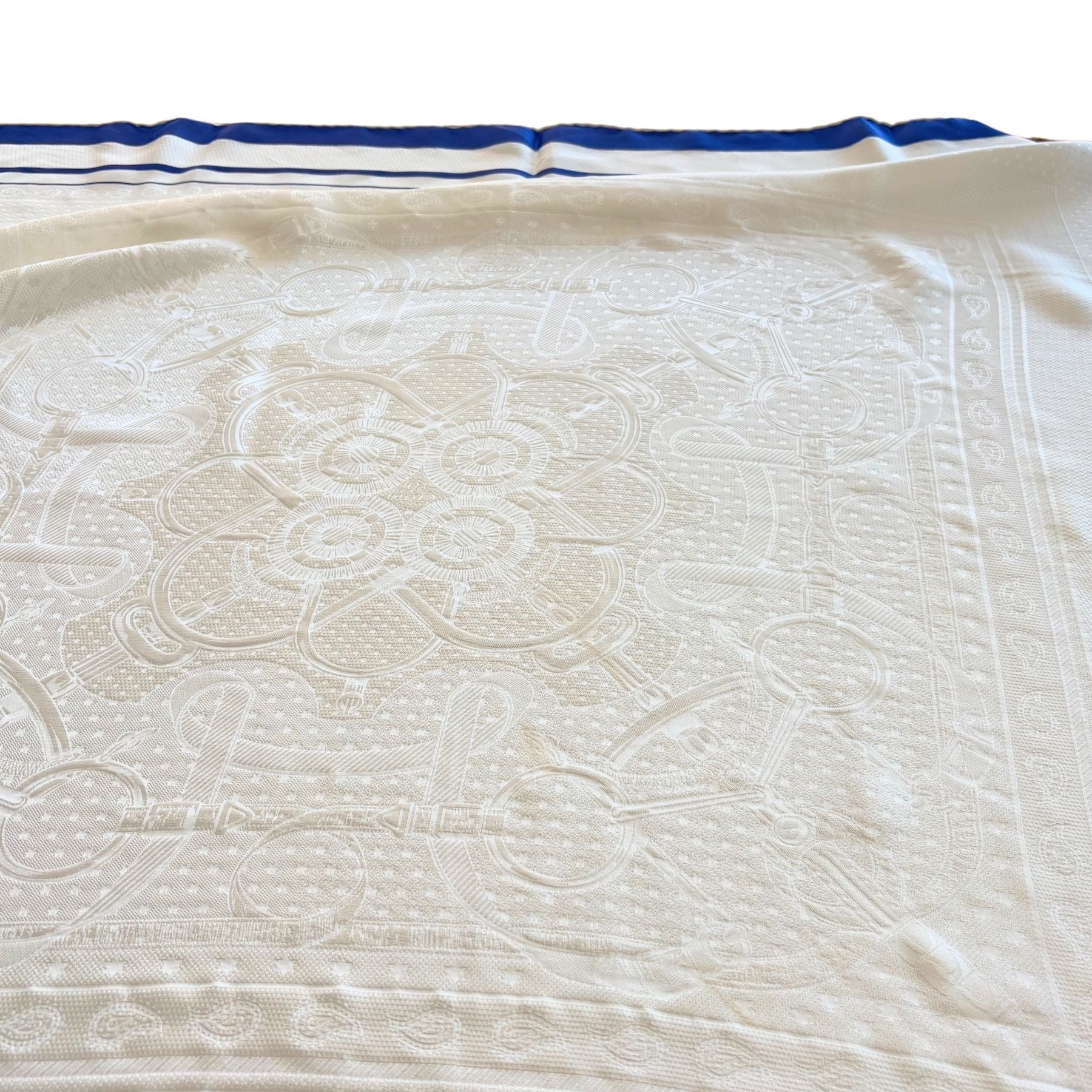 Hermes white silk scarf featuring a buckle and paisley jacquard weave and bright blue border. Includes box.