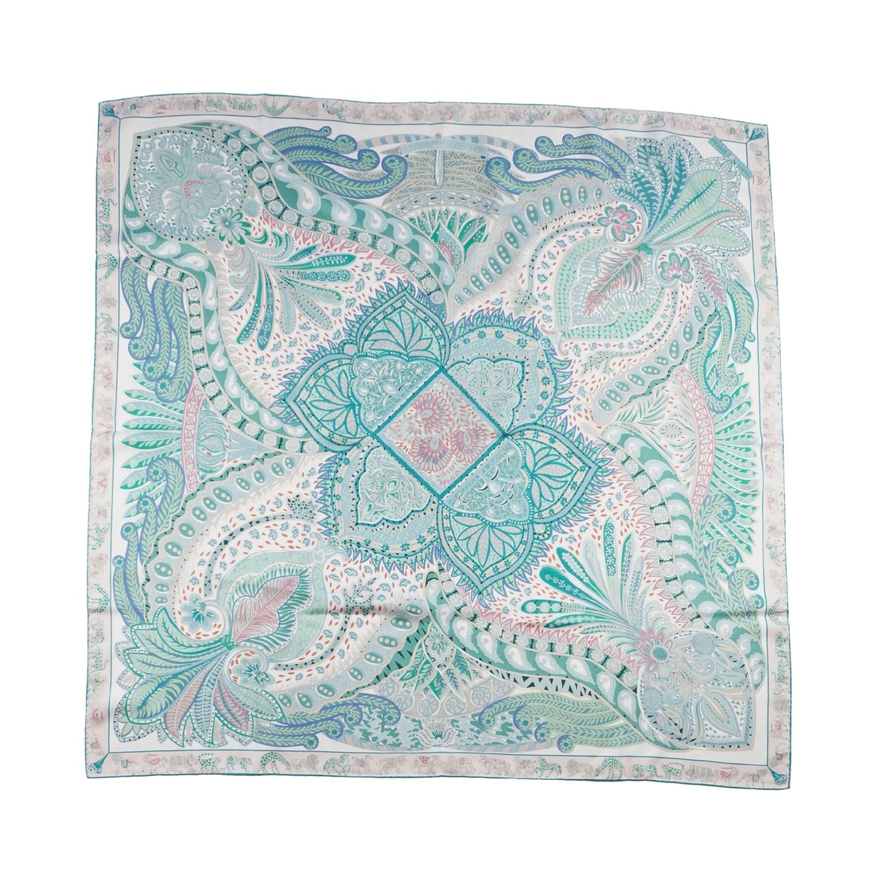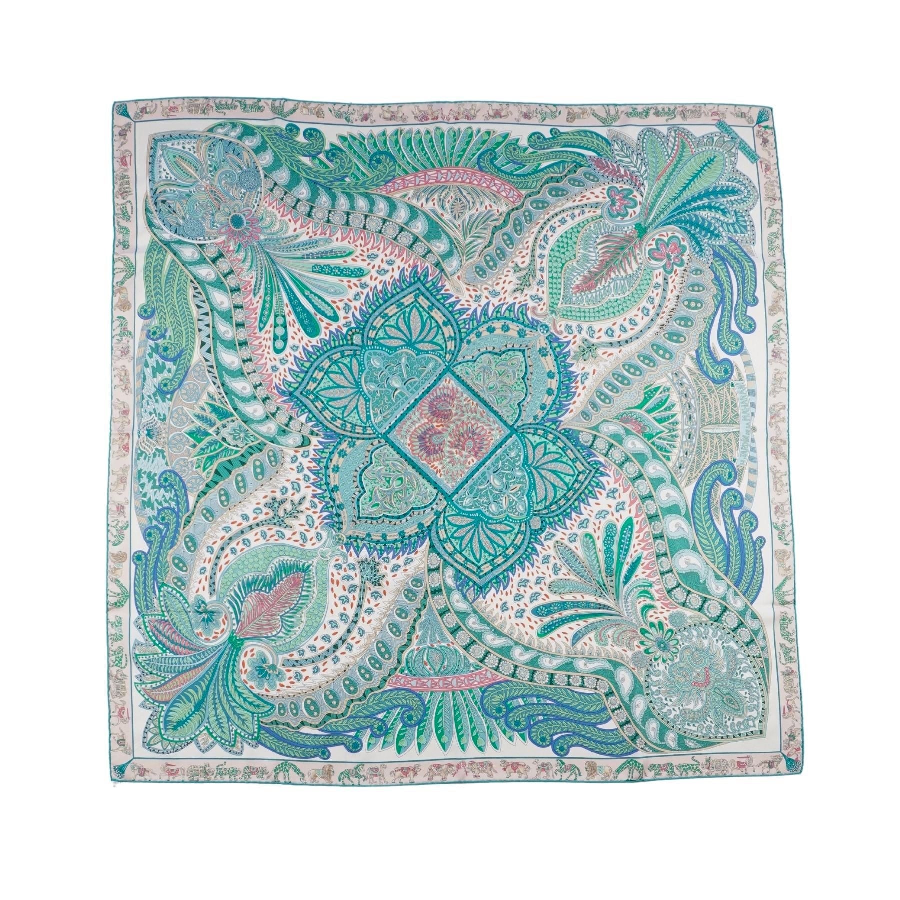 Hermes 'Le Jardin De La Maharani' scarf in turquoise silk with an ornate pink, blue, and white paisley print and an animal parade border. Designed by Annie Faivre and originally released in 2019.