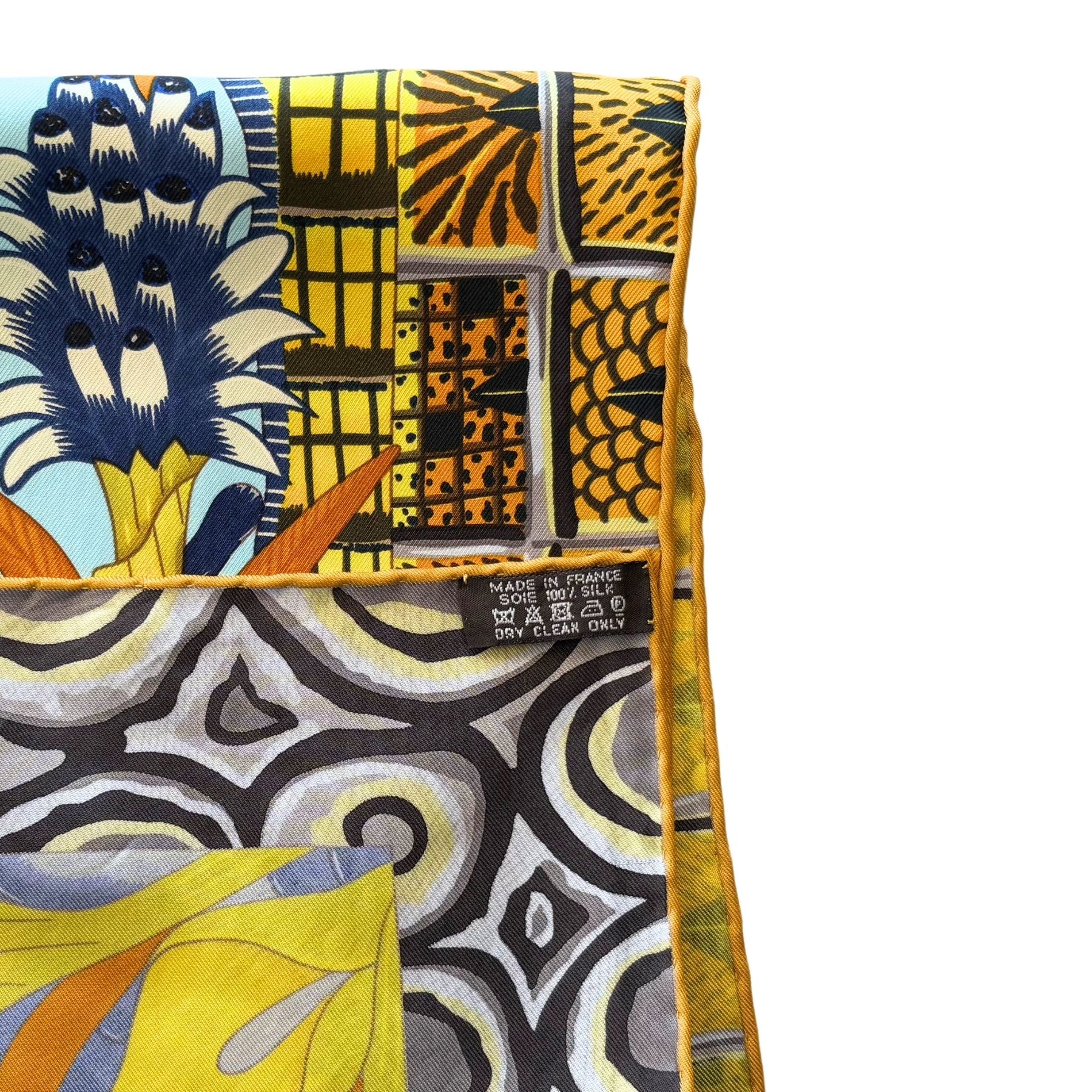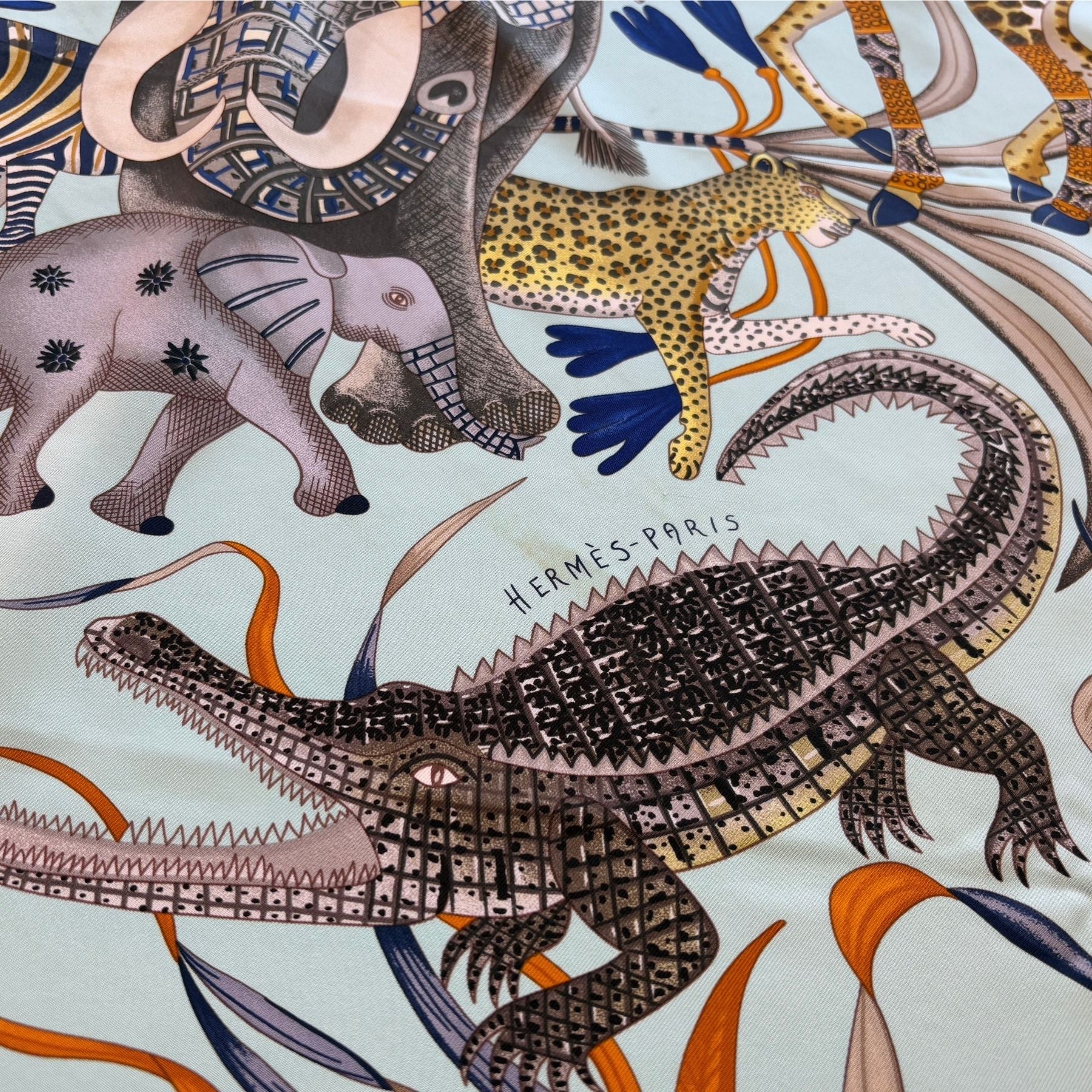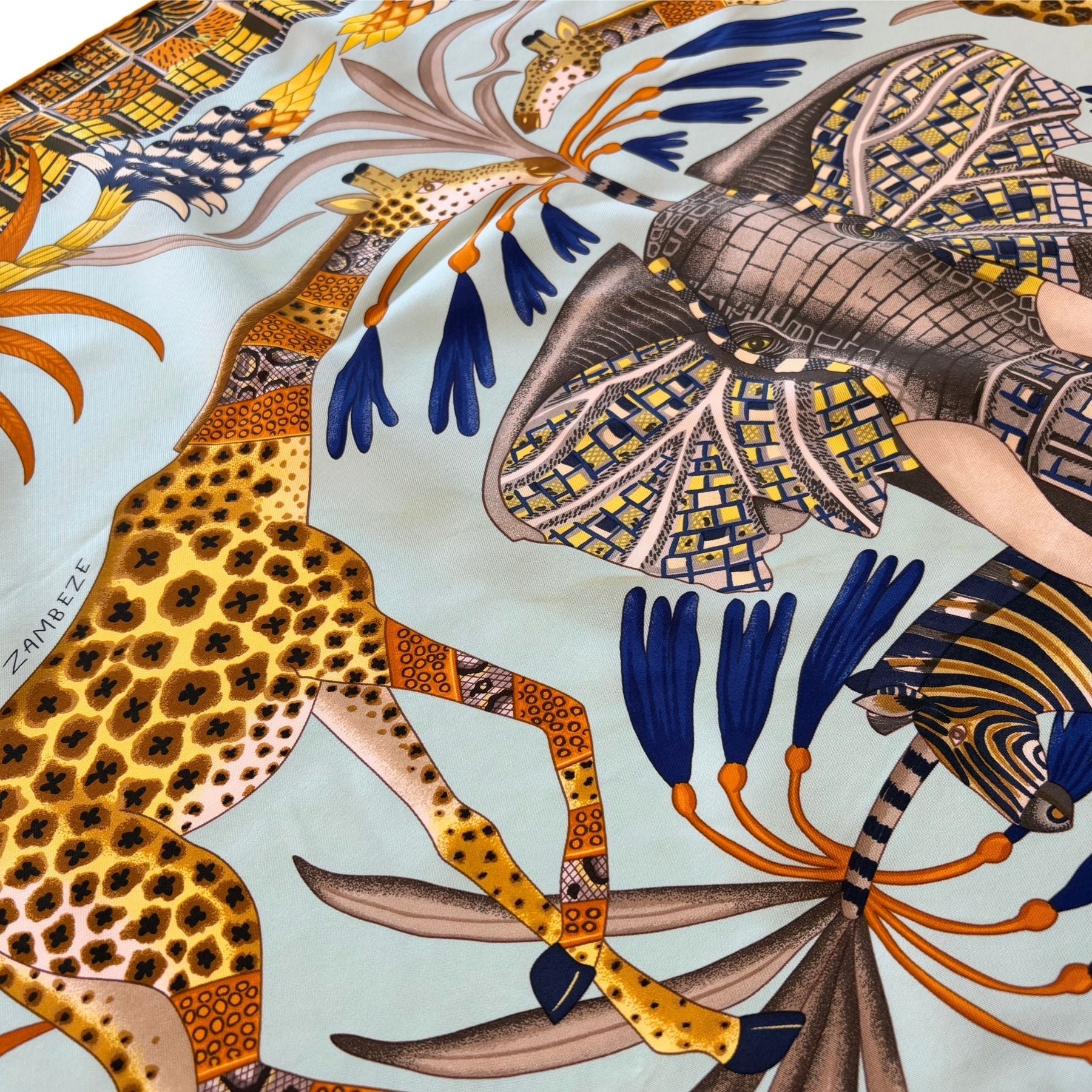 Hermes 'Marche du Zambeze' silk scarf featuring African animals and foliage in a light blue and yellow based colour scheme. Designed by by Ardmore Artists and first released in 2016.
