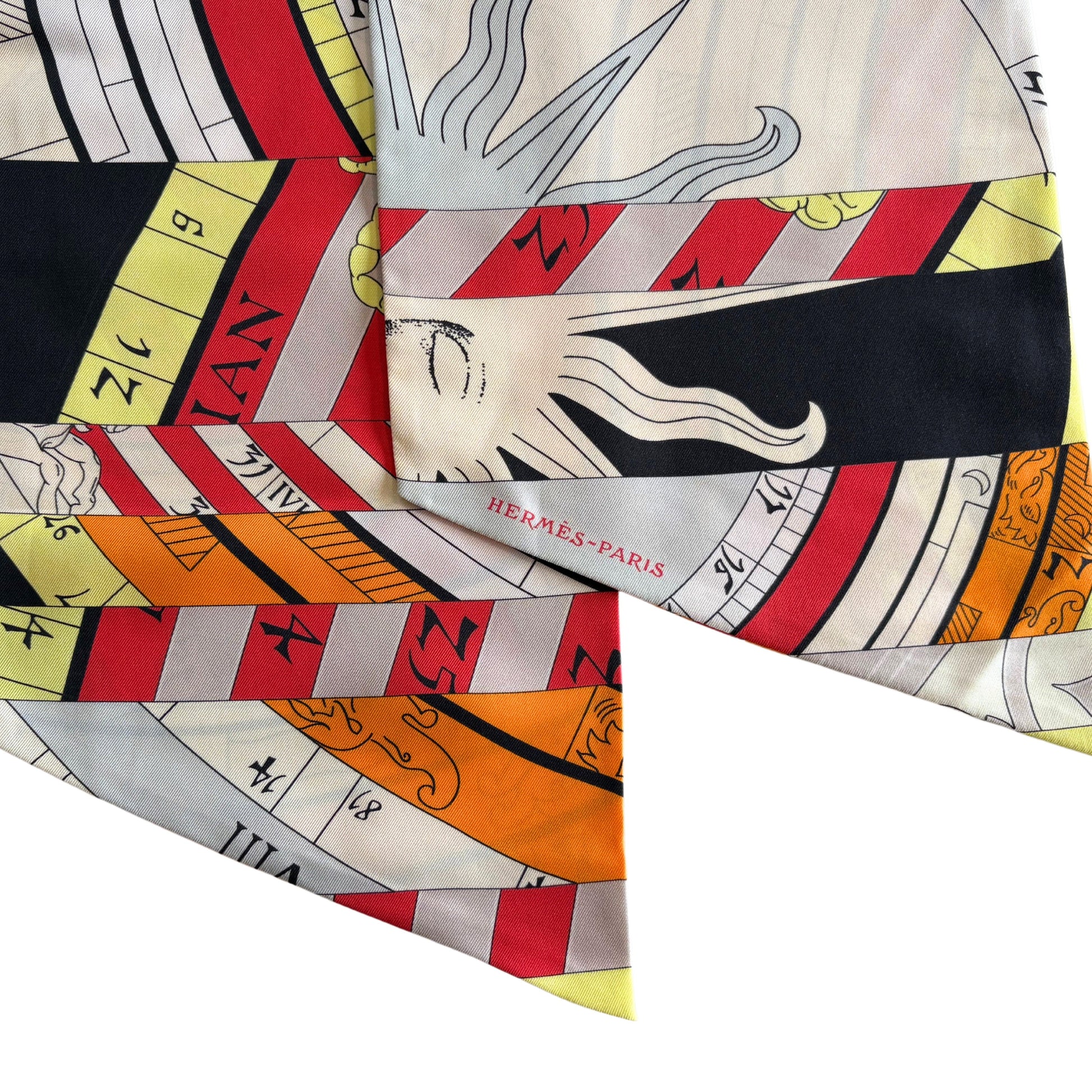 Hermes maxi twilly scarf in red, orange, cream and black silk with an abstract roman numeral and sun print.